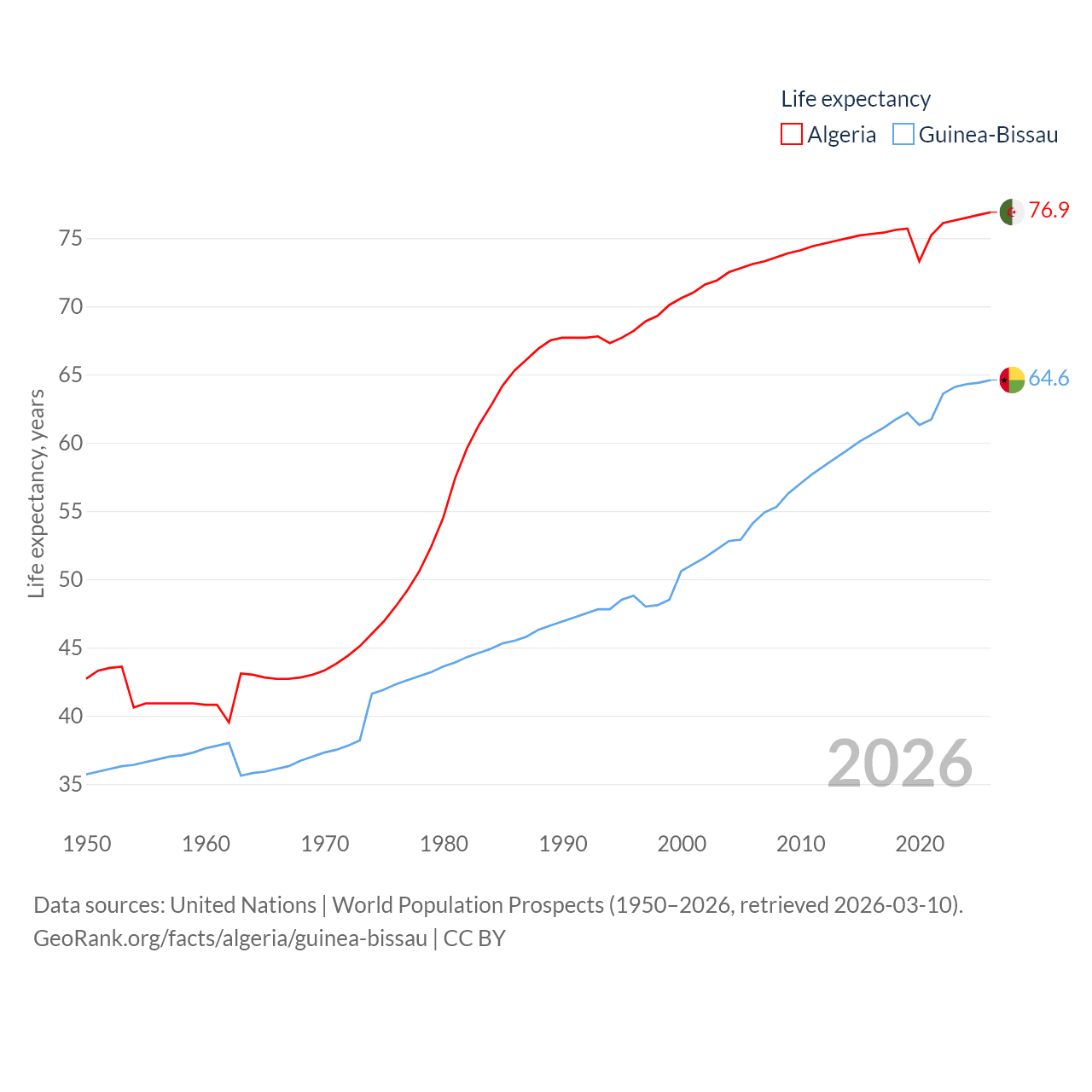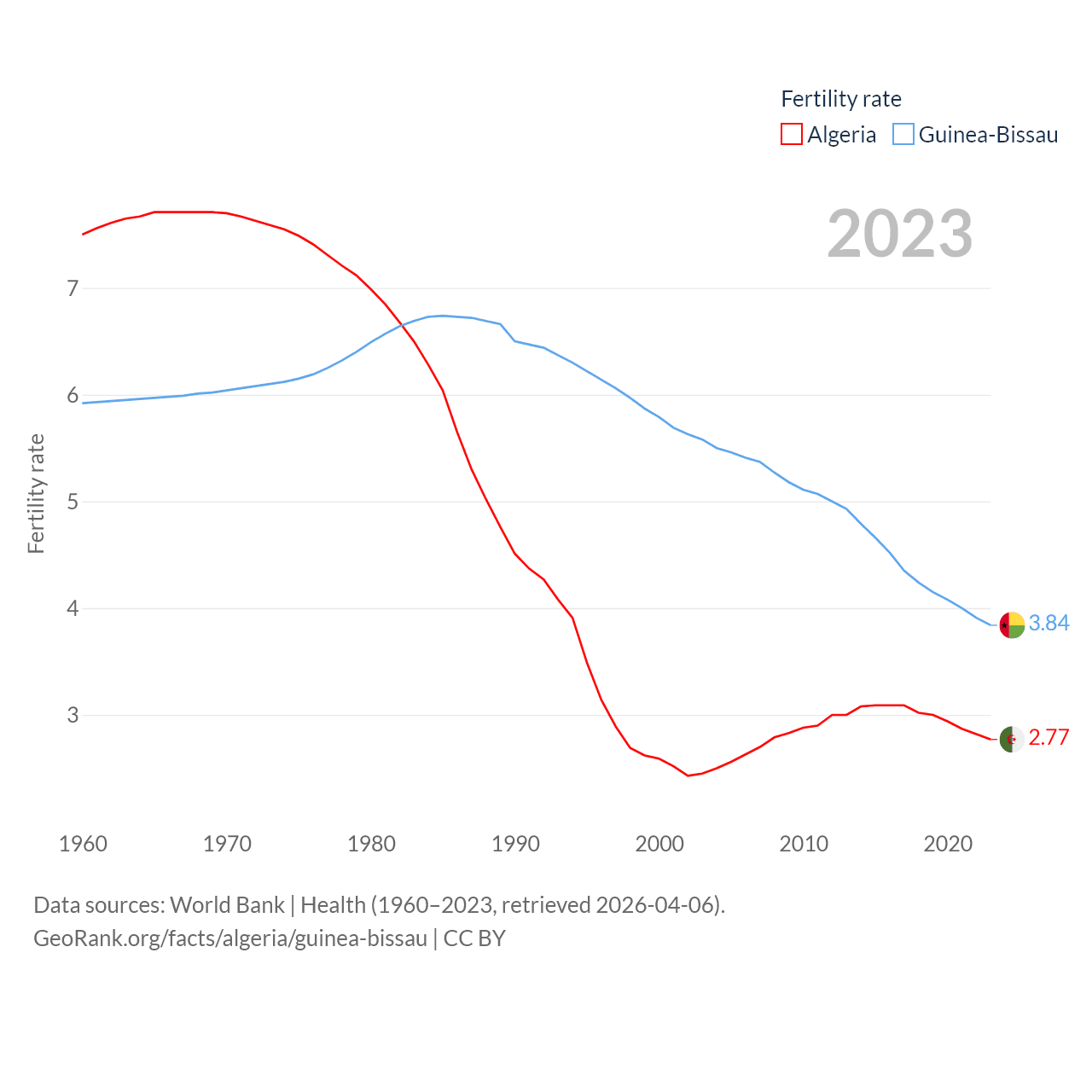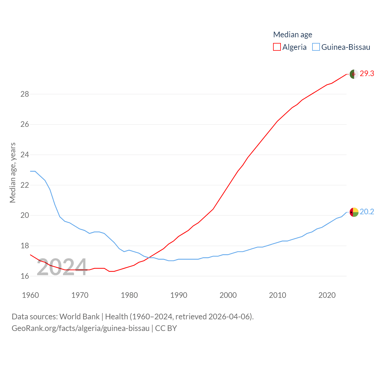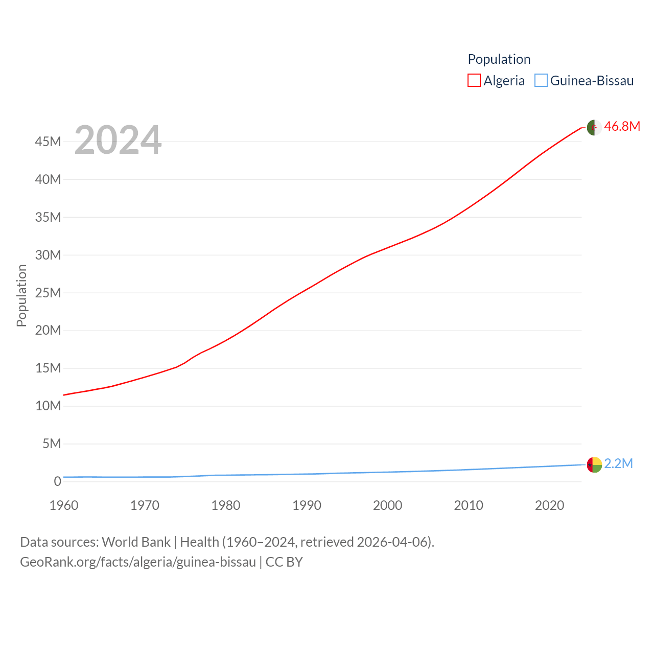 Algeria has a population of 46.8M (ranked 33/197), compared with 2.2M in Guinea-Bissau (ranked 146/197). Algeria's land area is 919,595 sq mi versus 10,857 sq mi for Guinea-Bissau (ranked 10th vs. 139th).