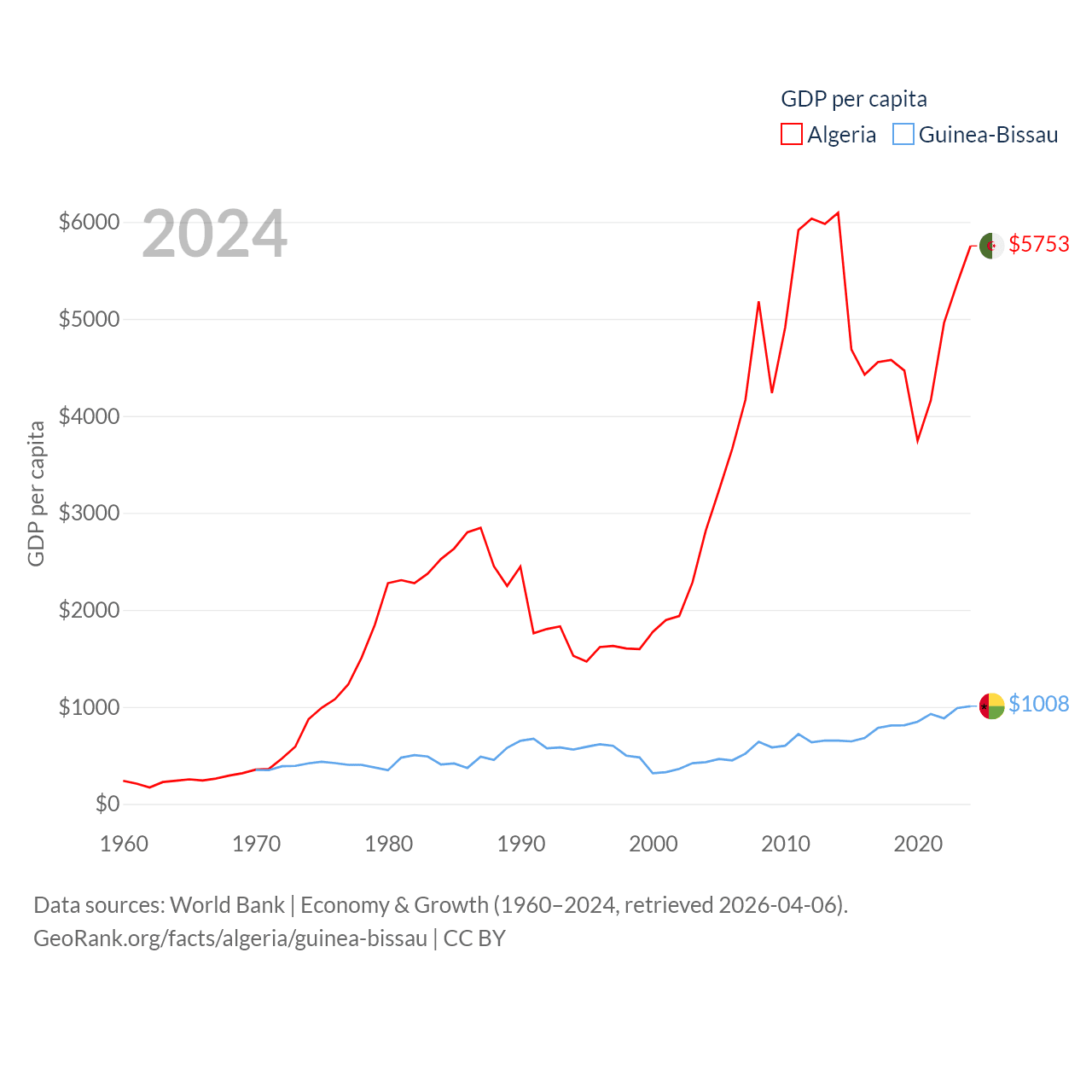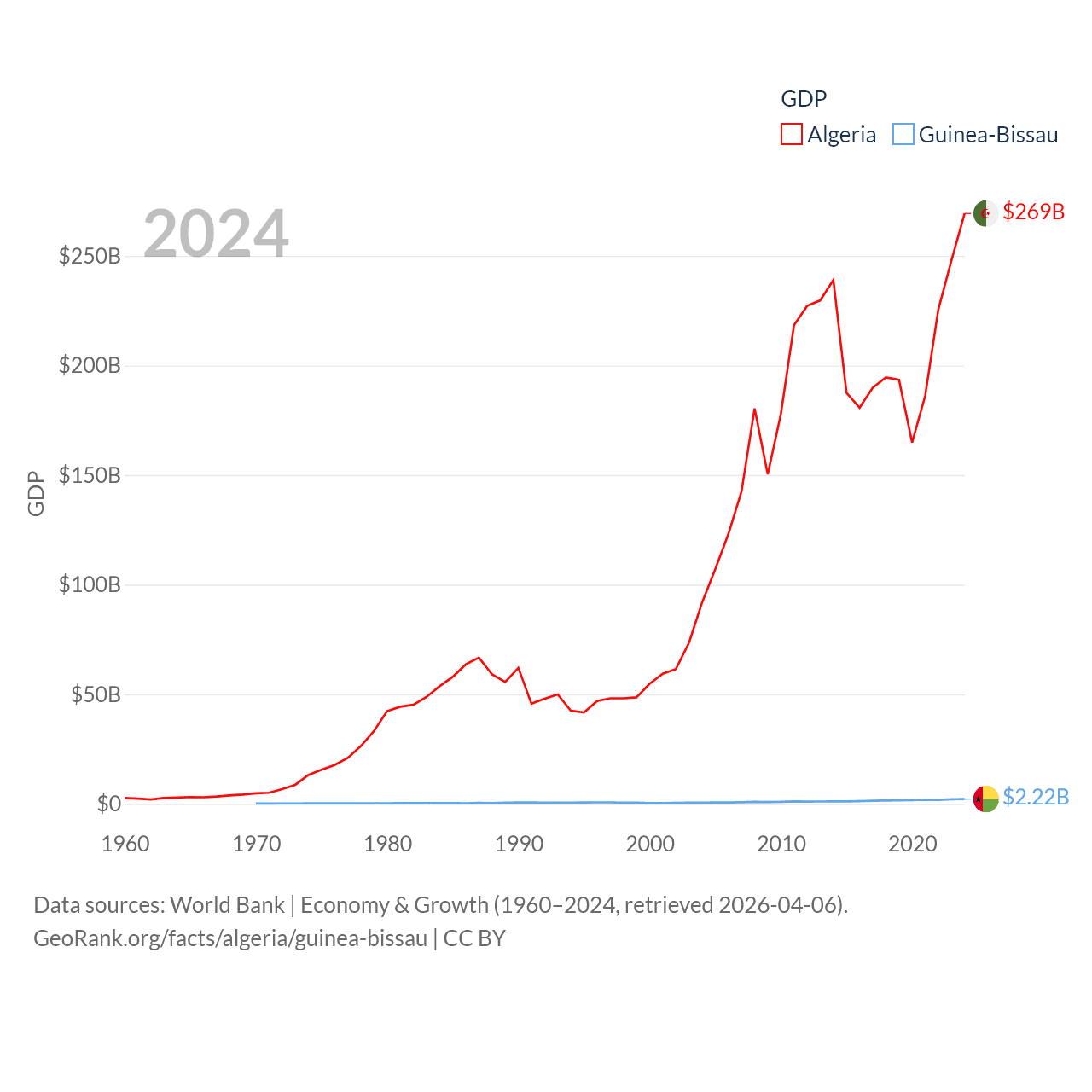 By GDP, Algeria ranks 51/197 ($269B) and Guinea-Bissau ranks 176/197 ($2.22B). By GDP per capita, Algeria ranks 114/197 ($5,753), while Guinea-Bissau ranks 177/197 ($1,008).