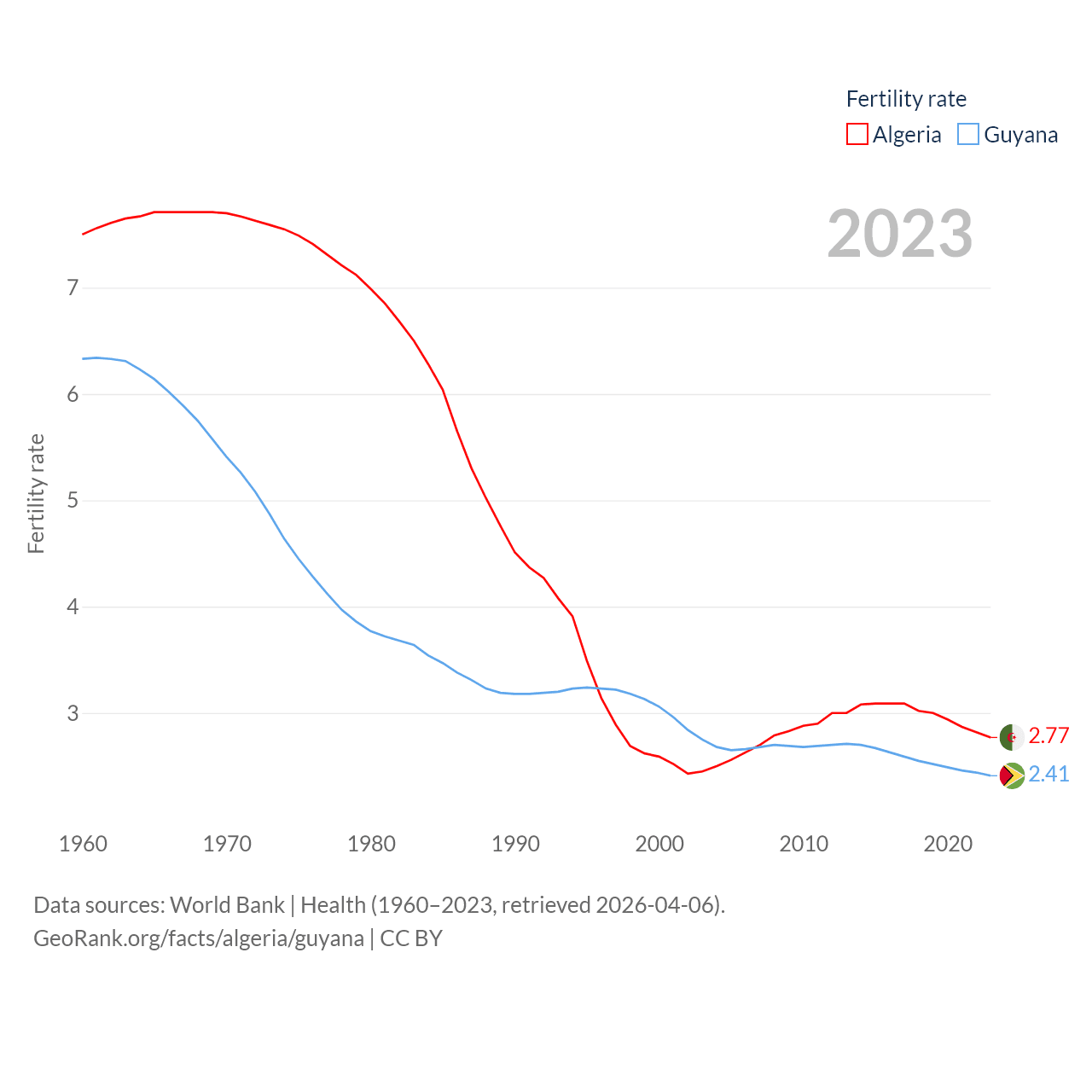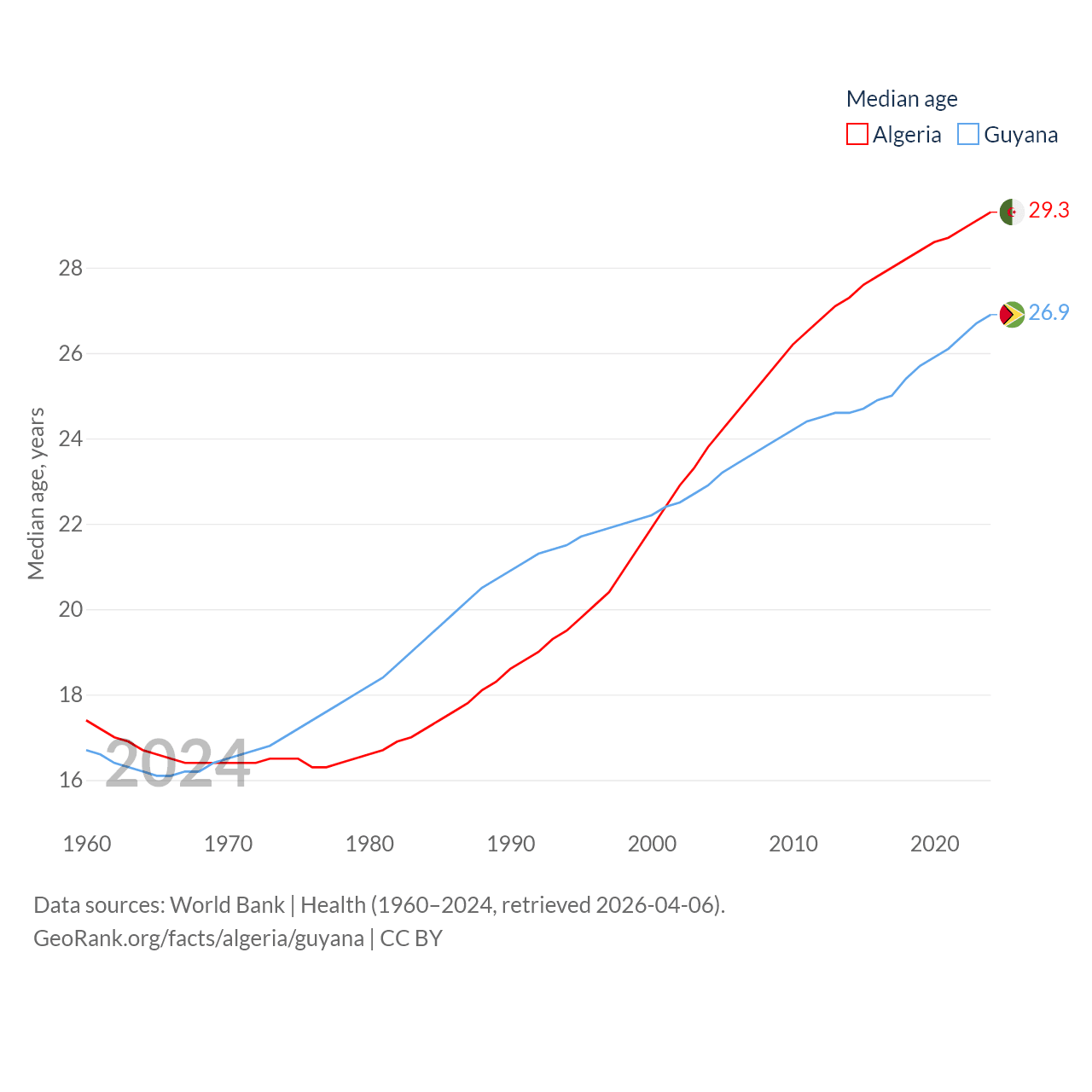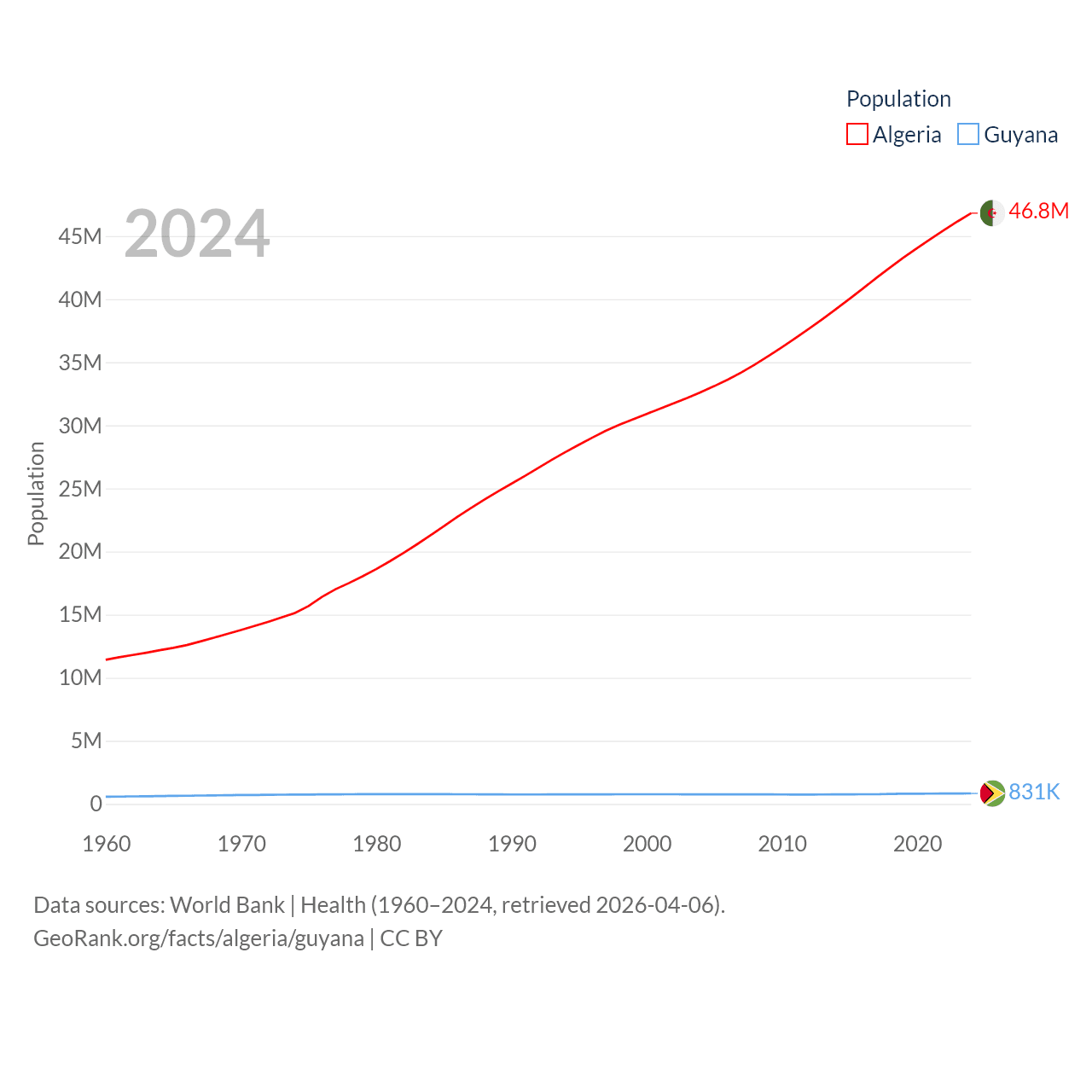 Algeria has a population of 46.8M (ranked 33/197), compared with 831K in Guyana (ranked 161/197). Algeria's land area is 919,595 sq mi versus 81,522 sq mi for Guyana (ranked 10th vs. 82nd).