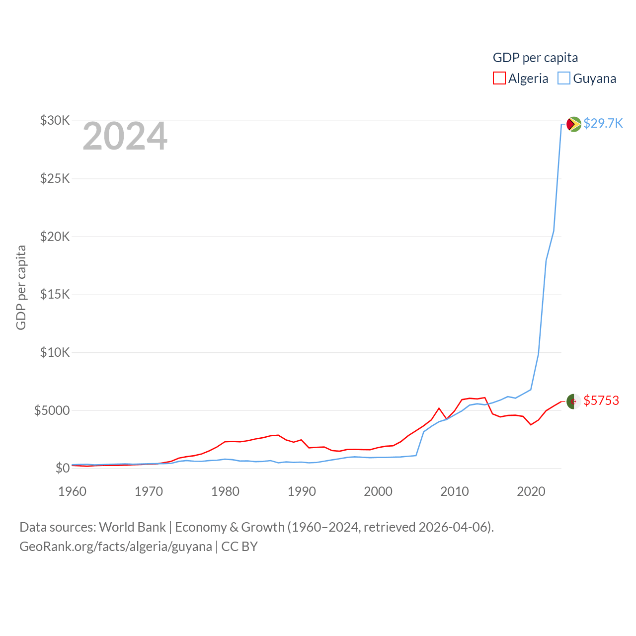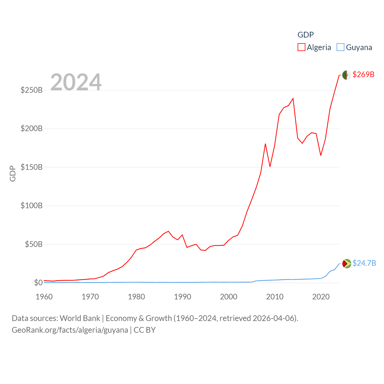 By GDP, Algeria ranks 51/197 ($269B) and Guyana ranks 120/197 ($24.7B). By GDP per capita, Algeria ranks 114/197 ($5,753), while Guyana ranks 41/197 ($29,675).