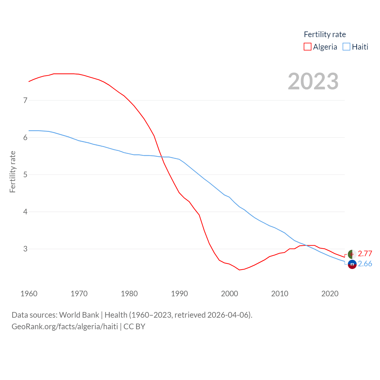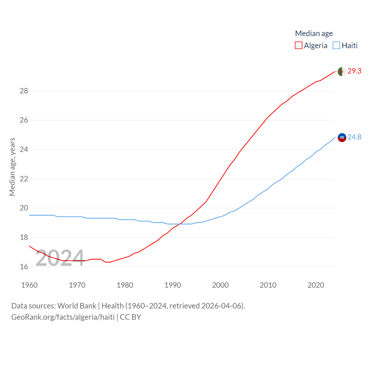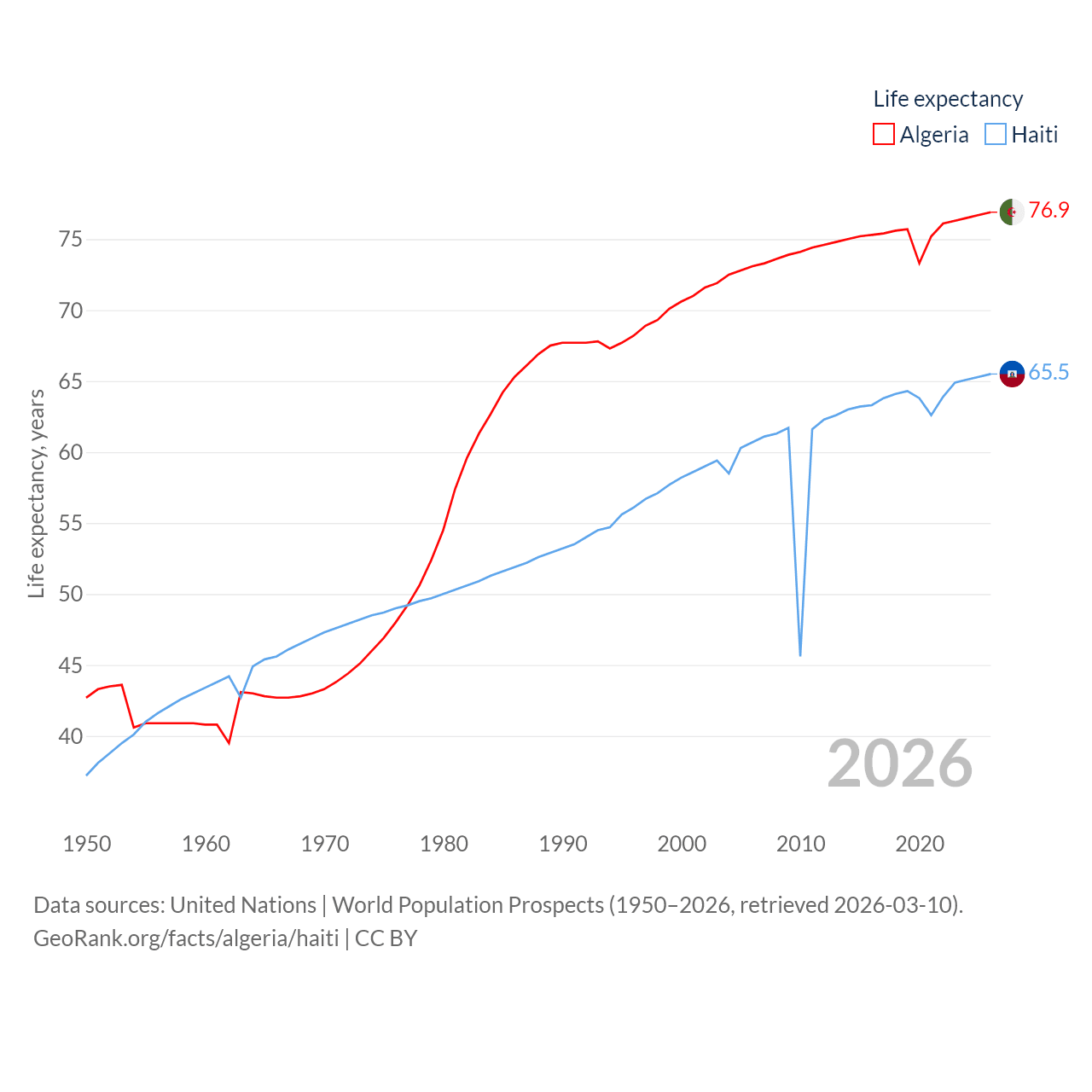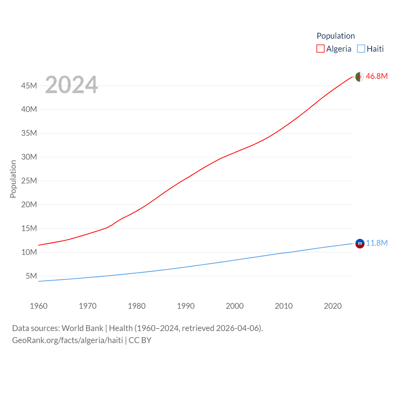 Algeria has a population of 46.8M (ranked 33/197), compared with 11.8M in Haiti (ranked 83/197). Algeria's land area is 919,595 sq mi versus 10,641 sq mi for Haiti (ranked 10th vs. 142nd).