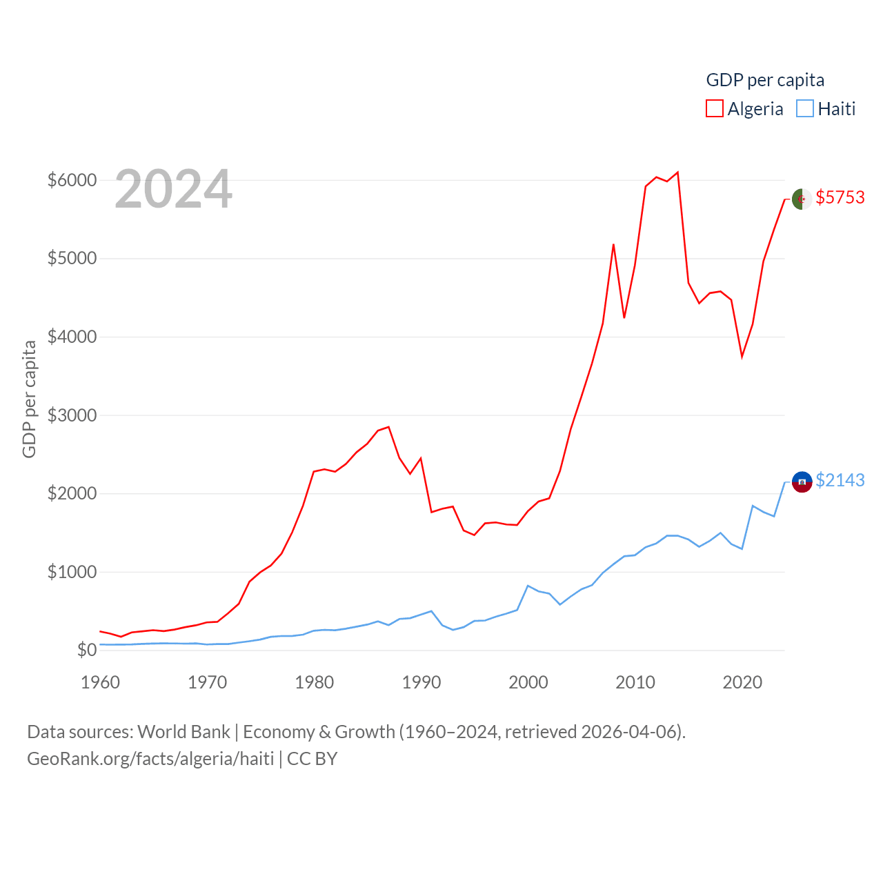 By GDP, Algeria ranks 51/197 ($269B) and Haiti ranks 117/197 ($25.2B). By GDP per capita, Algeria ranks 114/197 ($5,753), while Haiti ranks 153/197 ($2,143).