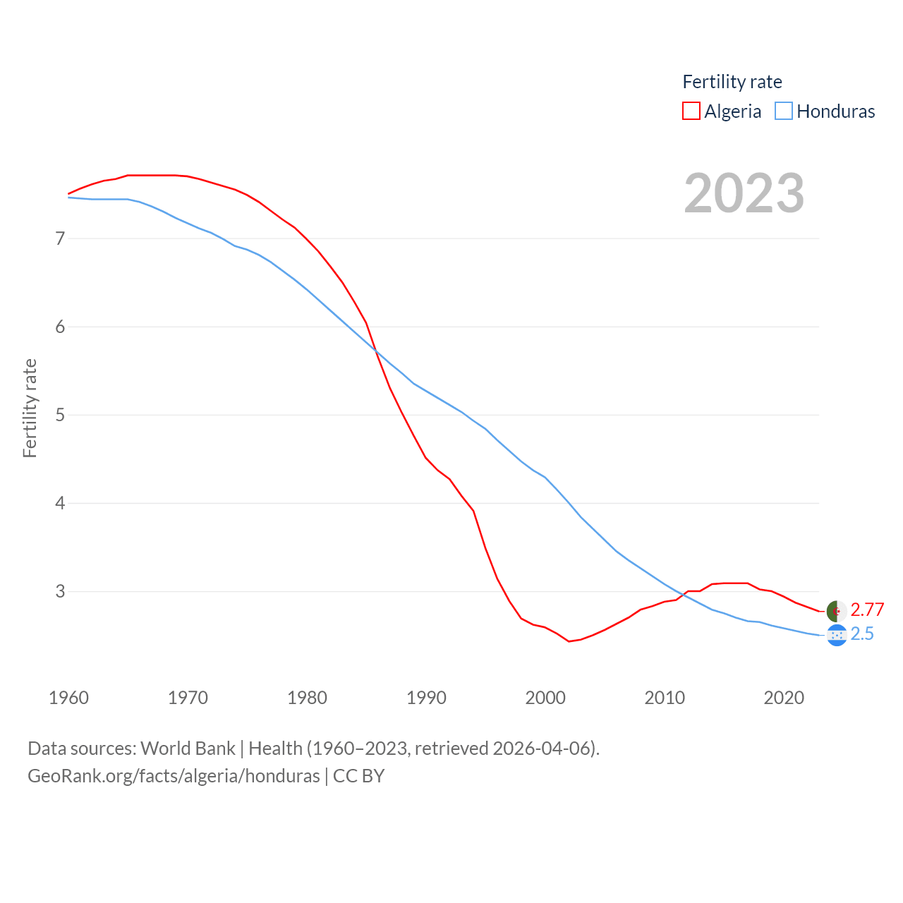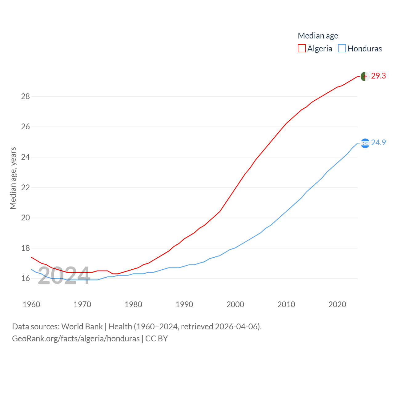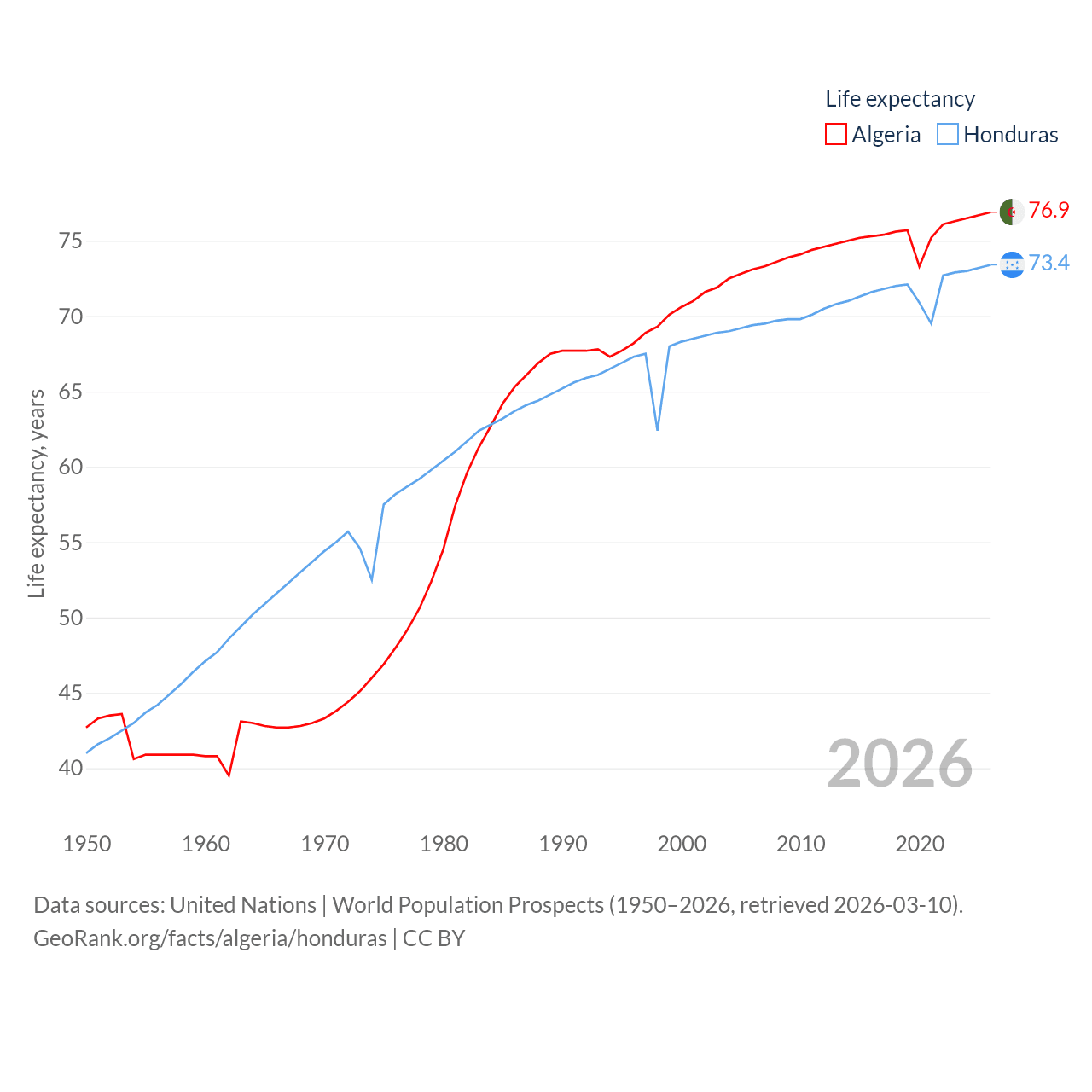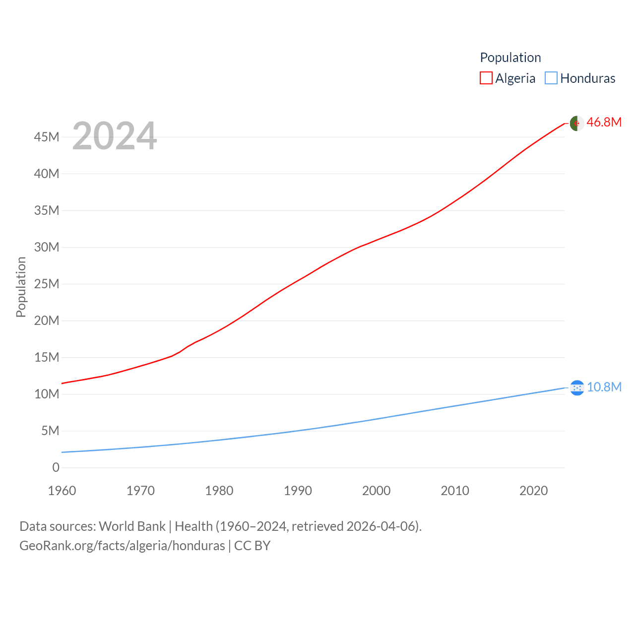 Algeria has a population of 46.8M (ranked 33/197), compared with 10.8M in Honduras (ranked 89/197). Algeria's land area is 919,595 sq mi versus 43,201 sq mi for Honduras (ranked 10th vs. 100th).
