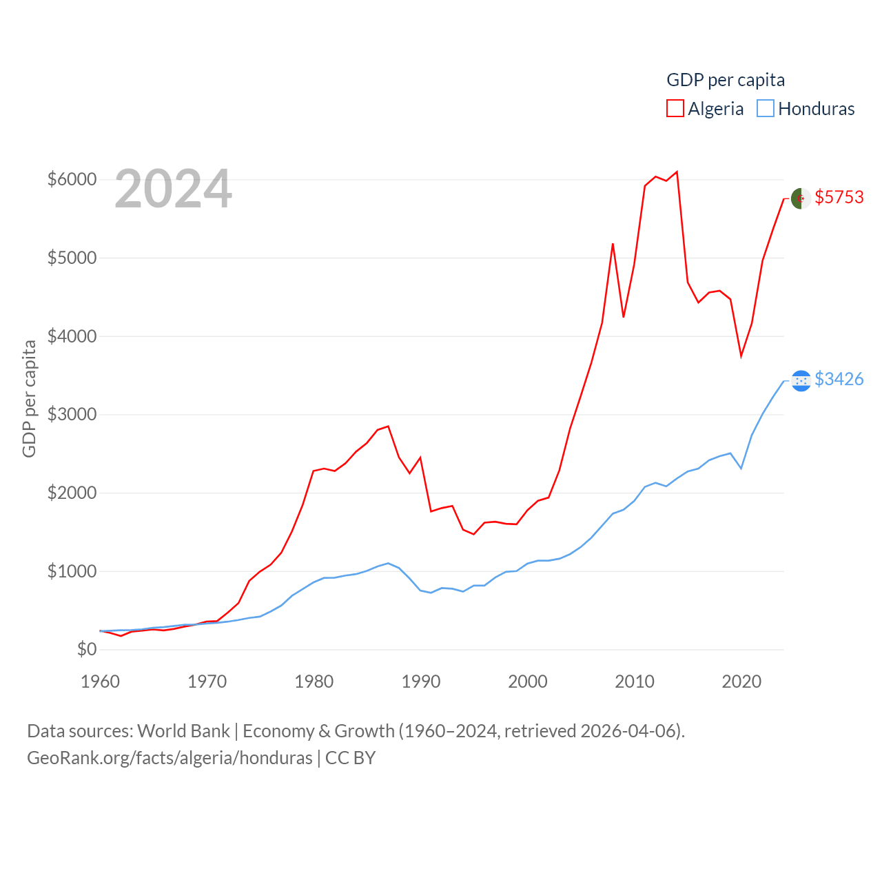 By GDP, Algeria ranks 51/197 ($269B) and Honduras ranks 104/197 ($37.1B). By GDP per capita, Algeria ranks 114/197 ($5,753), while Honduras ranks 136/197 ($3,426).