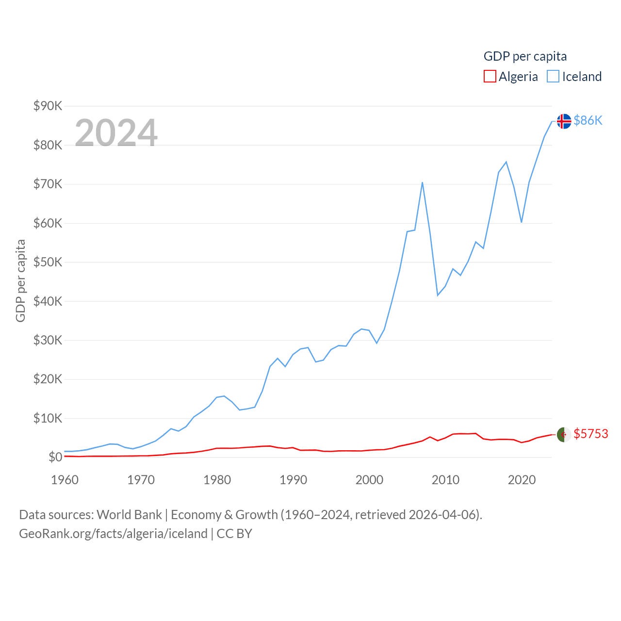 By GDP, Algeria ranks 51/197 ($269B) and Iceland ranks 108/197 ($33.3B). By GDP per capita, Algeria ranks 114/197 ($5,753), while Iceland ranks 9/197 ($86,041).