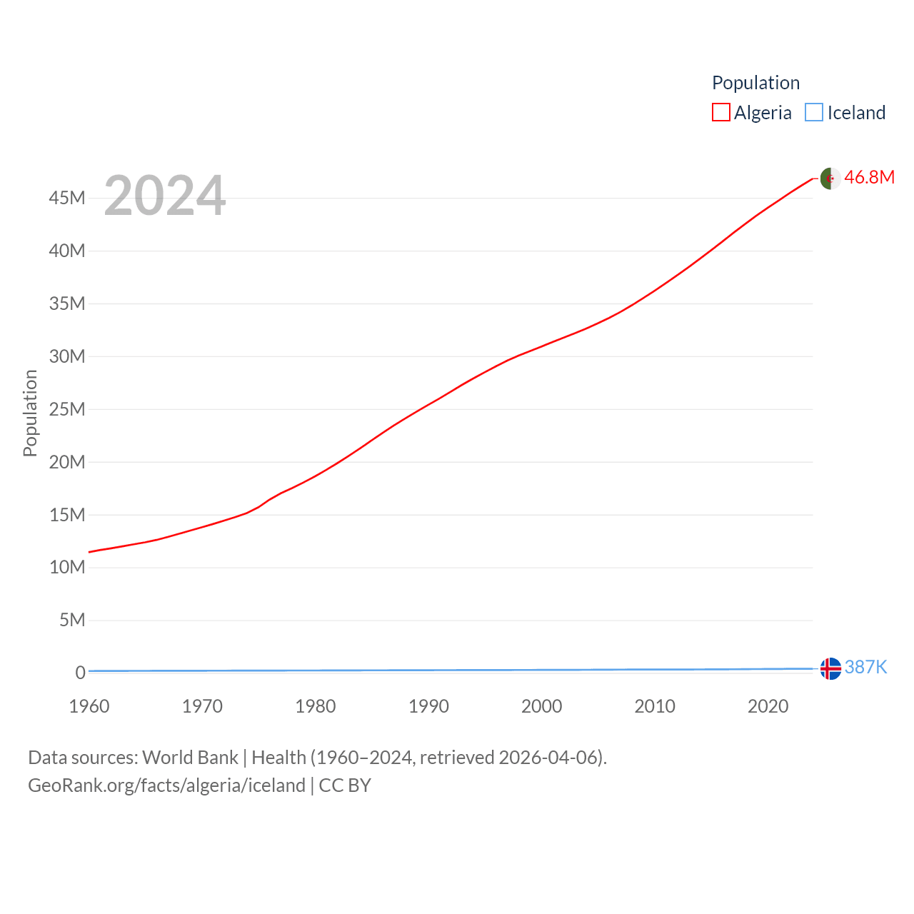 Algeria has a population of 46.8M (ranked 33/197), compared with 387K in Iceland (ranked 173/197). Algeria's land area is 919,595 sq mi versus 38,931 sq mi for Iceland (ranked 10th vs. 104th).