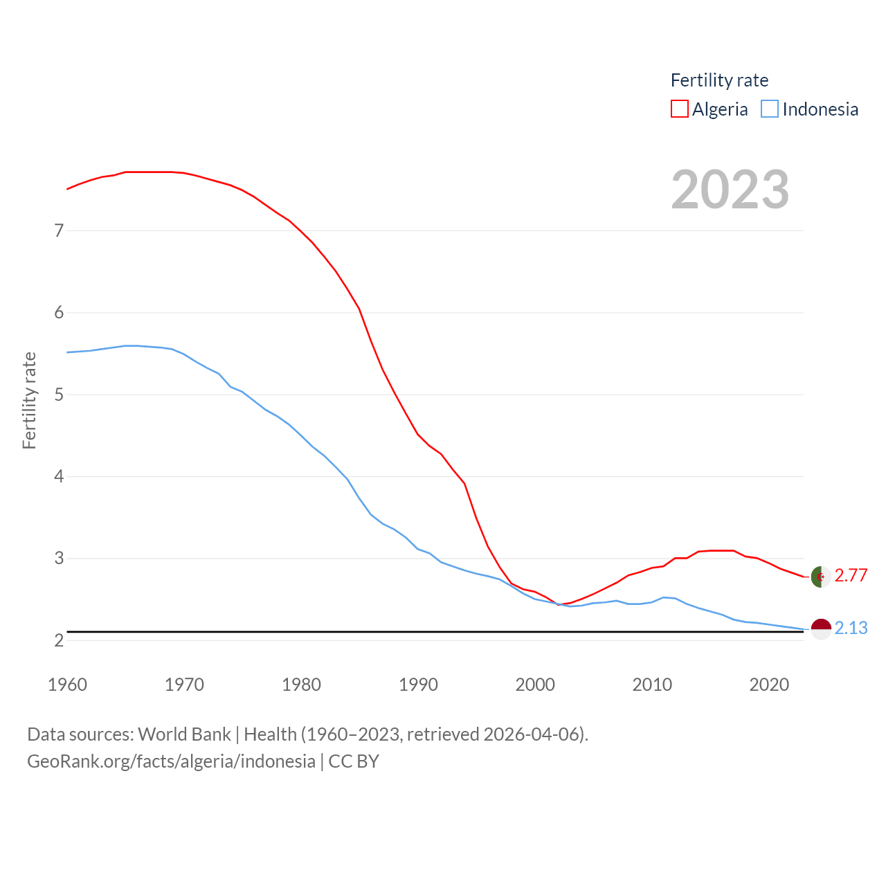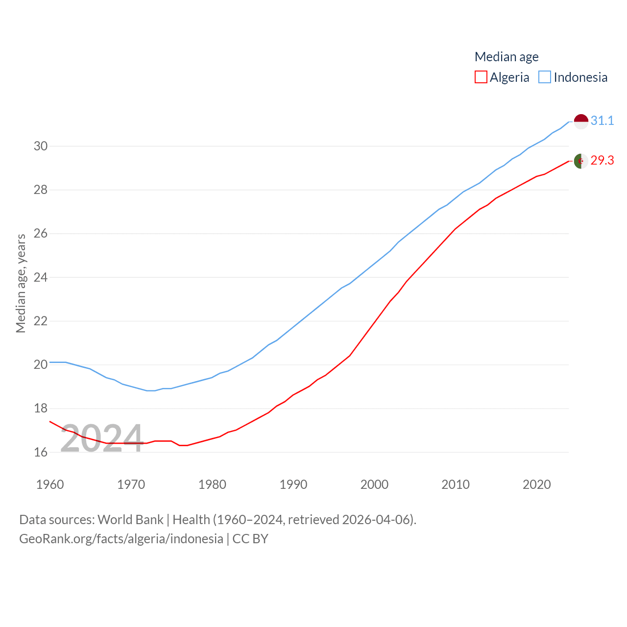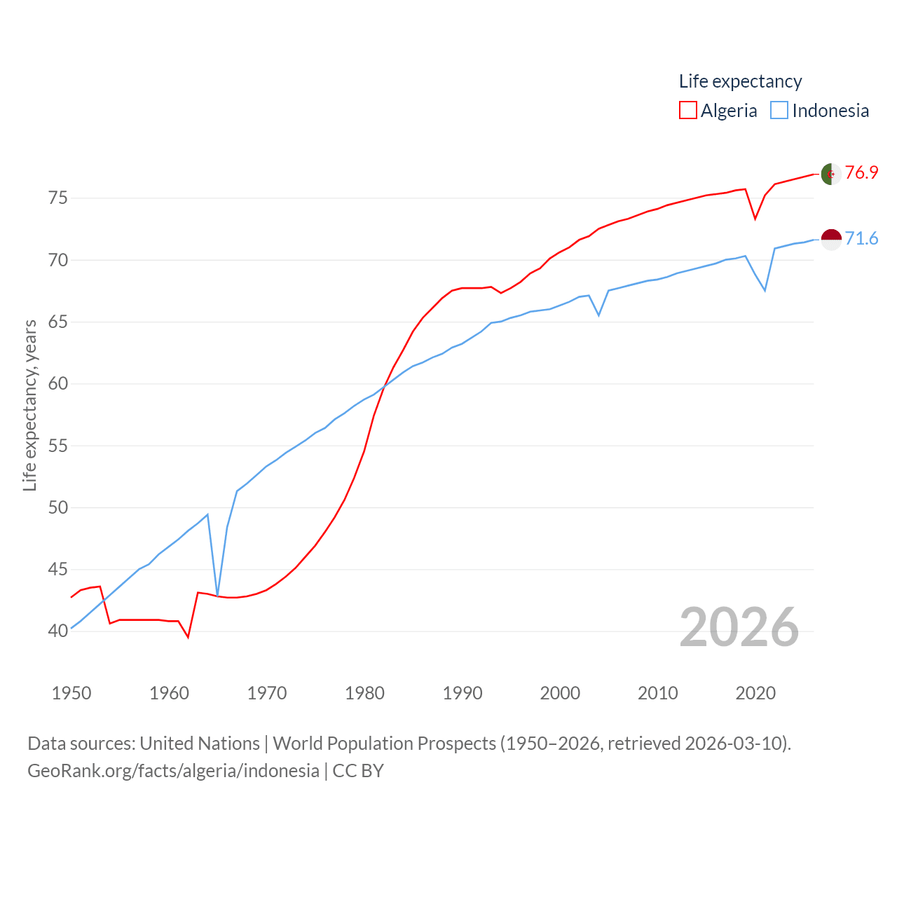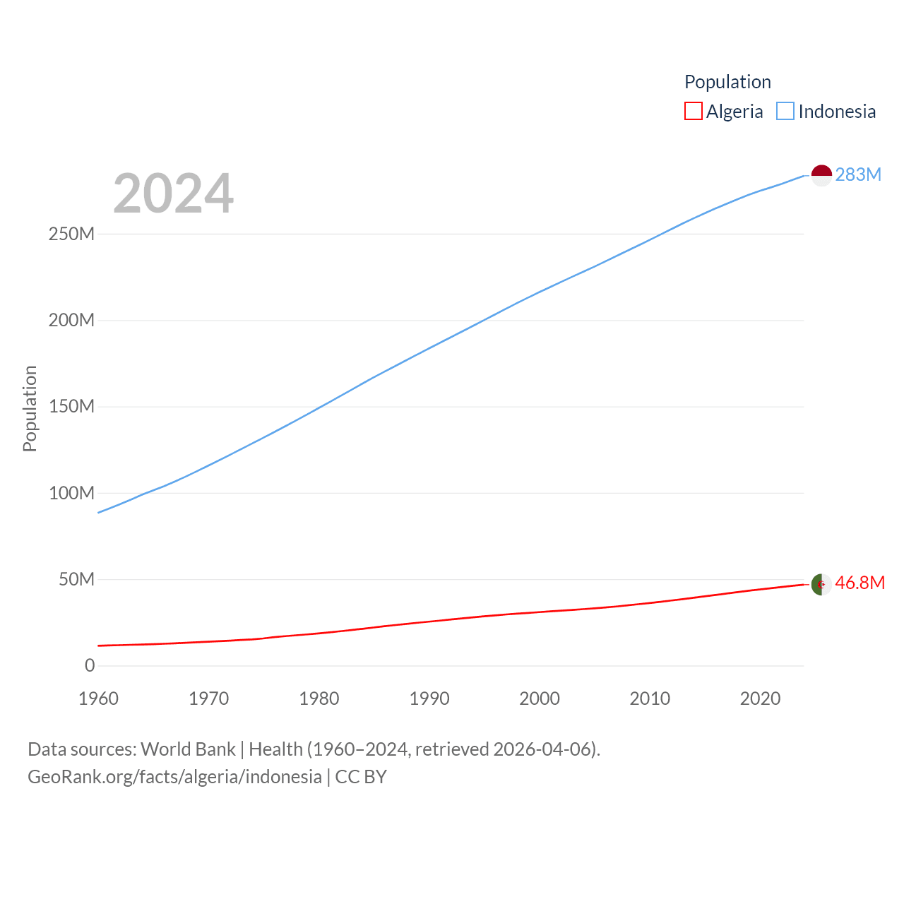 Algeria has a population of 46.8M (ranked 33/197), compared with 283M in Indonesia (ranked 4/197). Algeria's land area is 919,595 sq mi versus 730,720 sq mi for Indonesia (ranked 10th vs. 14th).