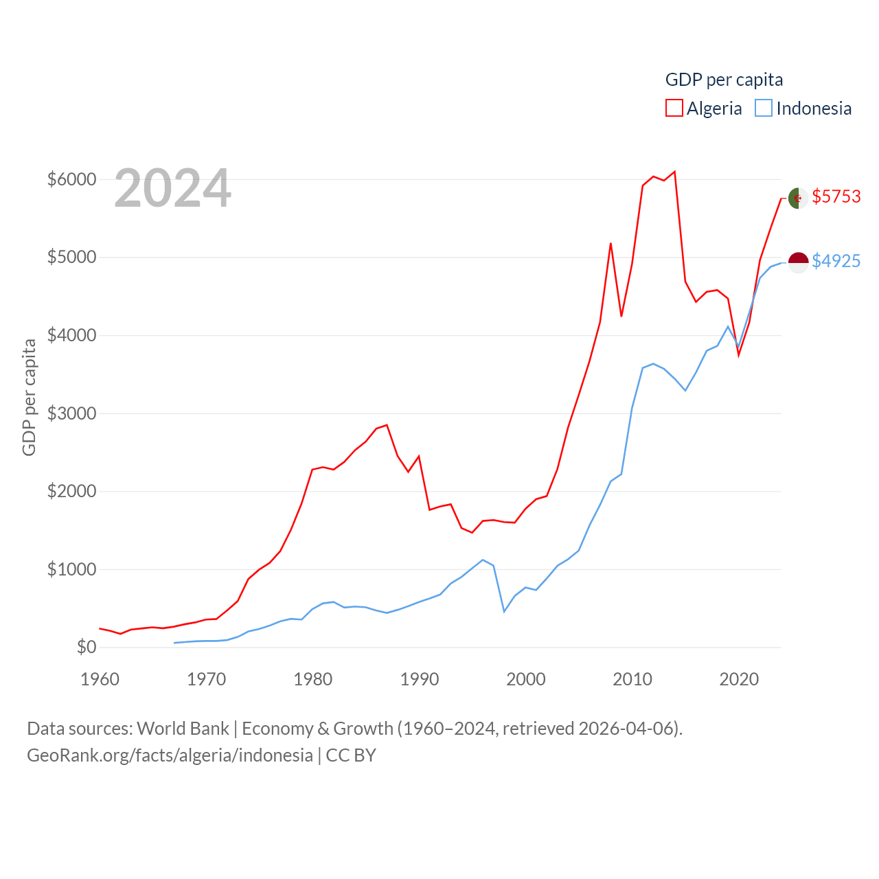 By GDP, Algeria ranks 51/197 ($269B) and Indonesia ranks 16/197 ($1.4T). By GDP per capita, Algeria ranks 114/197 ($5,753), while Indonesia ranks 121/197 ($4,925).