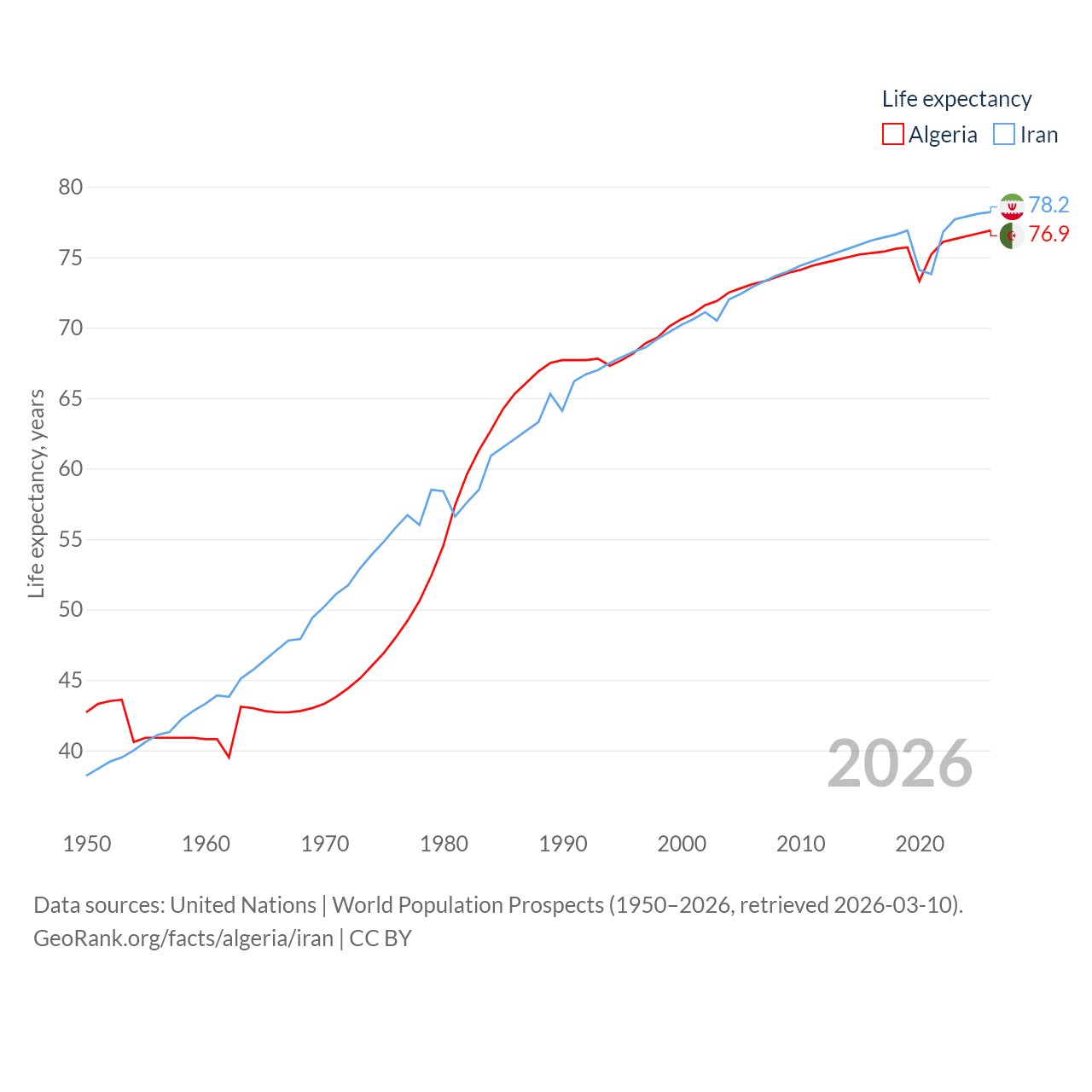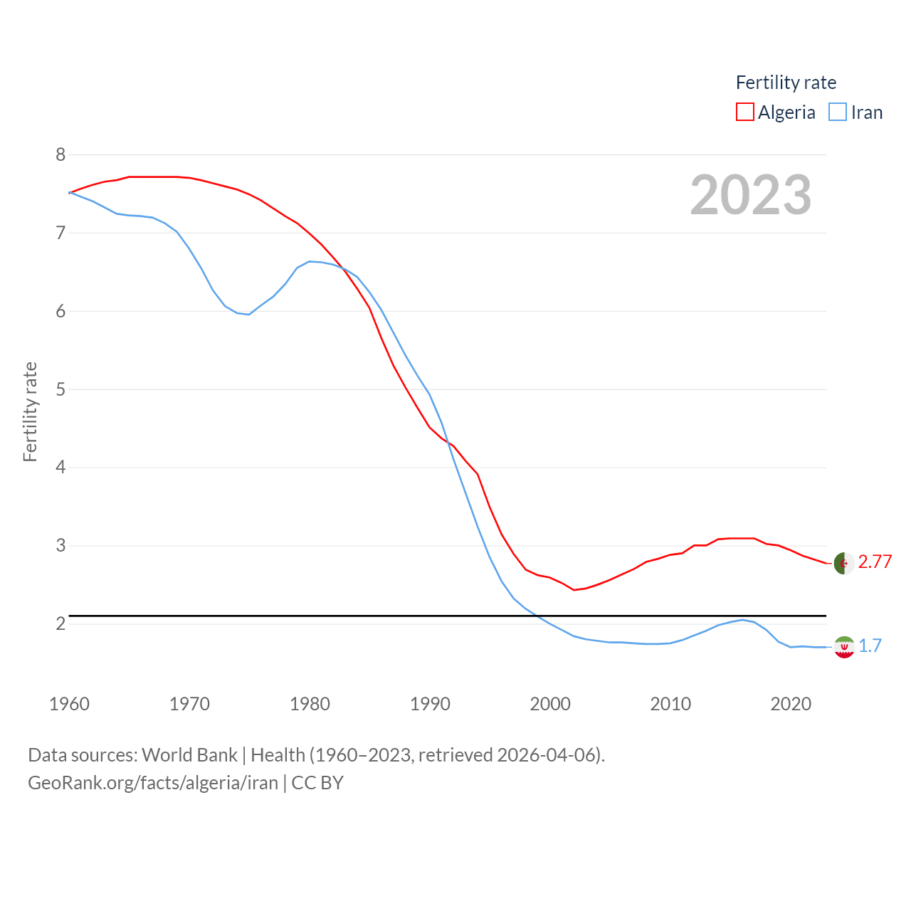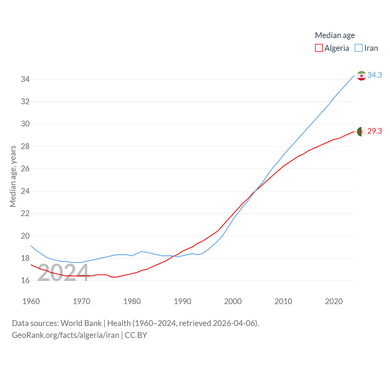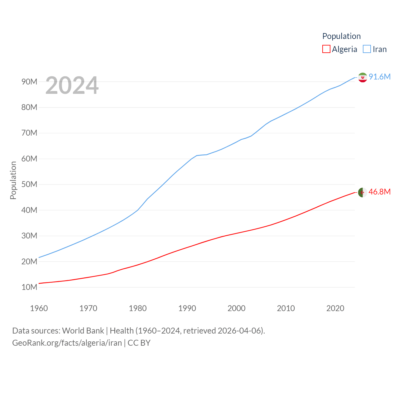 Algeria has a population of 46.8M (ranked 33/197), compared with 91.6M in Iran (ranked 17/197). Algeria's land area is 919,595 sq mi versus 626,451 sq mi for Iran (ranked 10th vs. 17th).