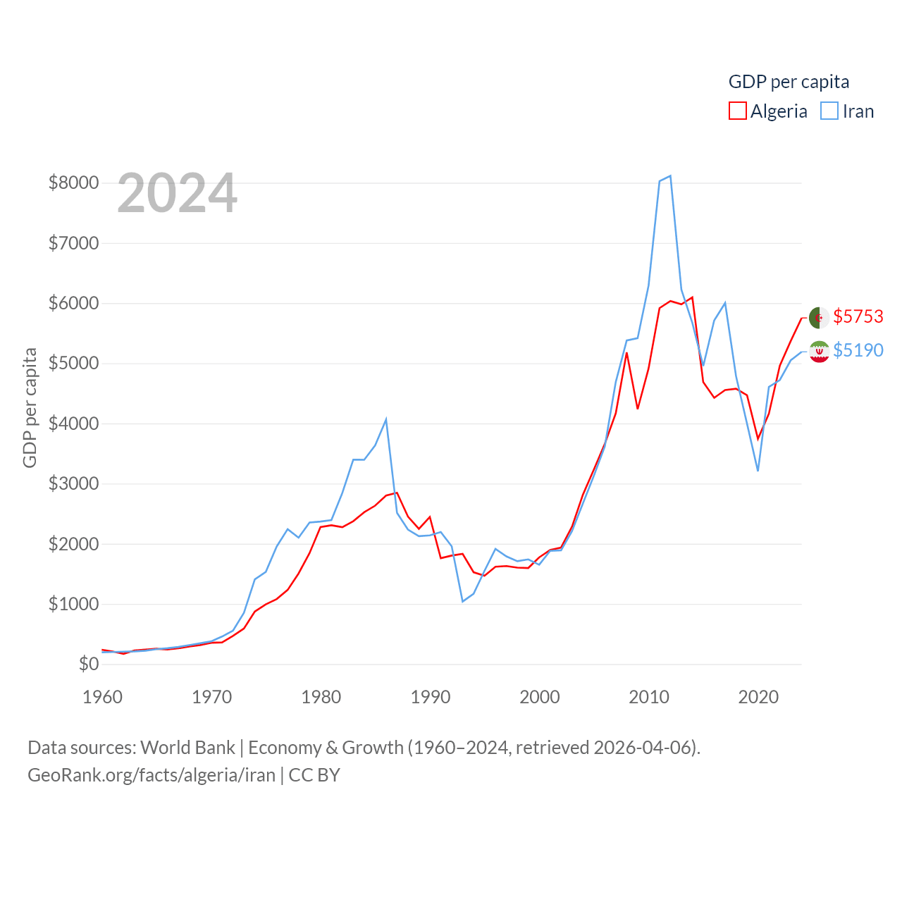 By GDP, Algeria ranks 51/197 ($269B) and Iran ranks 34/197 ($475B). By GDP per capita, Algeria ranks 114/197 ($5,753), while Iran ranks 119/197 ($5,190).