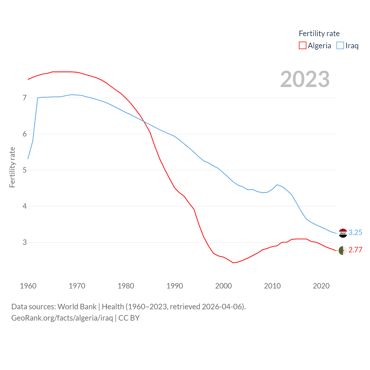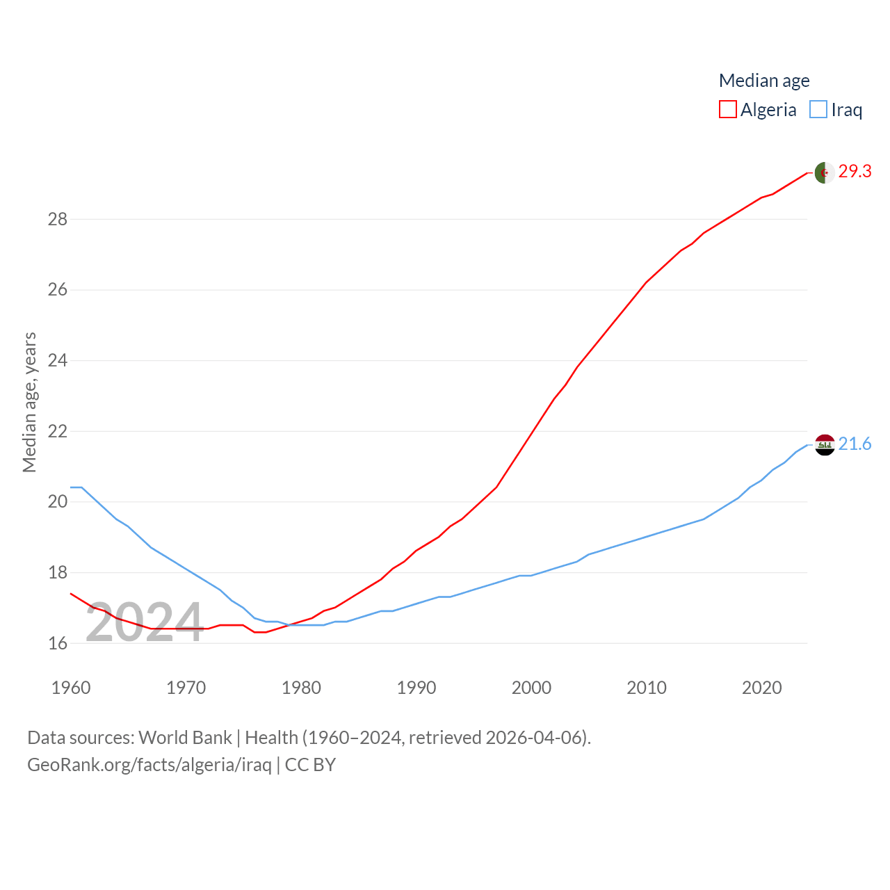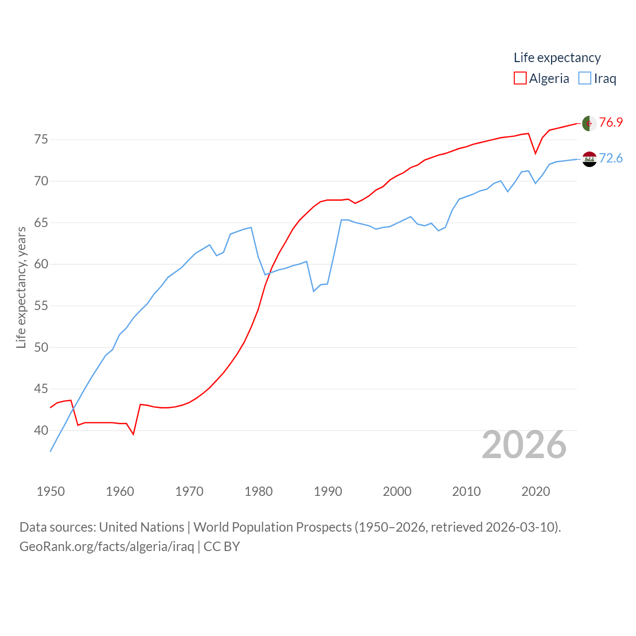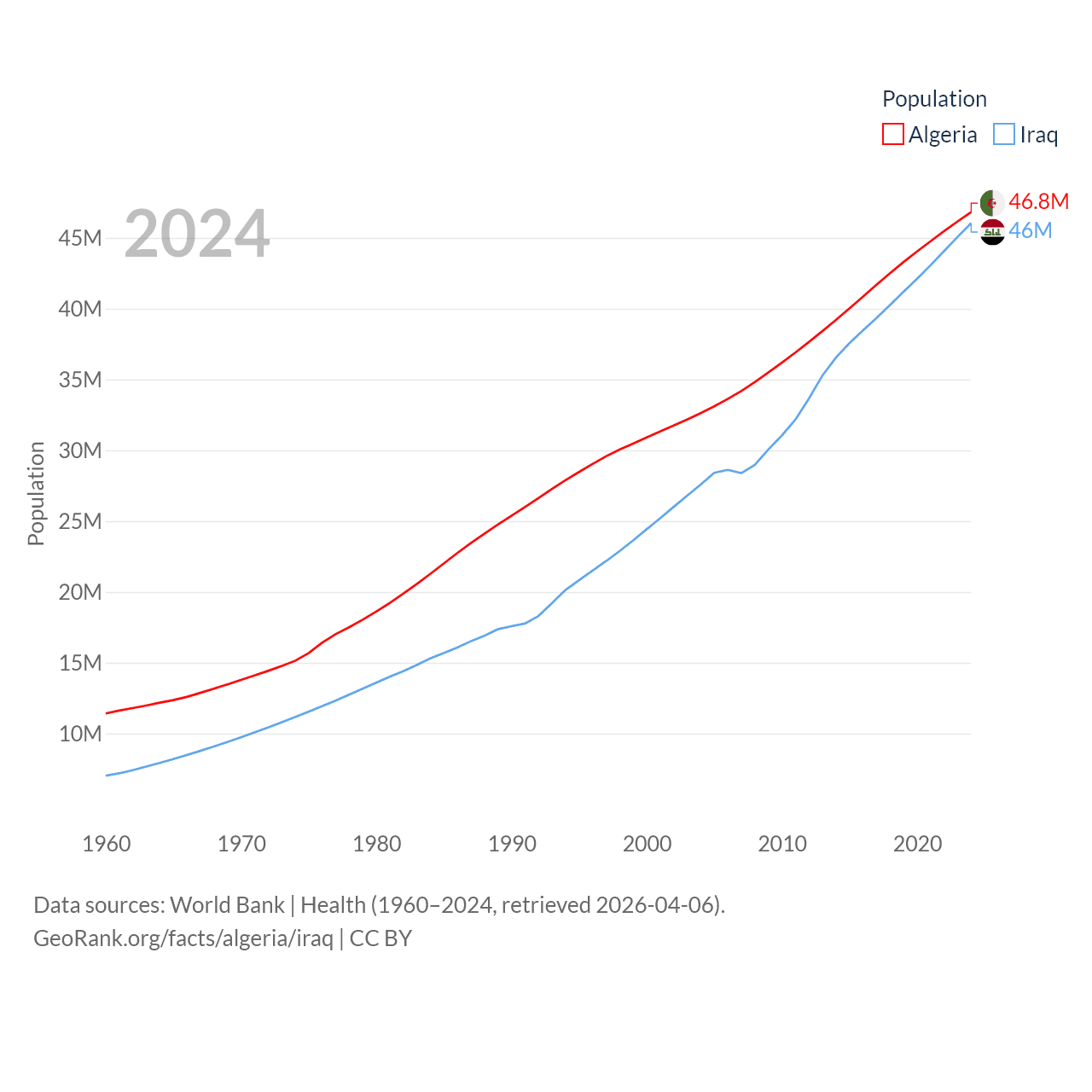 Algeria has a population of 46.8M (ranked 33/197), compared with 46M in Iraq (ranked 34/197). Algeria's land area is 919,595 sq mi versus 167,619 sq mi for Iraq (ranked 10th vs. 57th).