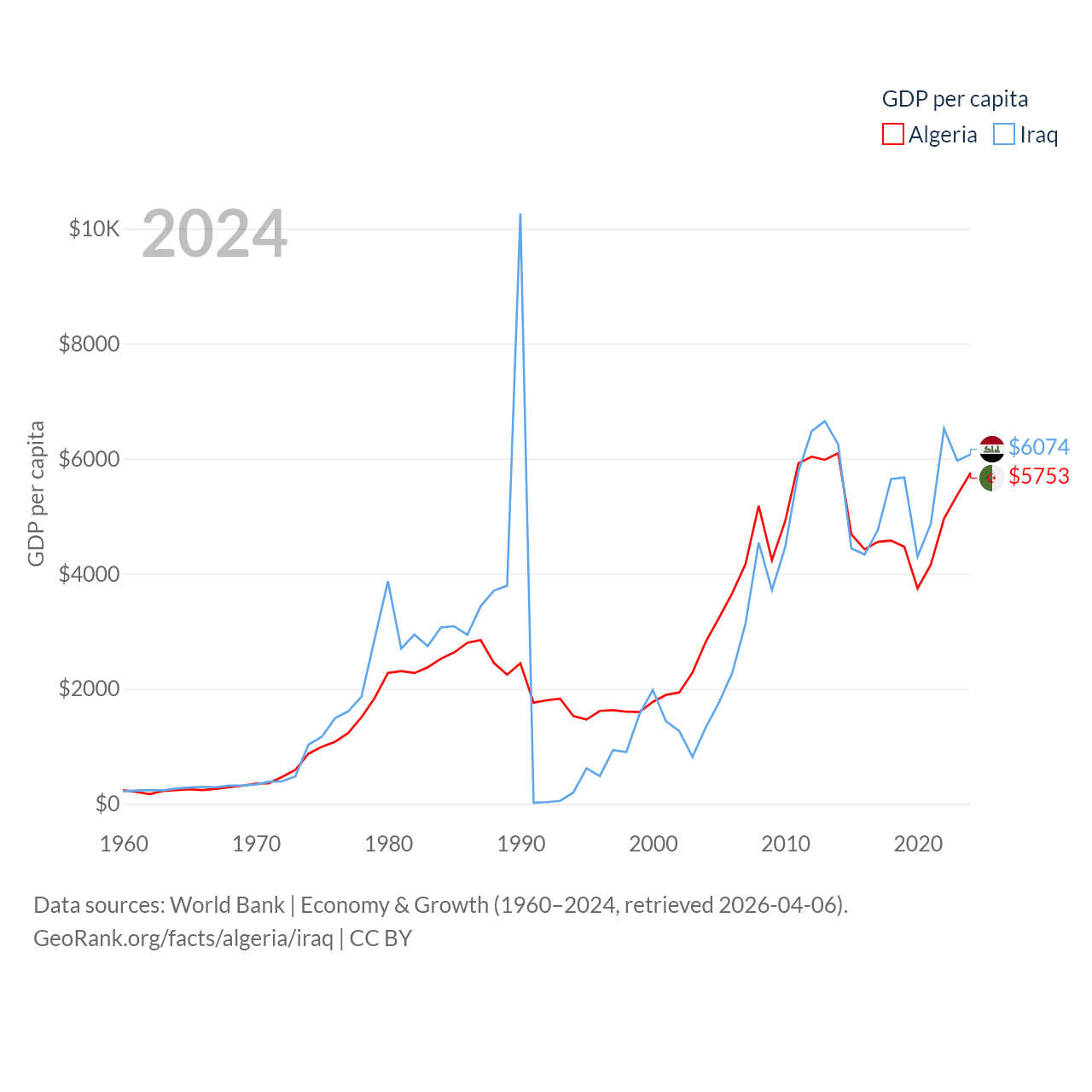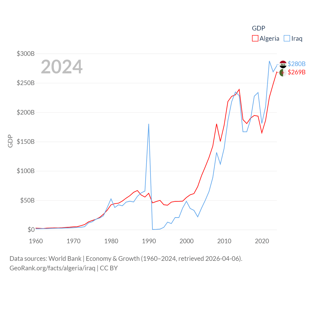 By GDP, Algeria ranks 51/197 ($269B) and Iraq ranks 50/197 ($280B). By GDP per capita, Algeria ranks 114/197 ($5,753), while Iraq ranks 113/197 ($6,074).