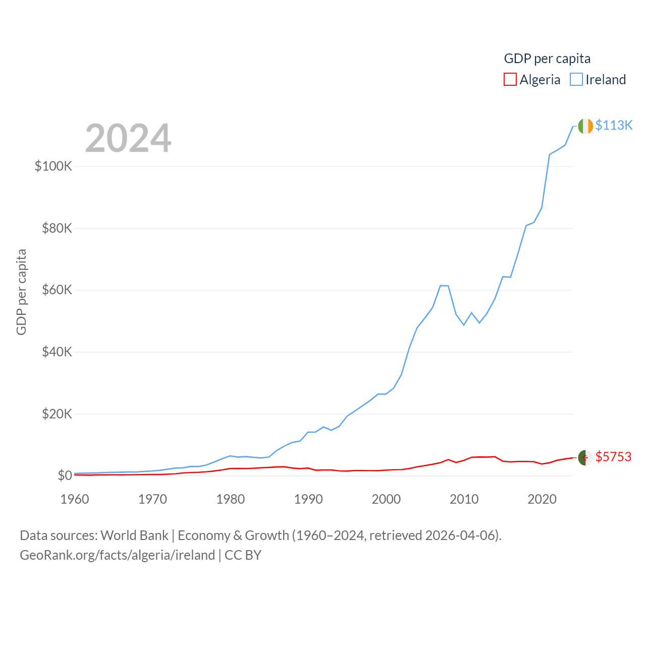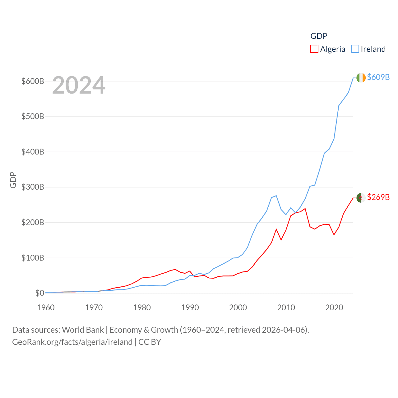 By GDP, Algeria ranks 51/197 ($269B) and Ireland ranks 25/197 ($609B). By GDP per capita, Algeria ranks 114/197 ($5,753), while Ireland ranks 4/197 ($112,895).