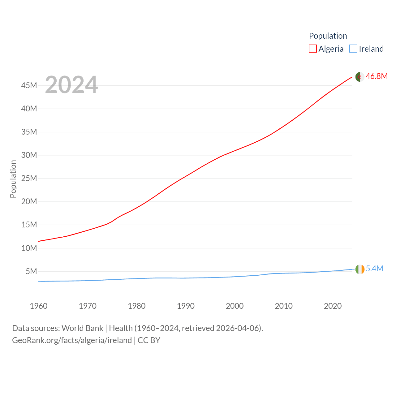 Algeria has a population of 46.8M (ranked 33/197), compared with 5.4M in Ireland (ranked 120/197). Algeria's land area is 919,595 sq mi versus 26,599 sq mi for Ireland (ranked 10th vs. 119th).