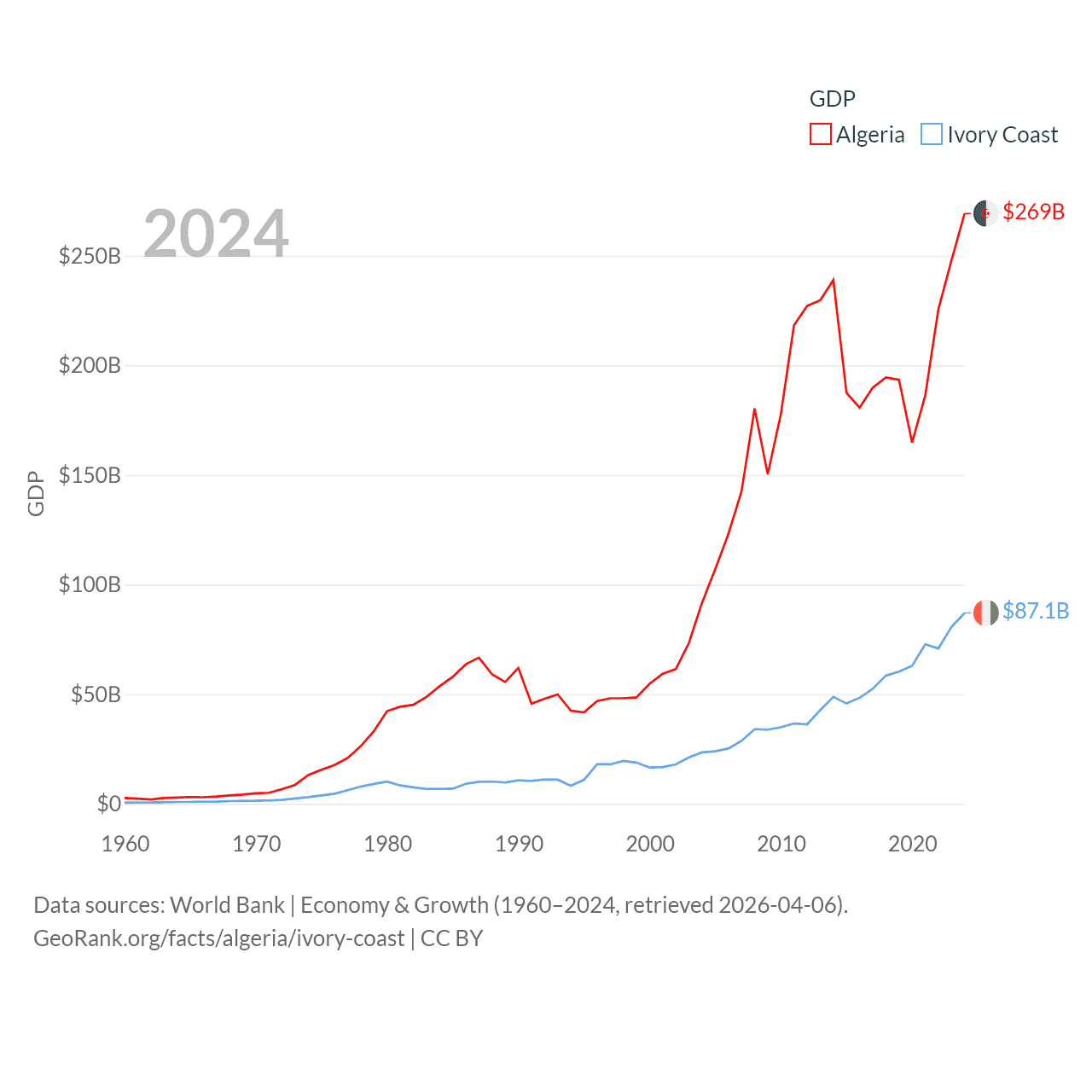By GDP, Algeria ranks 51/197 ($269B) and Ivory Coast ranks 77/197 ($87.1B). By GDP per capita, Algeria ranks 114/197 ($5,753), while Ivory Coast ranks 142/197 ($2,728).