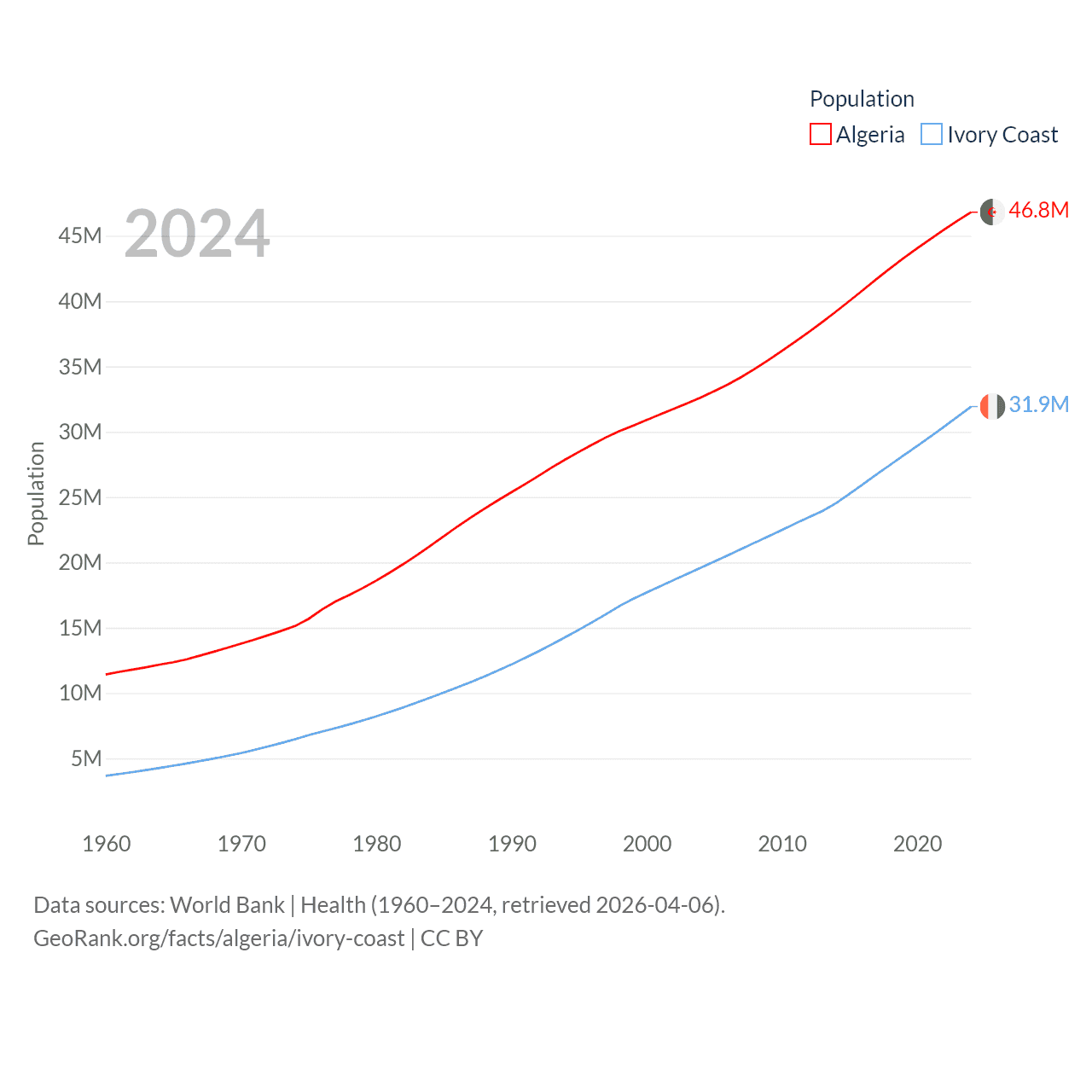 Algeria has a population of 46.8M (ranked 33/197), compared with 31.9M in Ivory Coast (ranked 50/197). Algeria's land area is 919,595 sq mi versus 122,780 sq mi for Ivory Coast (ranked 10th vs. 66th).
