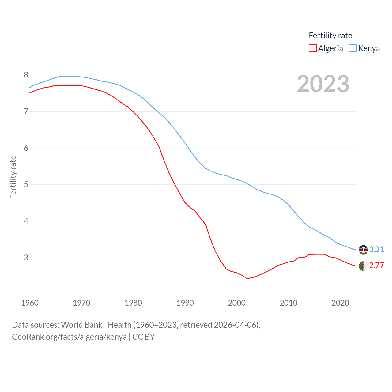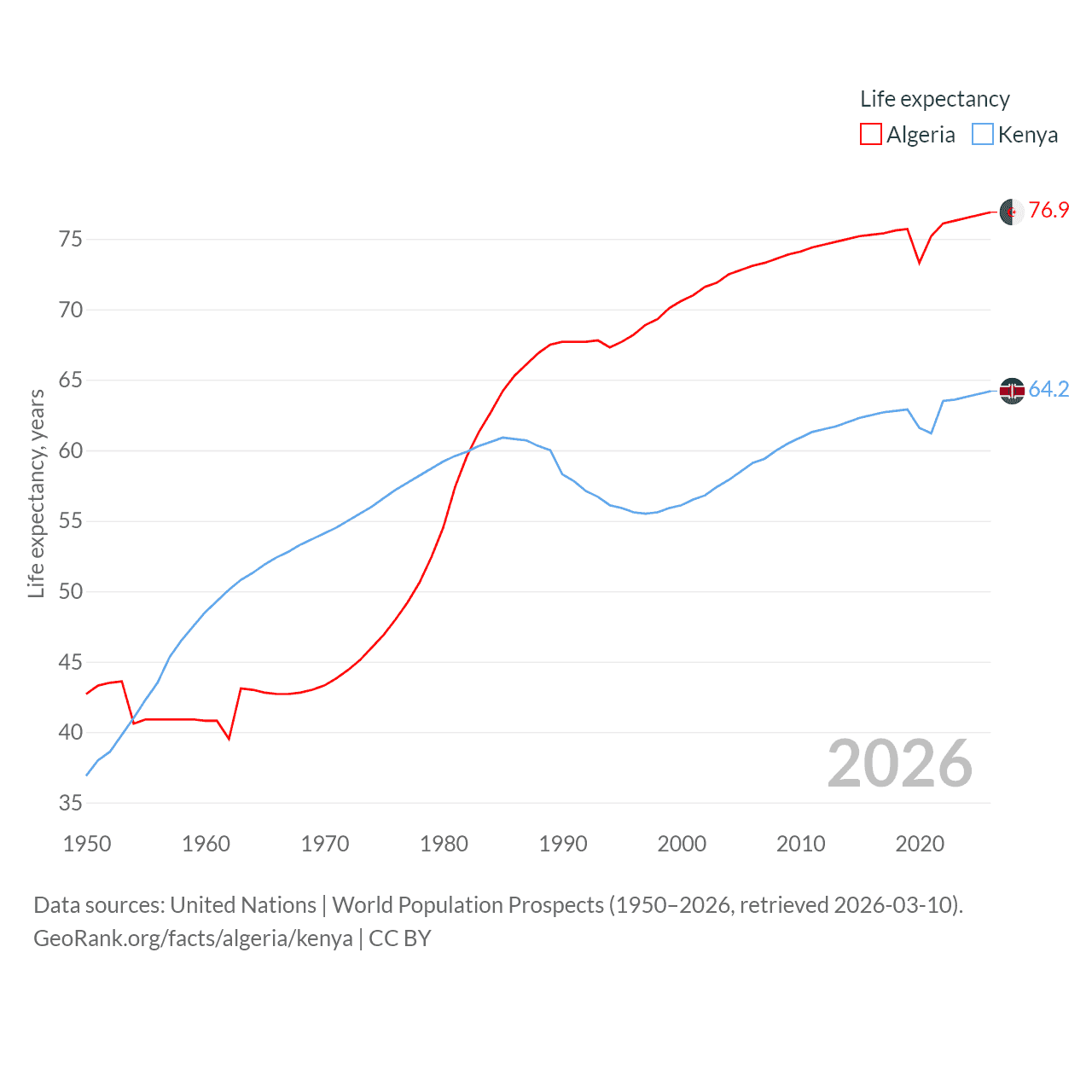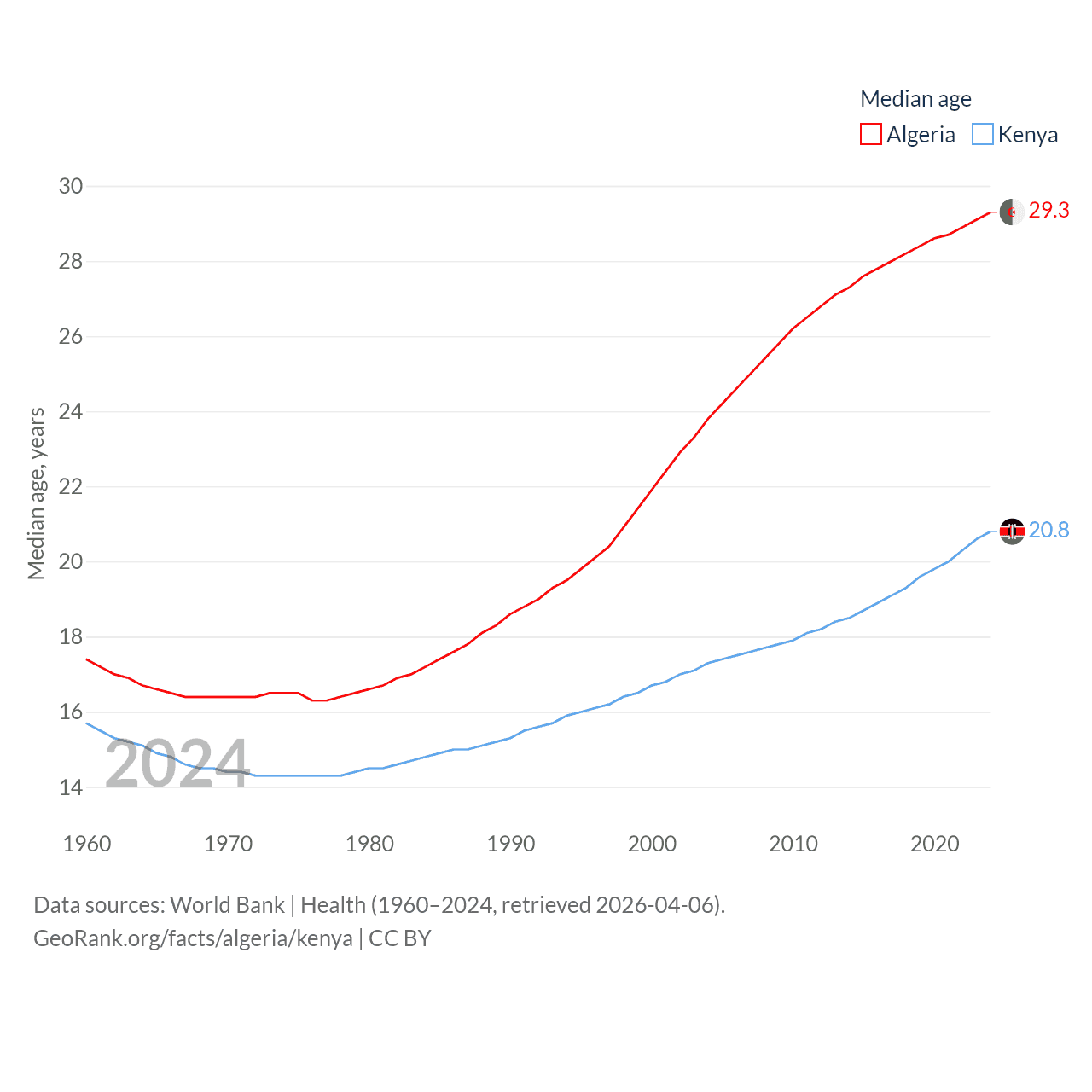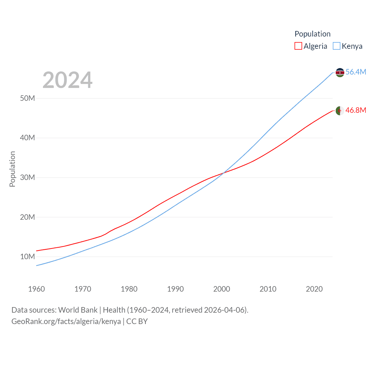 Algeria has a population of 46.8M (ranked 33/197), compared with 56.4M in Kenya (ranked 26/197). Algeria's land area is 919,595 sq mi versus 224,278 sq mi for Kenya (ranked 10th vs. 45th).