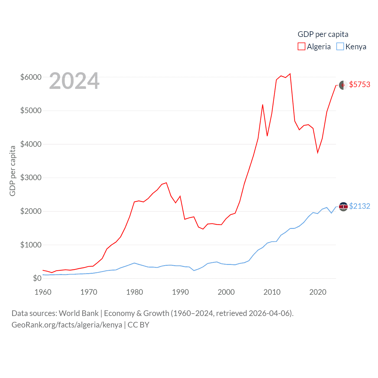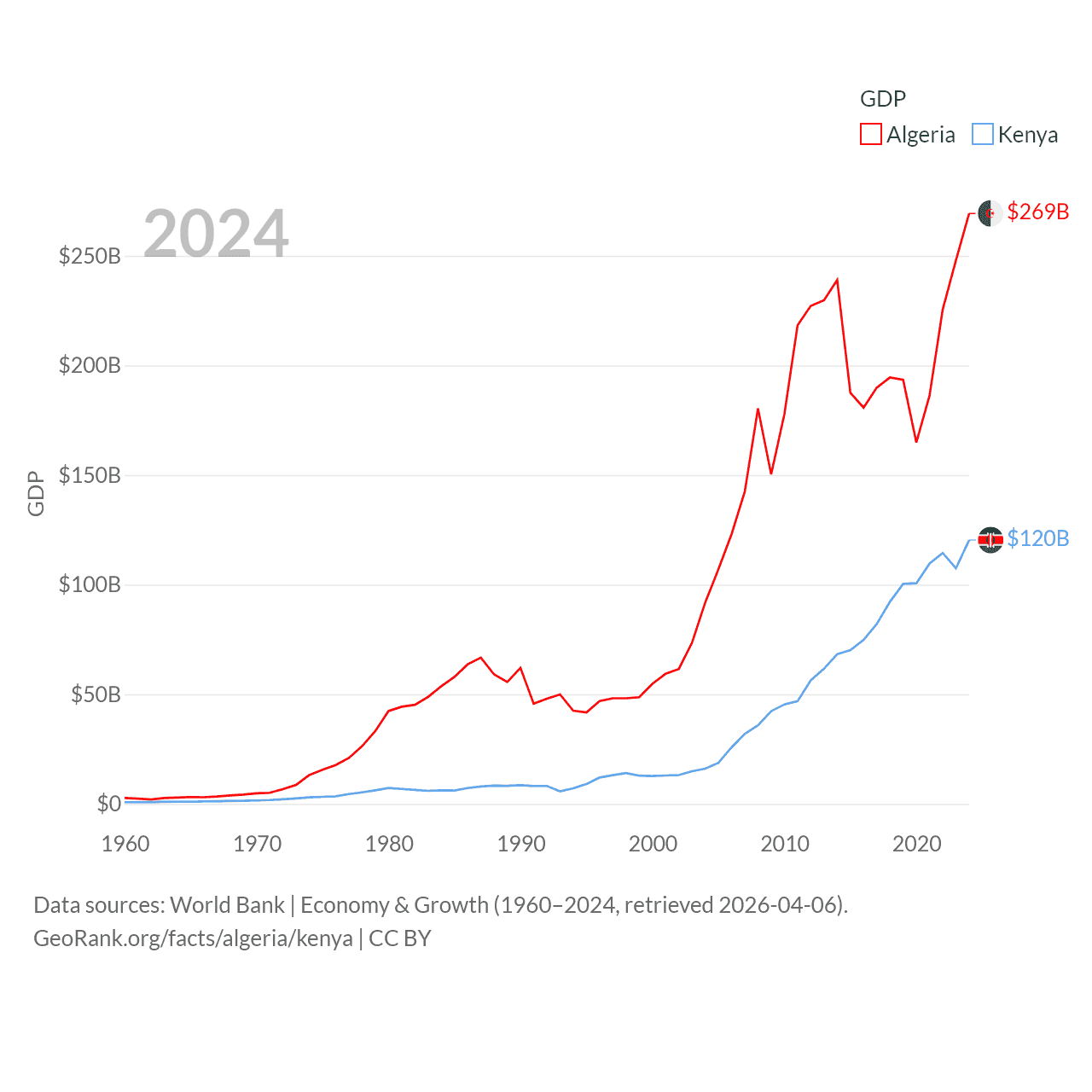 By GDP, Algeria ranks 51/197 ($269B) and Kenya ranks 64/197 ($120B). By GDP per capita, Algeria ranks 114/197 ($5,753), while Kenya ranks 154/197 ($2,132).