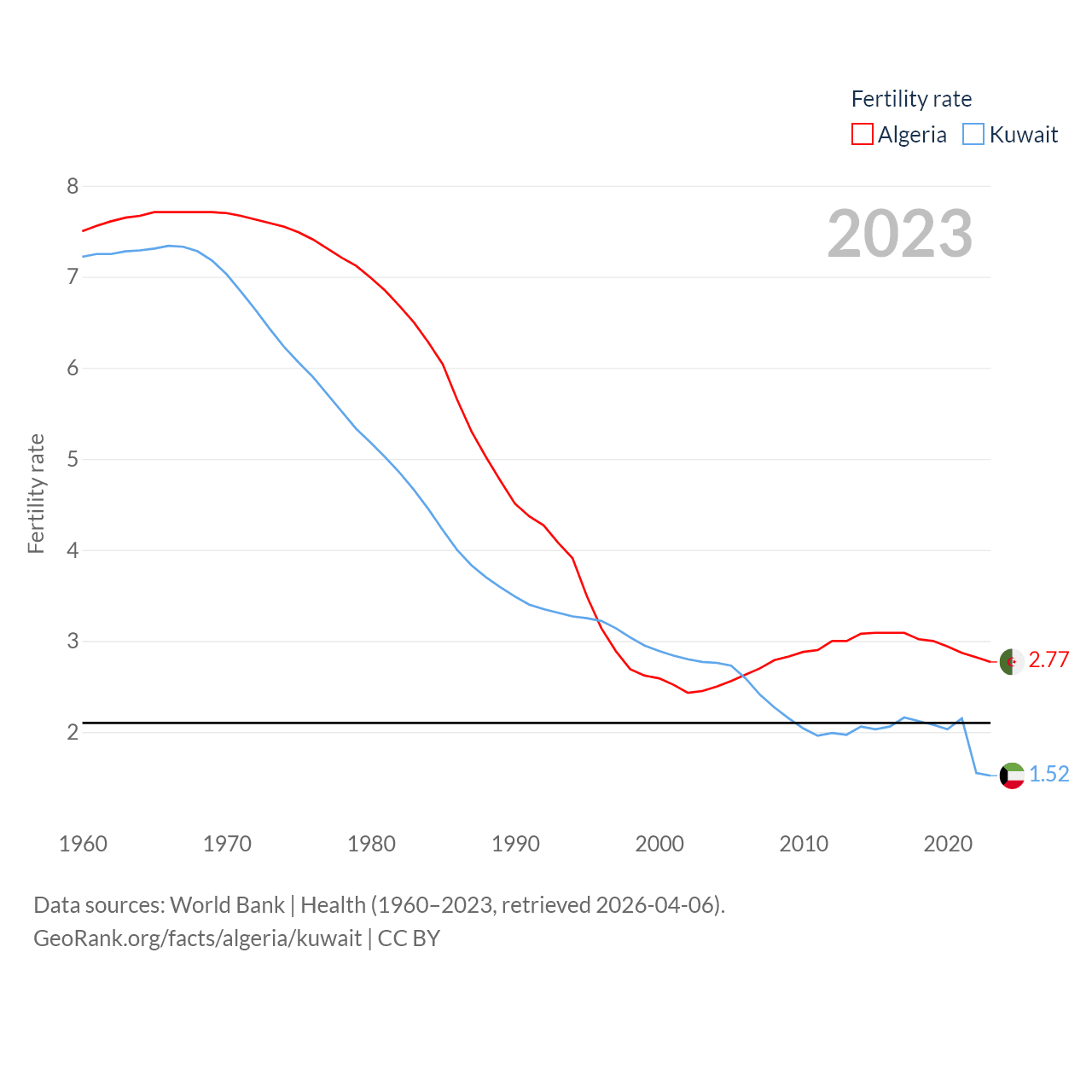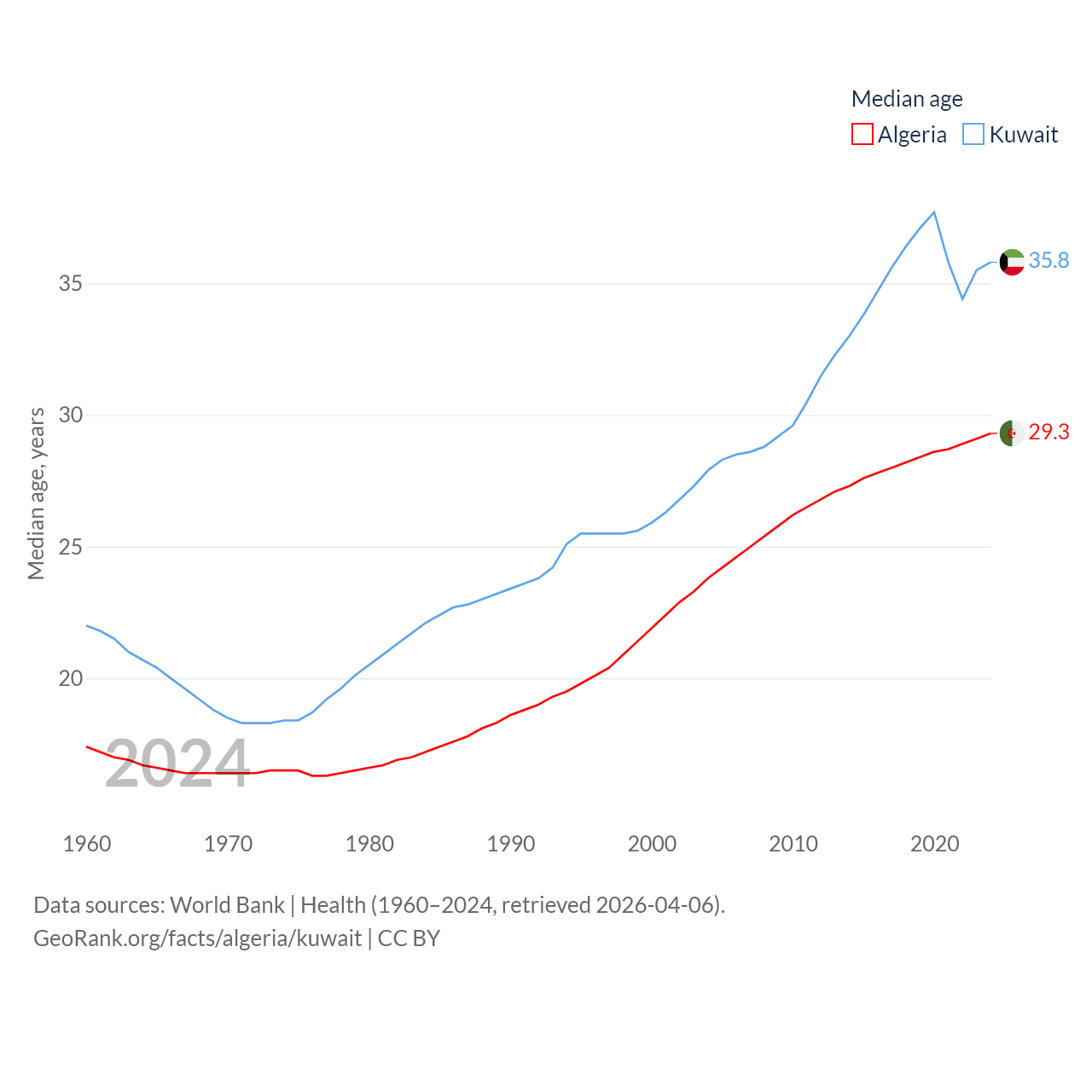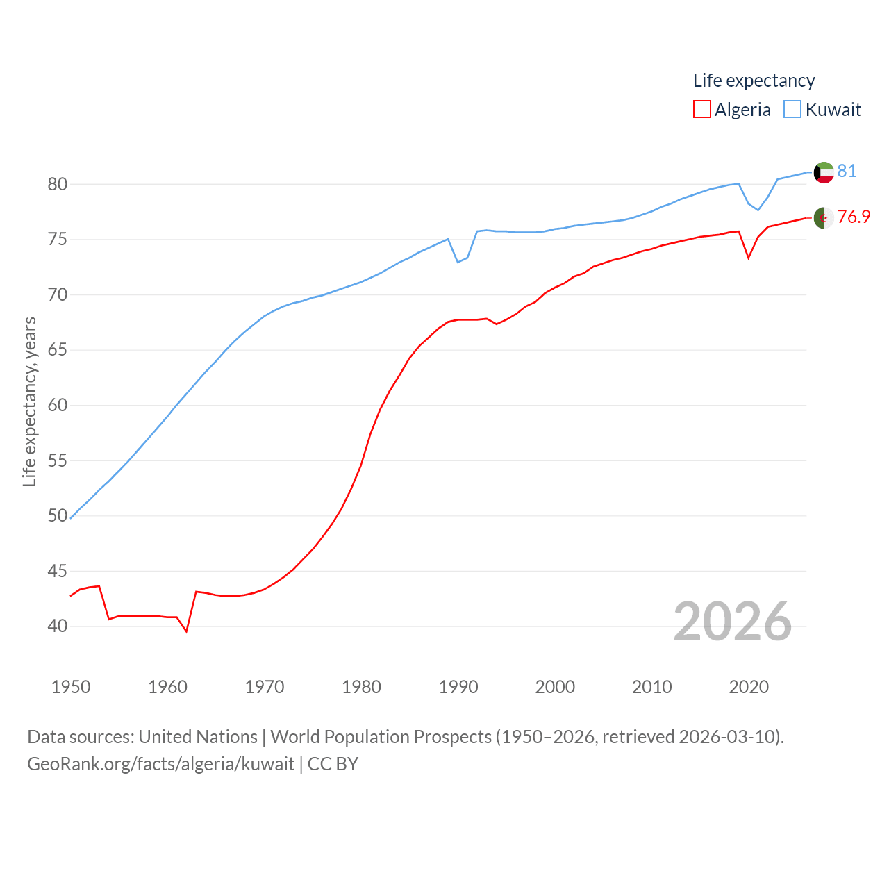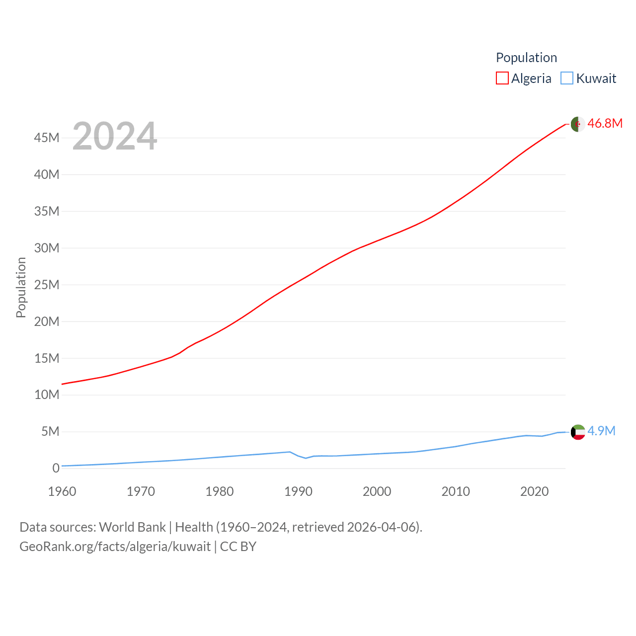 Algeria has a population of 46.8M (ranked 33/197), compared with 4.9M in Kuwait (ranked 127/197). Algeria's land area is 919,595 sq mi versus 6,880 sq mi for Kuwait (ranked 10th vs. 153rd).