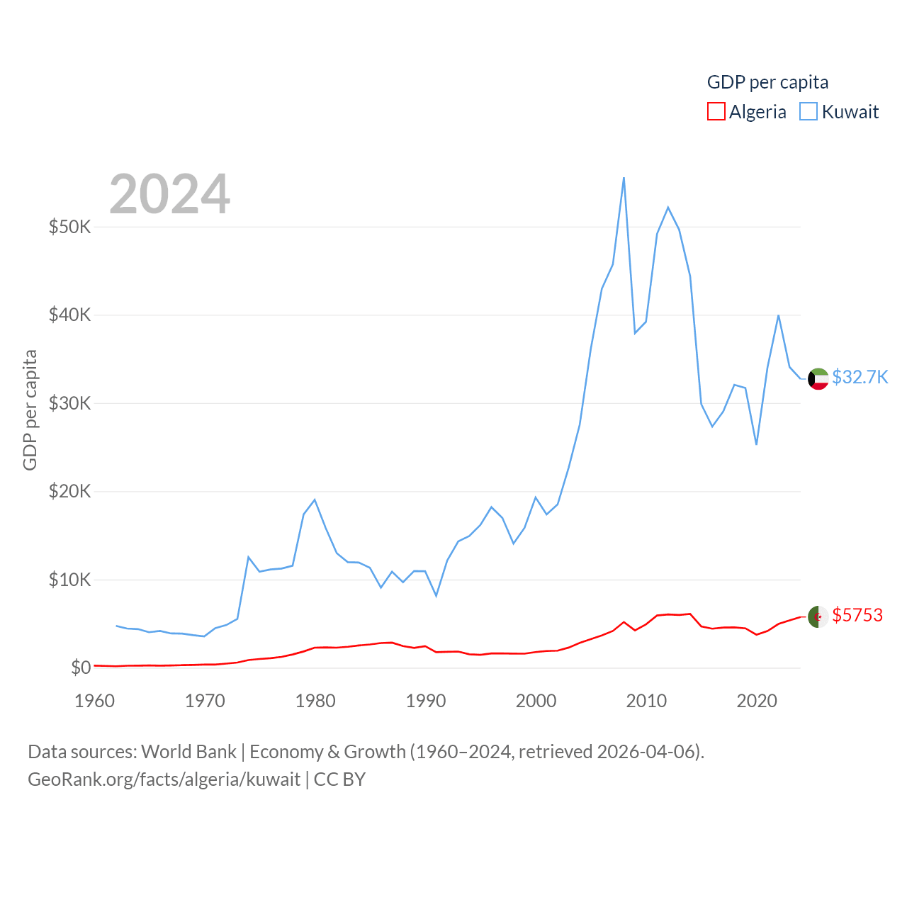By GDP, Algeria ranks 51/197 ($269B) and Kuwait ranks 59/197 ($160B). By GDP per capita, Algeria ranks 114/197 ($5,753), while Kuwait ranks 37/197 ($32,718).
