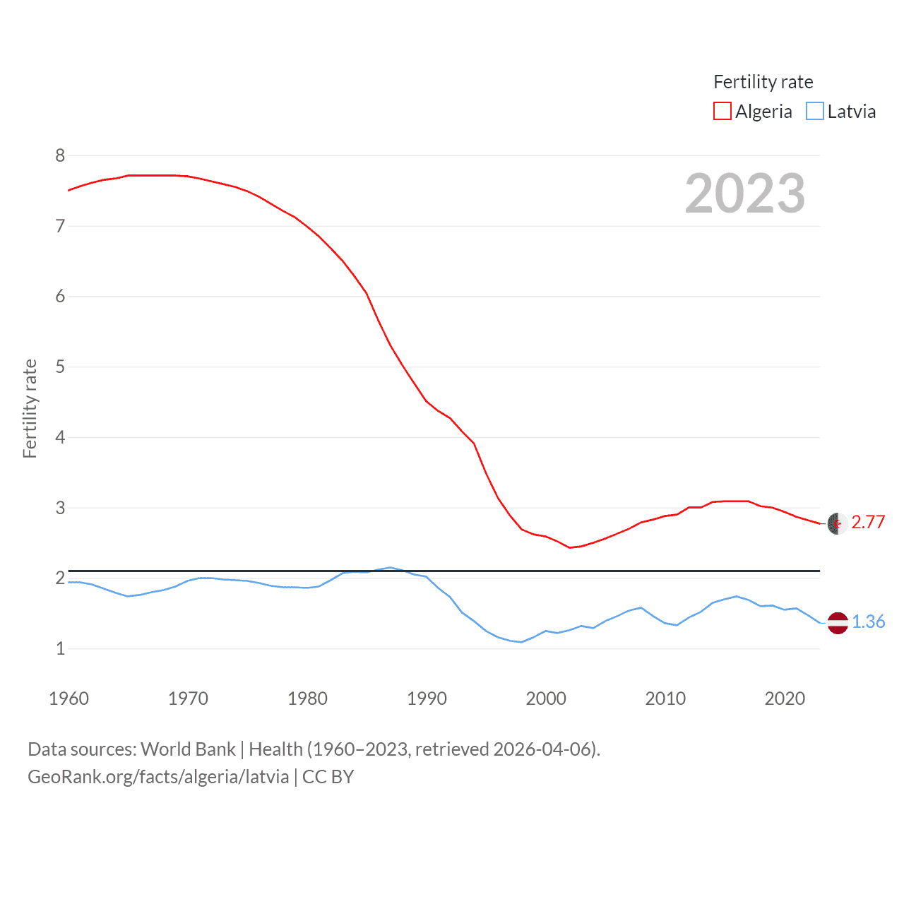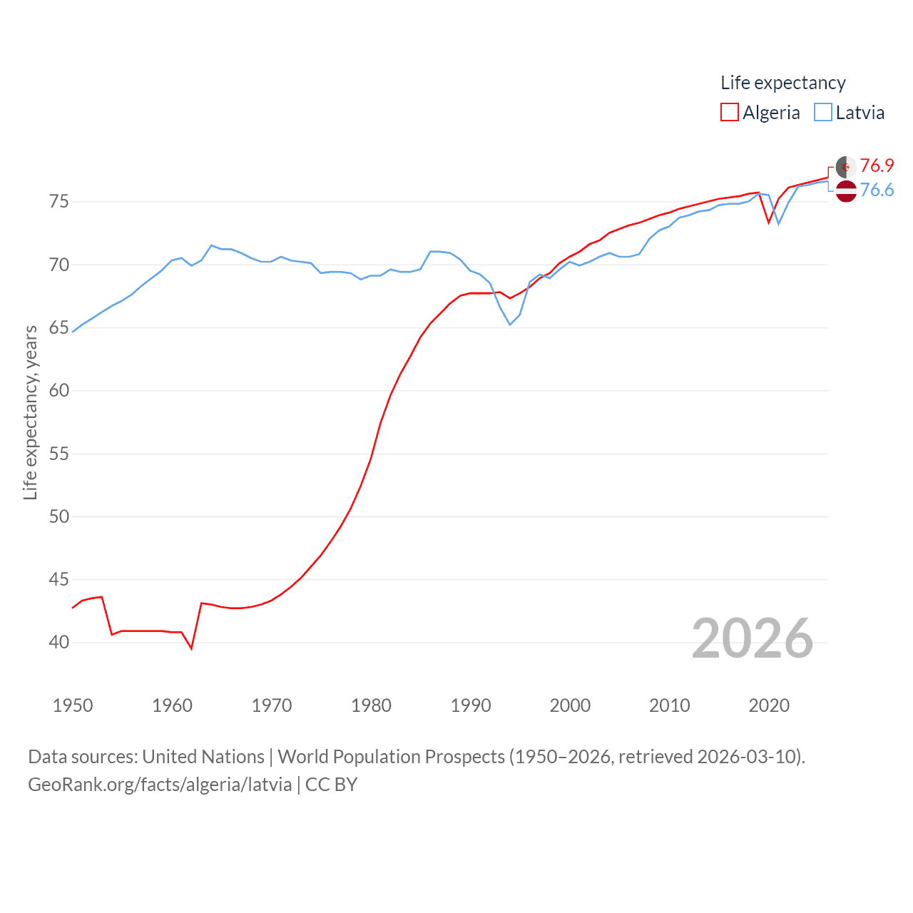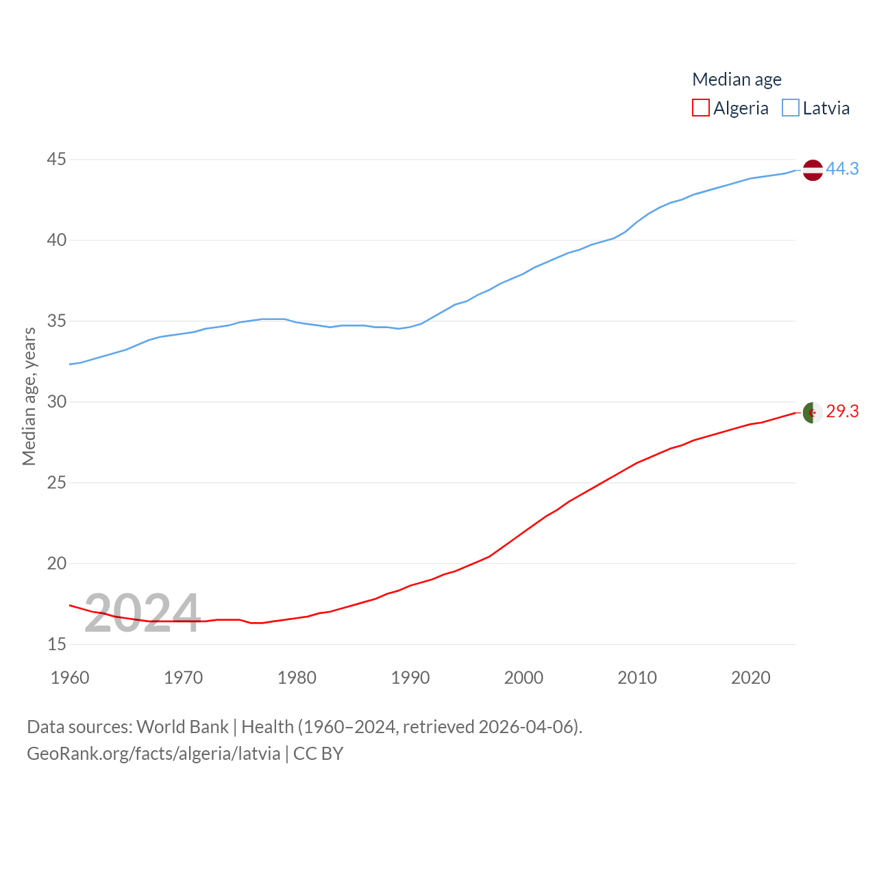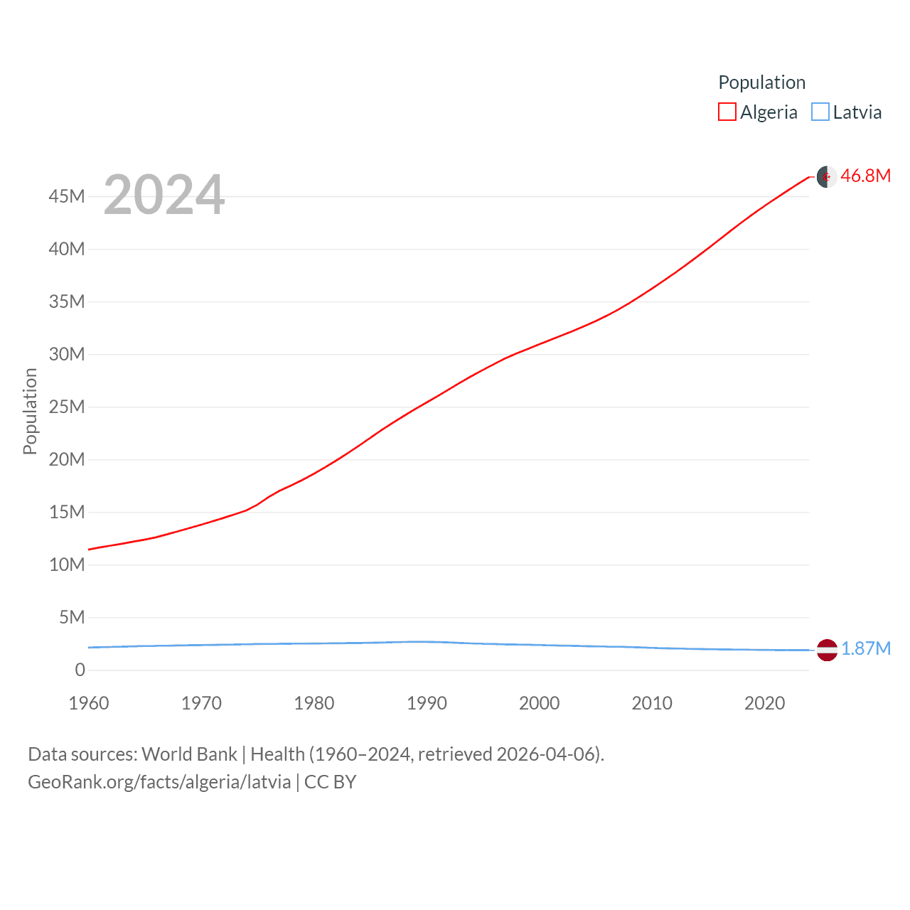 Algeria has a population of 46.8M (ranked 33/197), compared with 1.87M in Latvia (ranked 149/197). Algeria's land area is 919,595 sq mi versus 24,027 sq mi for Latvia (ranked 10th vs. 121st).