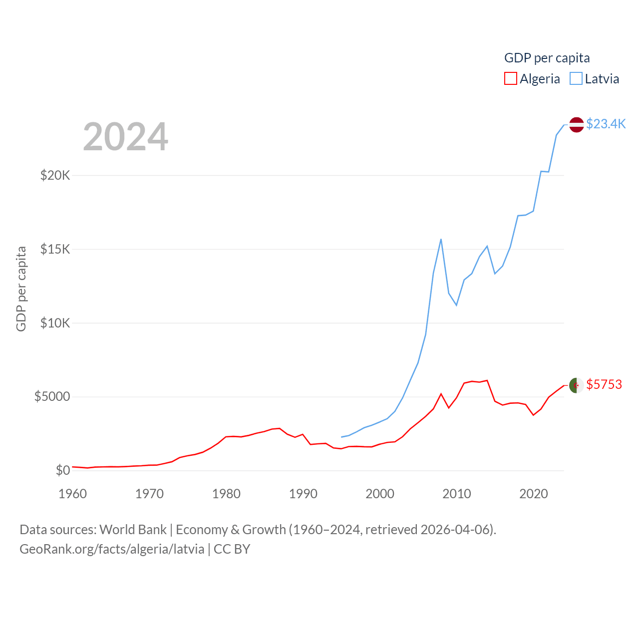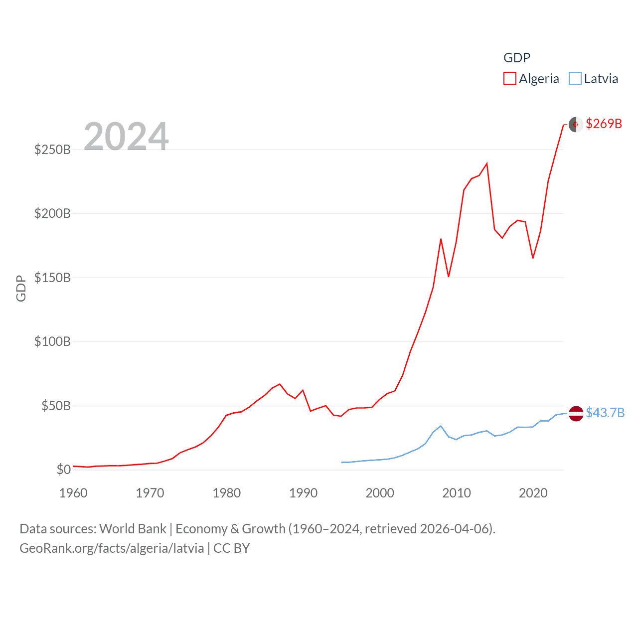 By GDP, Algeria ranks 51/197 ($269B) and Latvia ranks 99/197 ($43.7B). By GDP per capita, Algeria ranks 114/197 ($5,753), while Latvia ranks 54/197 ($23,409).