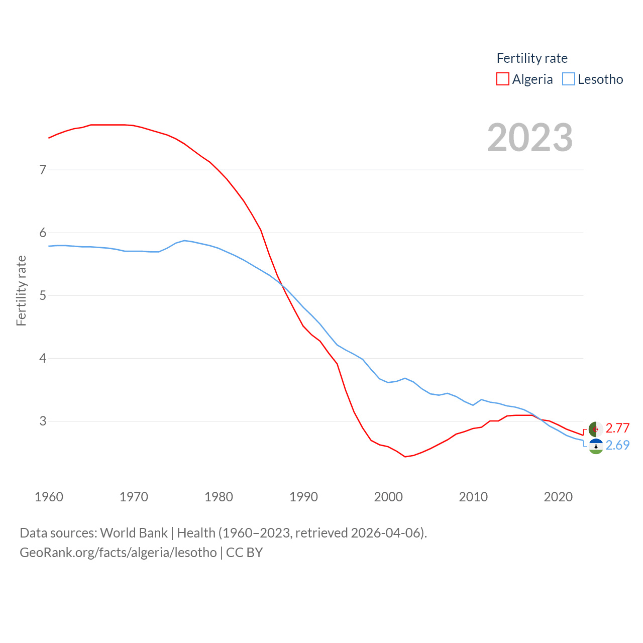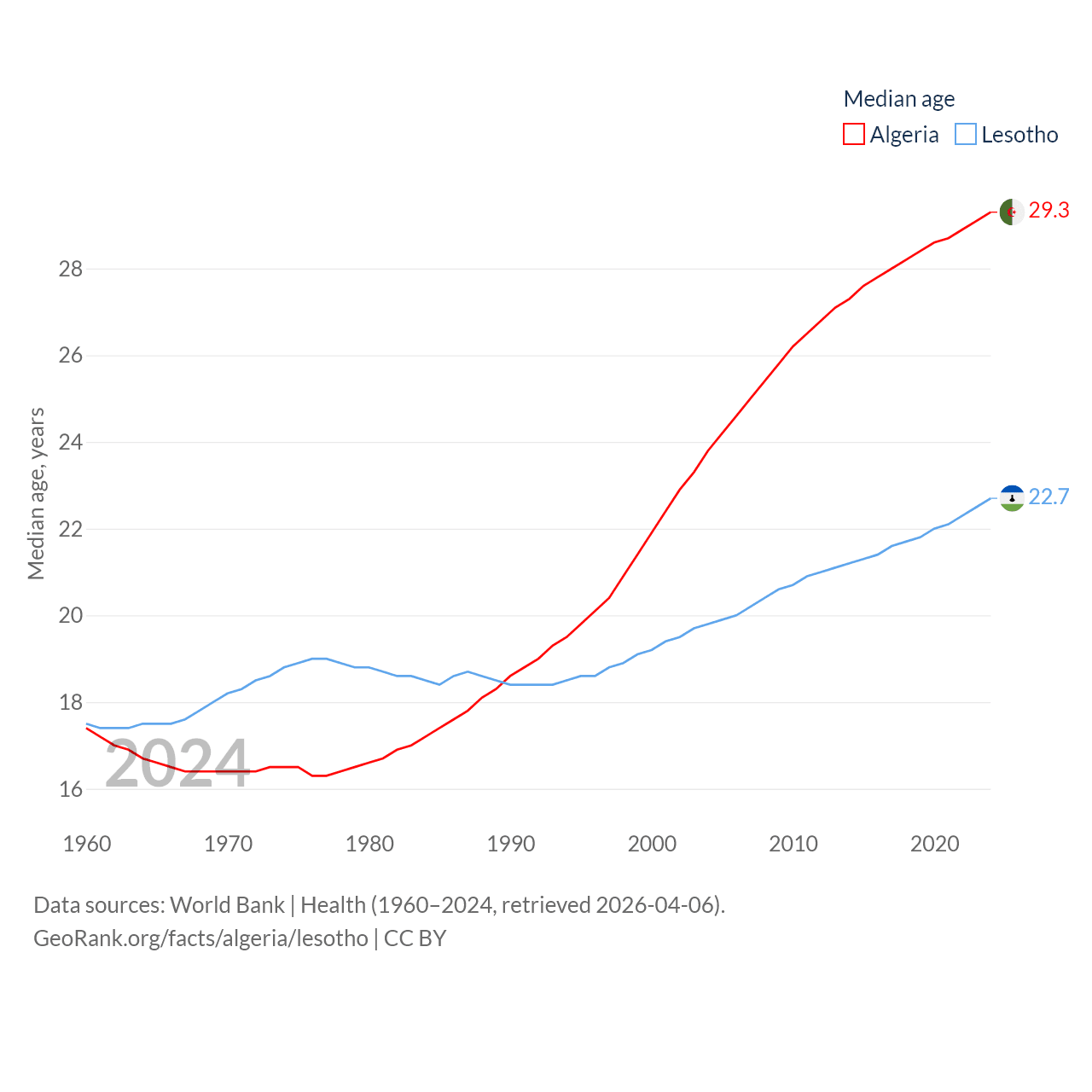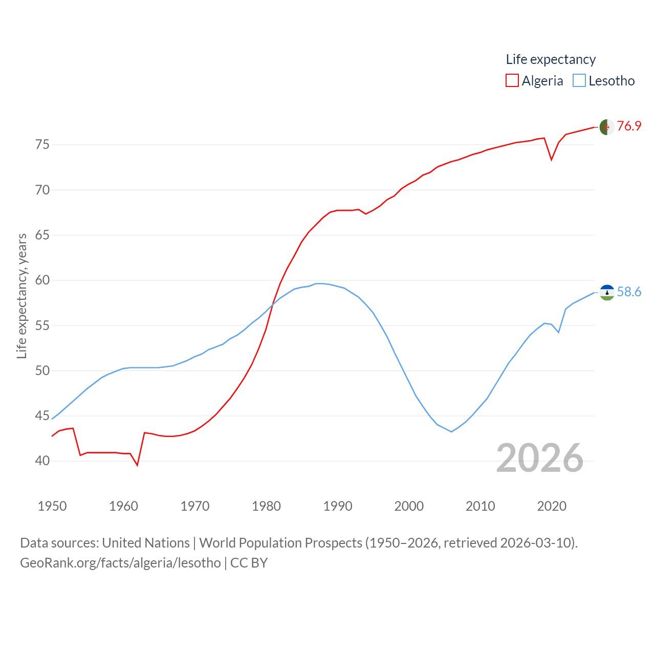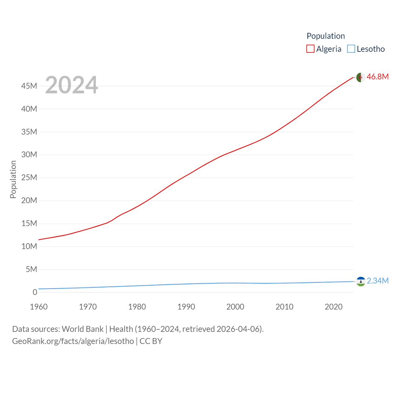 Algeria has a population of 46.8M (ranked 33/197), compared with 2.34M in Lesotho (ranked 145/197). Algeria's land area is 919,595 sq mi versus 11,722 sq mi for Lesotho (ranked 10th vs. 137th).