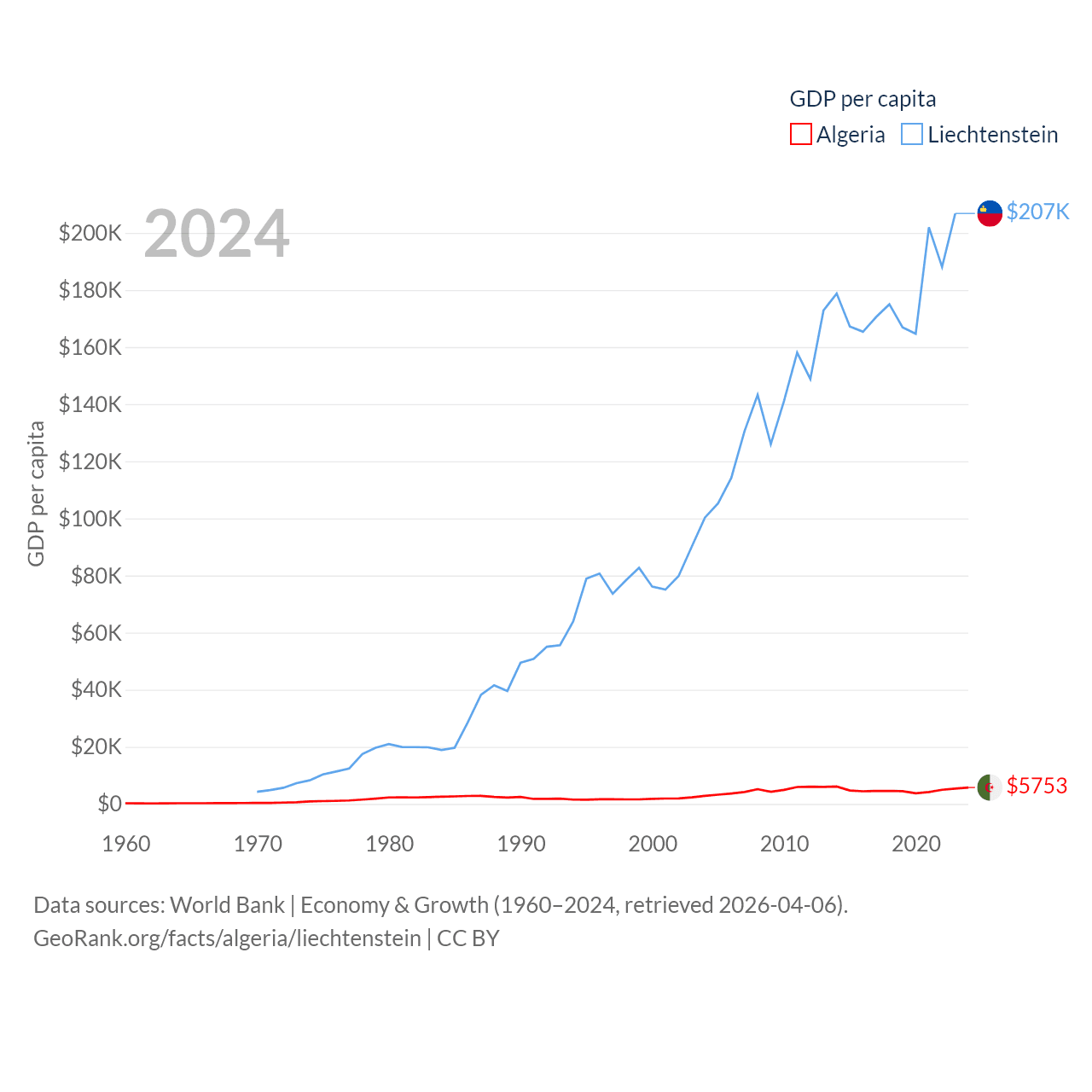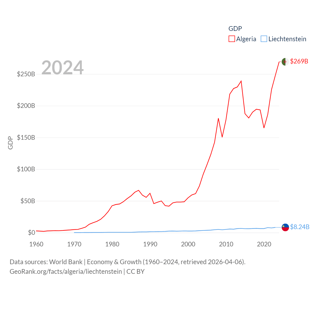 By GDP, Algeria ranks 51/197 ($269B) and Liechtenstein ranks 156/197 ($8.24B). By GDP per capita, Algeria ranks 114/197 ($5,753), while Liechtenstein ranks 2/197 ($206,781).