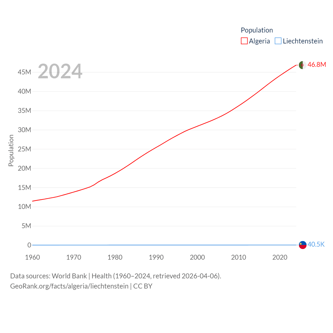 Algeria has a population of 46.8M (ranked 33/197), compared with 40.4K in Liechtenstein (ranked 190/197). Algeria's land area is 919,595 sq mi versus 61.8 sq mi for Liechtenstein (ranked 10th vs. 192nd).