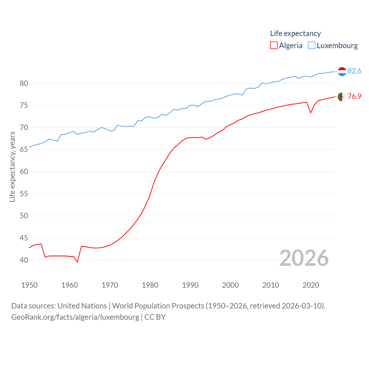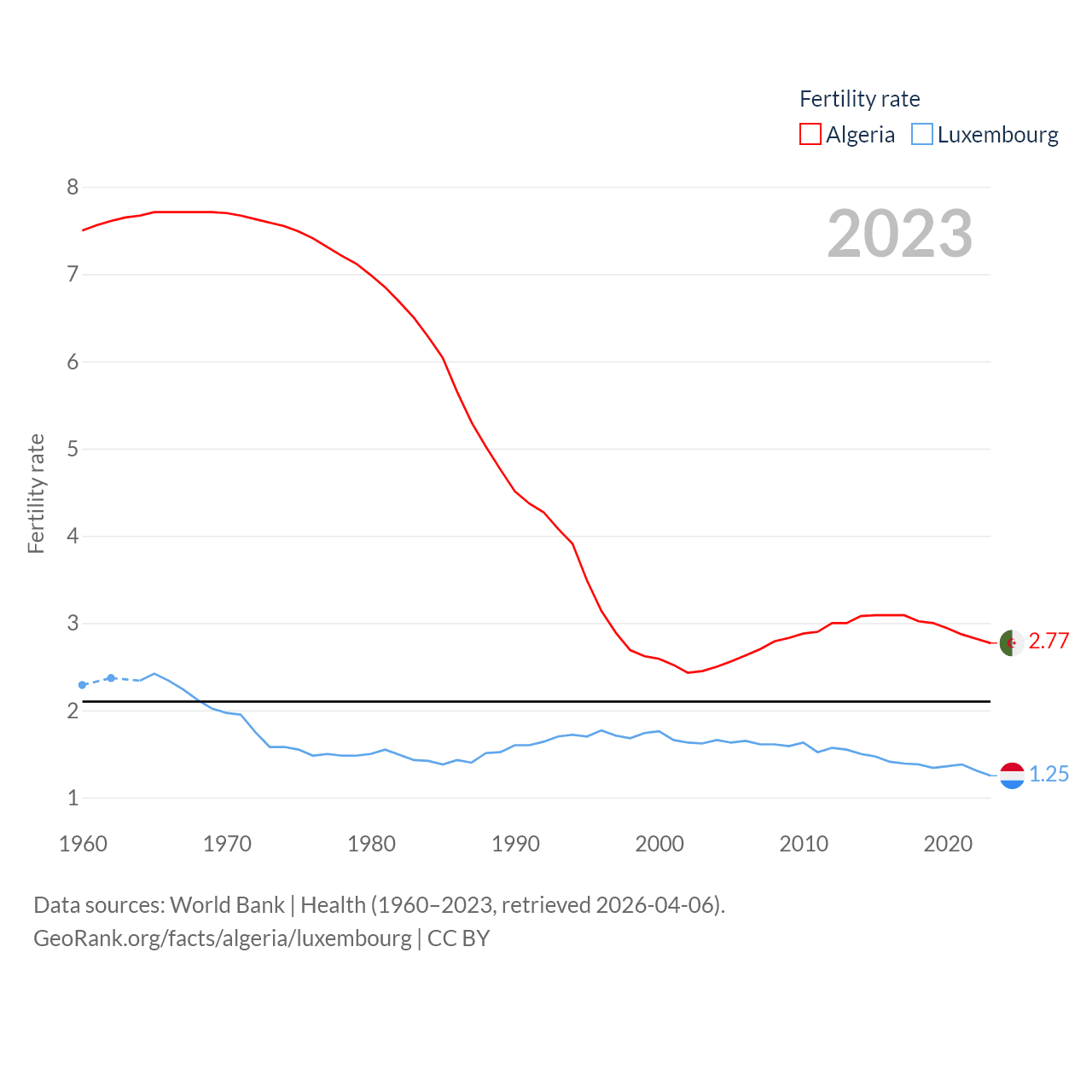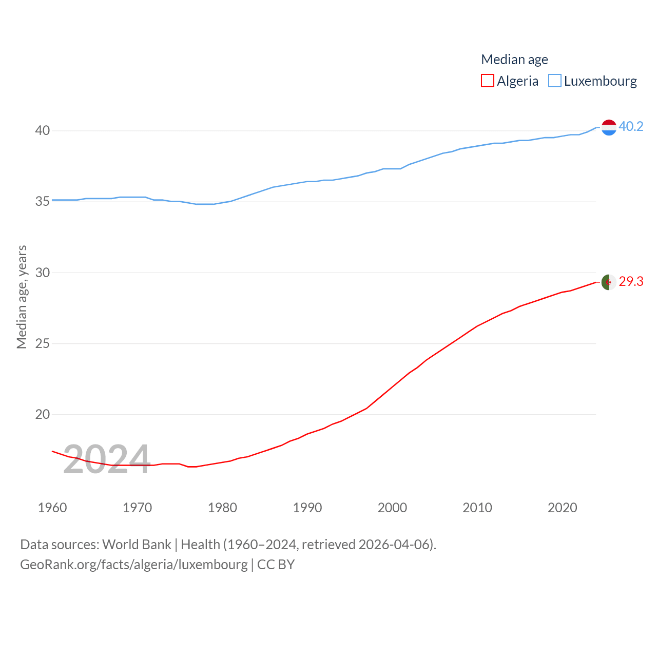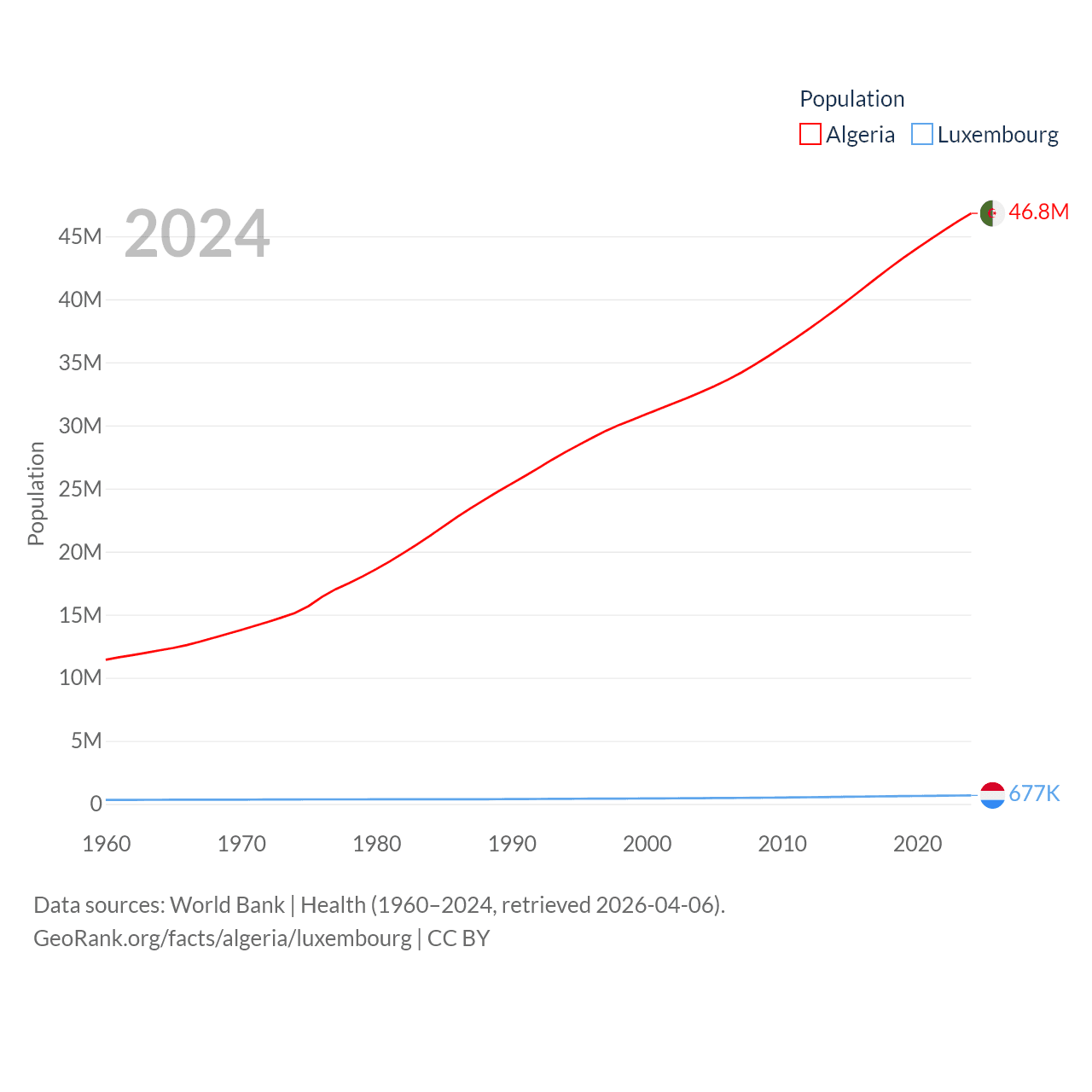Algeria has a population of 46.8M (ranked 33/197), compared with 677K in Luxembourg (ranked 164/197). Algeria's land area is 919,595 sq mi versus 994 sq mi for Luxembourg (ranked 10th vs. 169th).