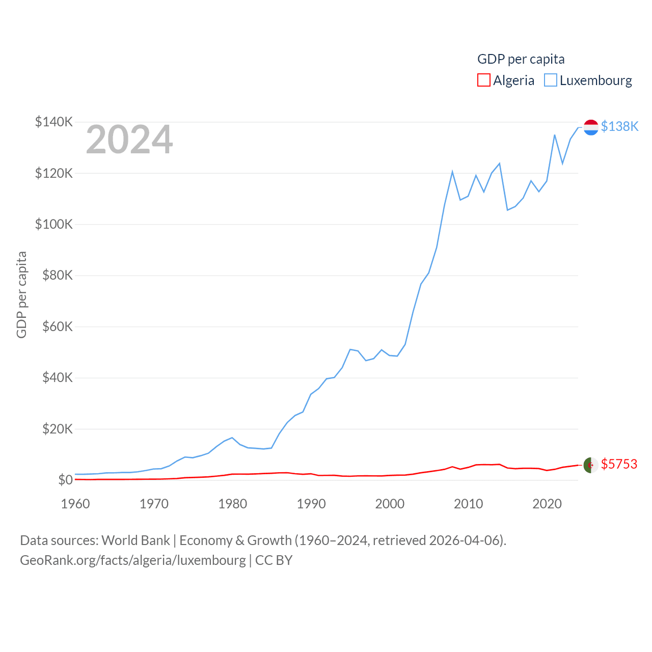 By GDP, Algeria ranks 51/197 ($269B) and Luxembourg ranks 74/197 ($93.3B). By GDP per capita, Algeria ranks 114/197 ($5,753), while Luxembourg ranks 3/197 ($137,782).