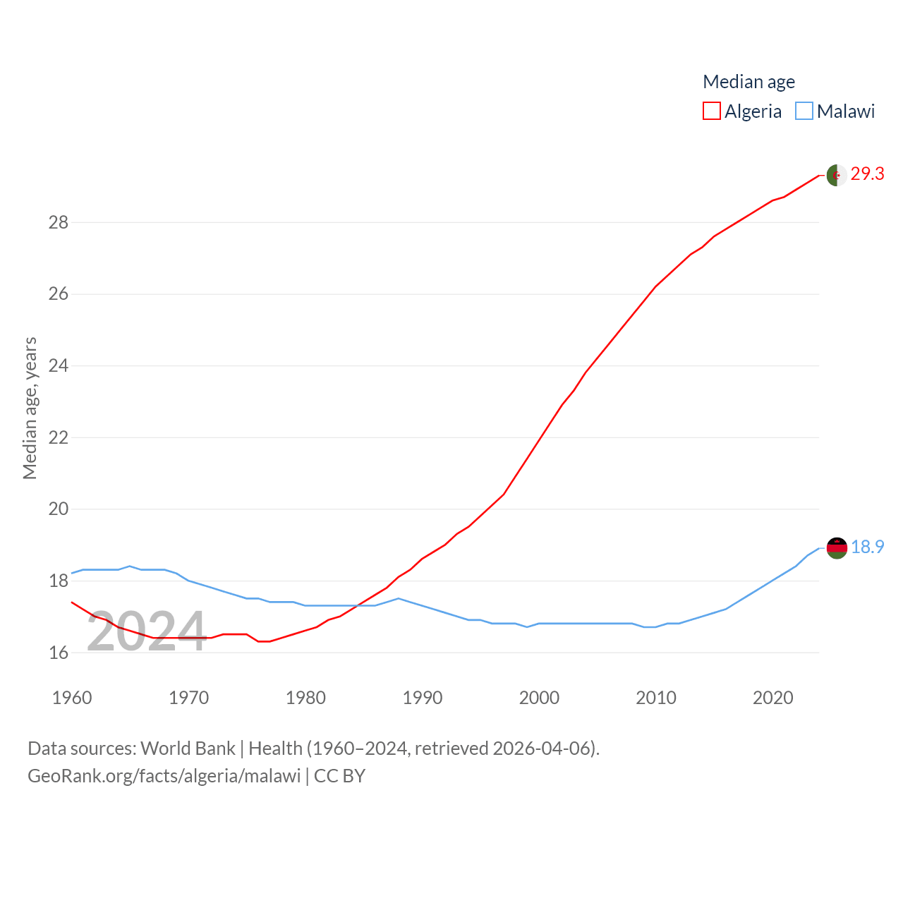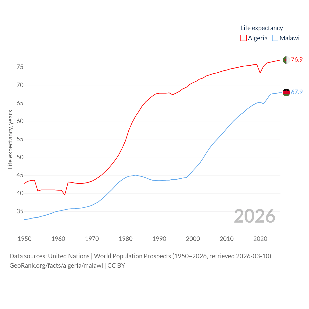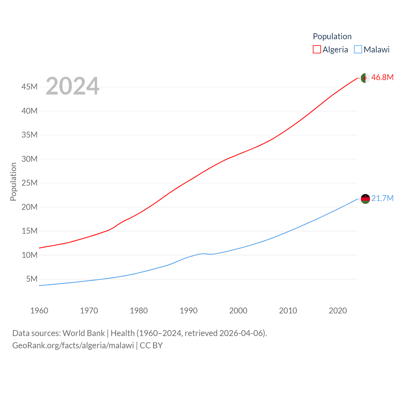 Algeria has a population of 46.8M (ranked 33/197), compared with 21.7M in Malawi (ranked 62/197). Algeria's land area is 919,595 sq mi versus 36,402 sq mi for Malawi (ranked 10th vs. 107th).
