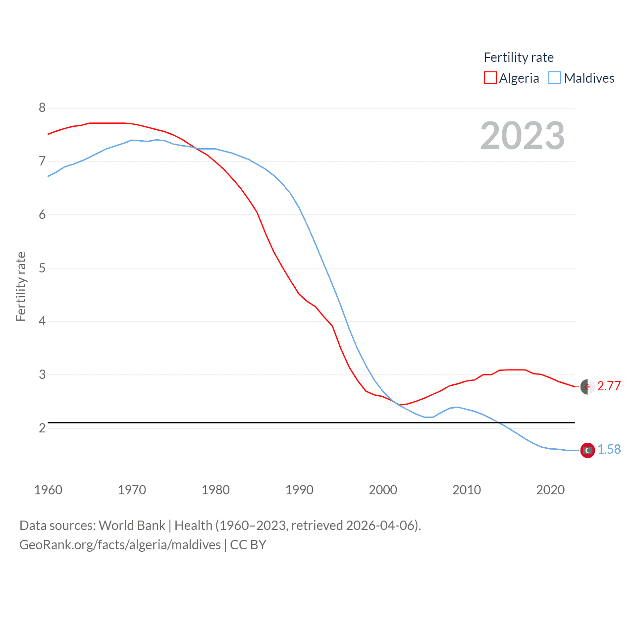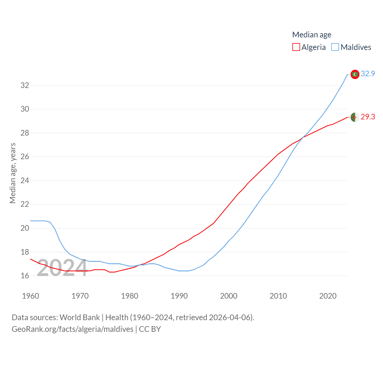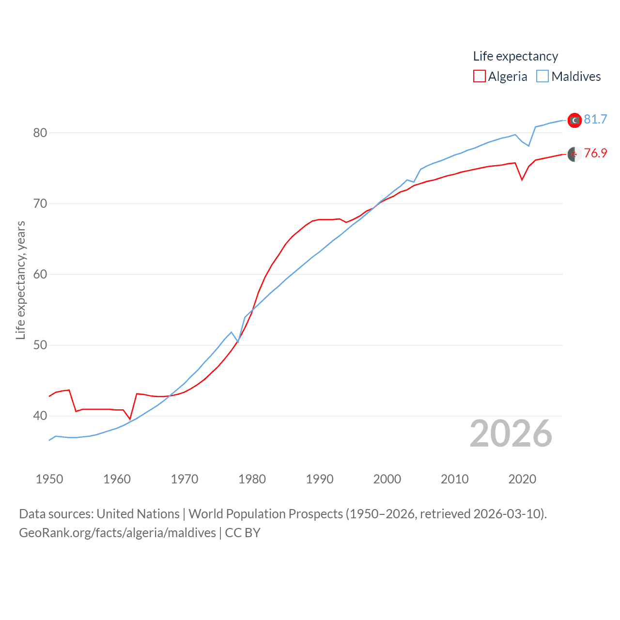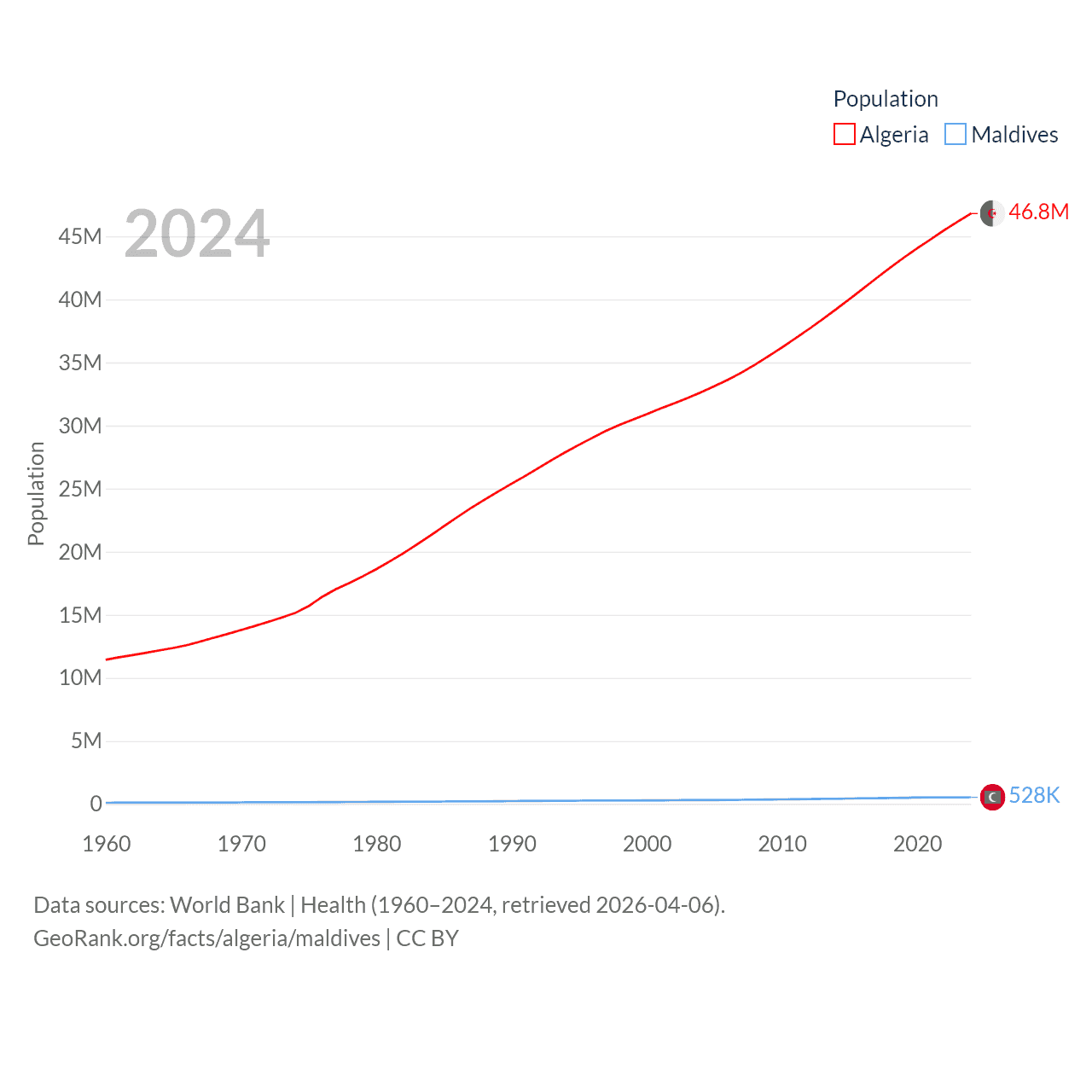Algeria has a population of 46.8M (ranked 33/197), compared with 528K in Maldives (ranked 168/197). Algeria's land area is 919,595 sq mi versus 115.1 sq mi for Maldives (ranked 10th vs. 188th).