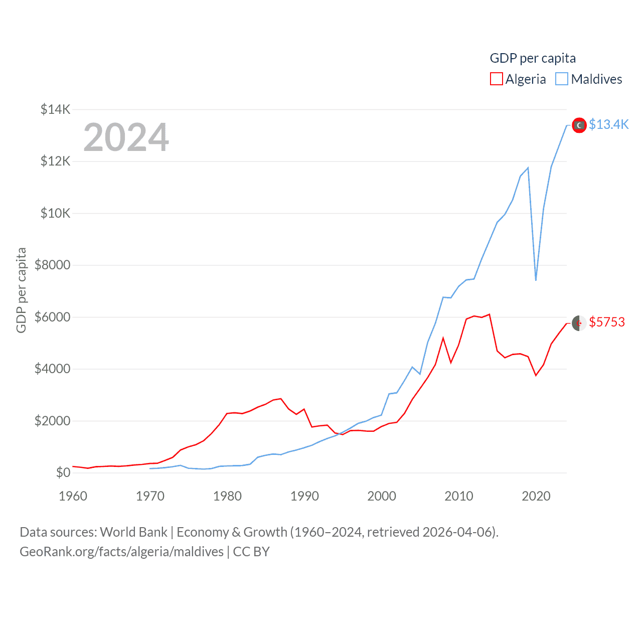 By GDP, Algeria ranks 51/197 ($269B) and Maldives ranks 159/197 ($7.06B). By GDP per capita, Algeria ranks 114/197 ($5,753), while Maldives ranks 75/197 ($13,379).