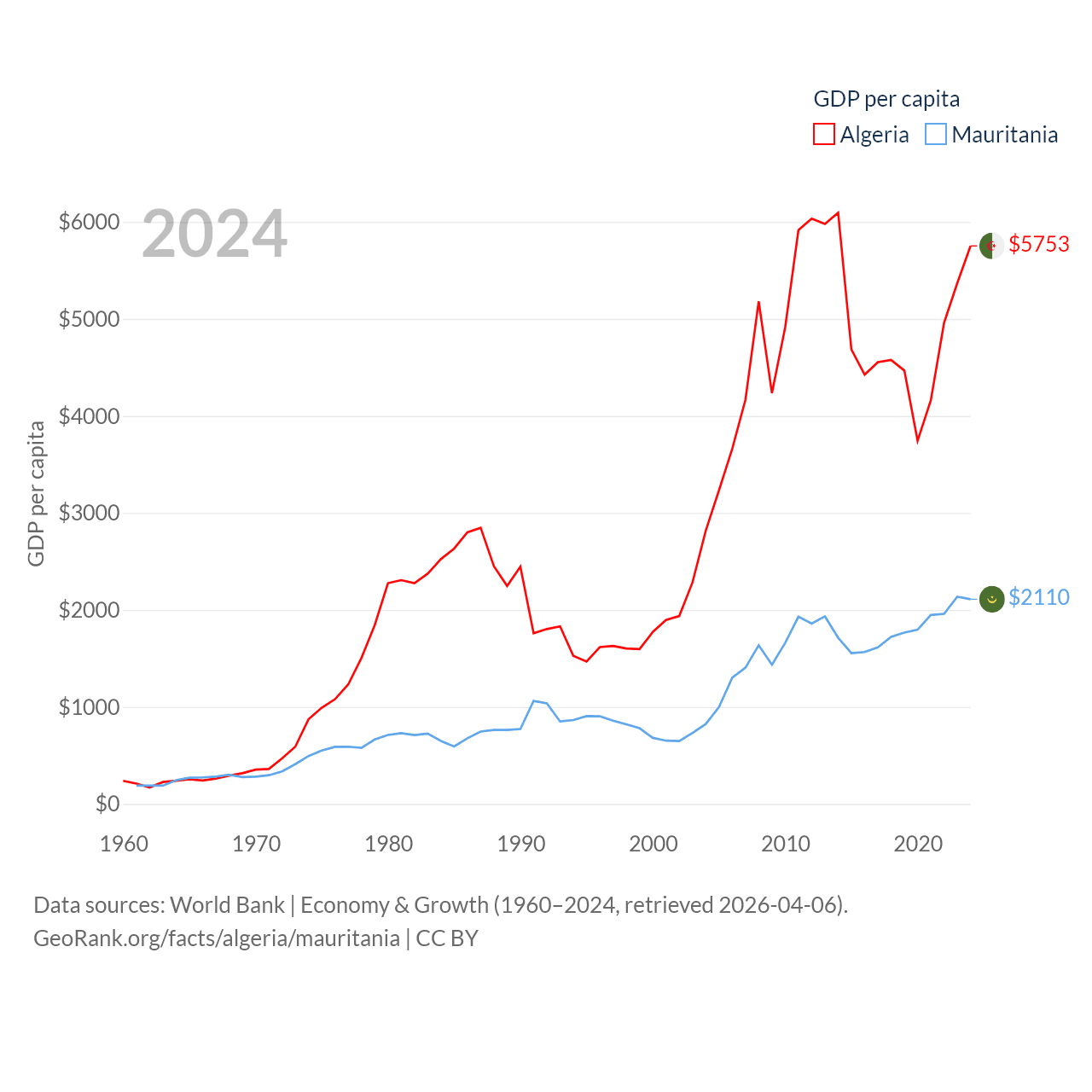 By GDP, Algeria ranks 51/197 ($269B) and Mauritania ranks 153/197 ($10.9B). By GDP per capita, Algeria ranks 114/197 ($5,753), while Mauritania ranks 156/197 ($2,110).