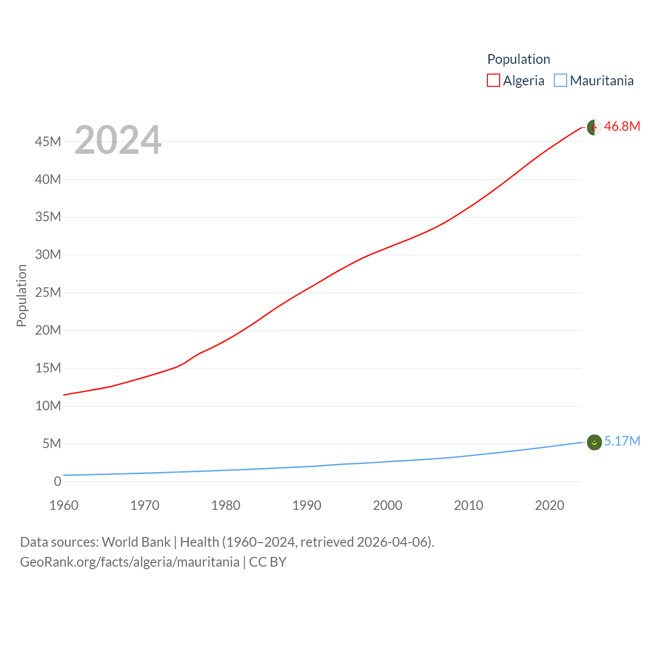 Algeria has a population of 46.8M (ranked 33/197), compared with 5.17M in Mauritania (ranked 125/197). Algeria's land area is 919,595 sq mi versus 397,955 sq mi for Mauritania (ranked 10th vs. 28th).
