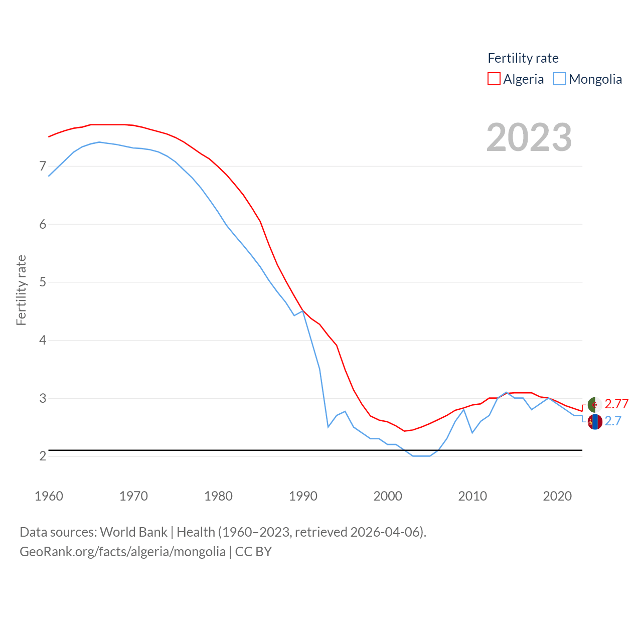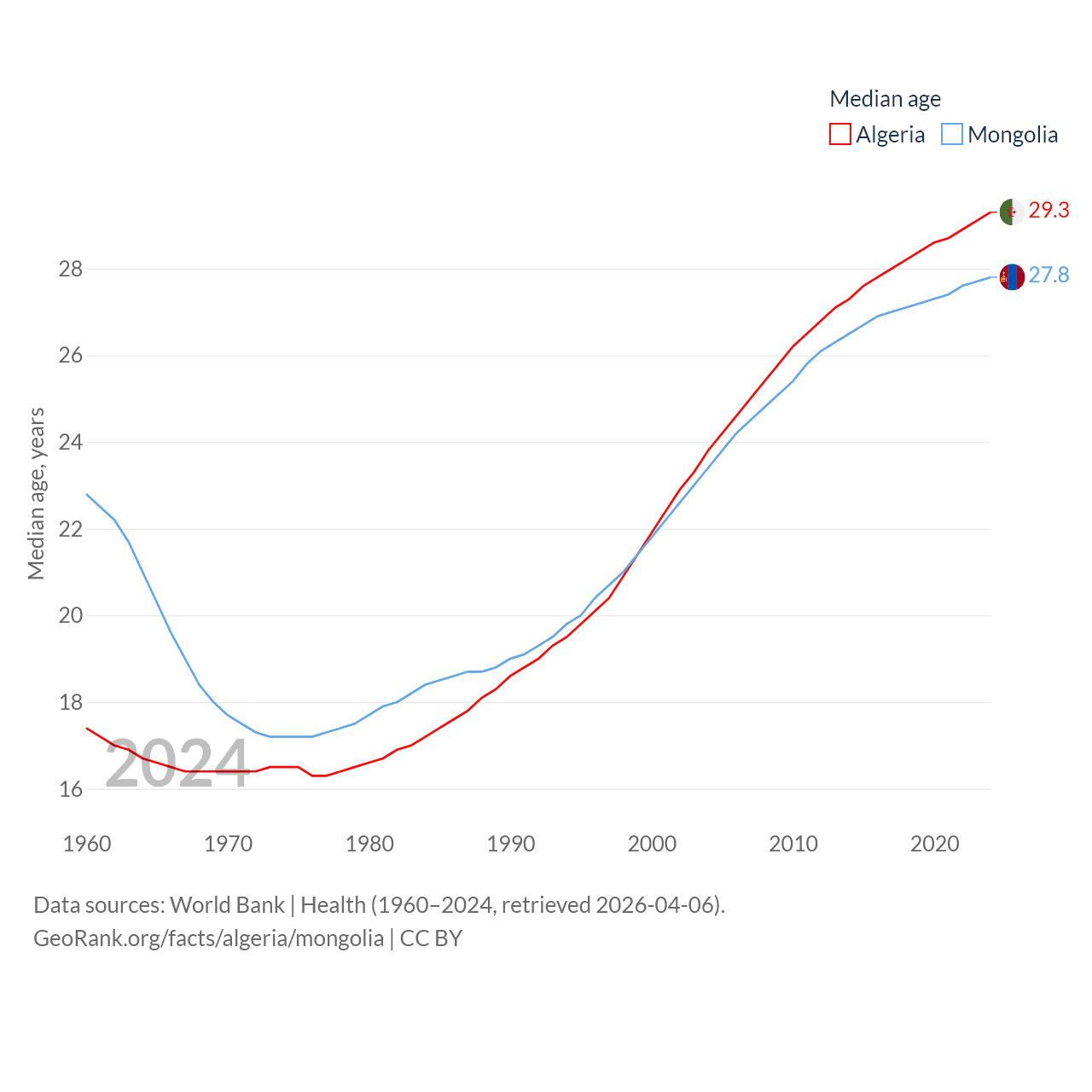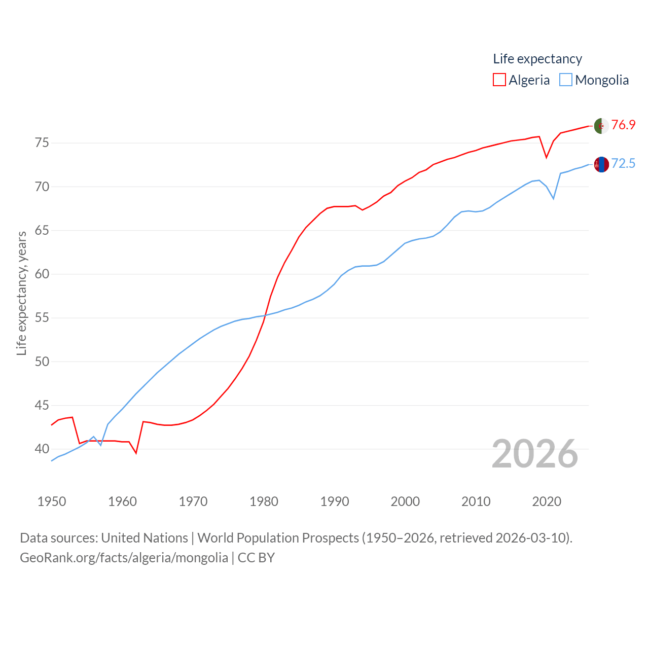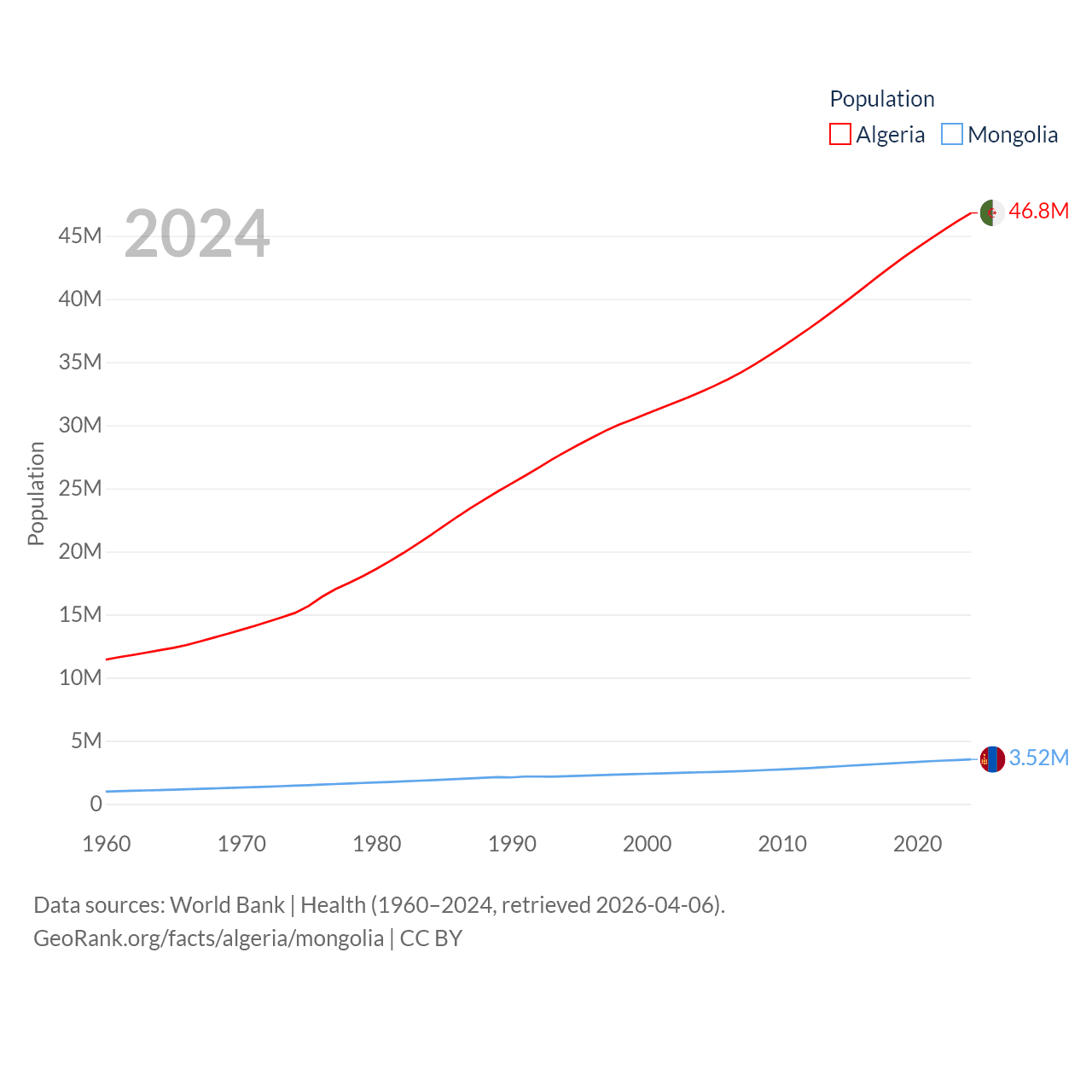 Algeria has a population of 46.8M (ranked 33/197), compared with 3.52M in Mongolia (ranked 132/197). Algeria's land area is 919,595 sq mi versus 601,740 sq mi for Mongolia (ranked 10th vs. 18th).