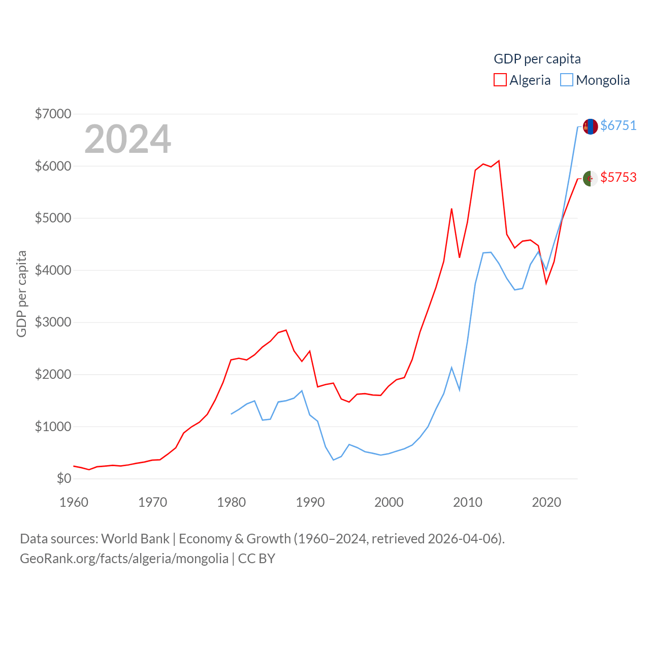 By GDP, Algeria ranks 51/197 ($269B) and Mongolia ranks 121/197 ($23.8B). By GDP per capita, Algeria ranks 114/197 ($5,753), while Mongolia ranks 105/197 ($6,751).