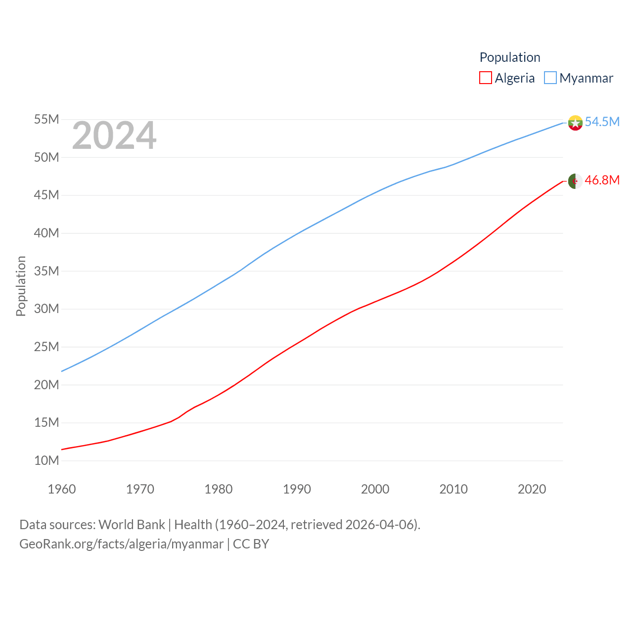 Algeria has a population of 46.8M (ranked 33/197), compared with 54.5M in Myanmar (ranked 27/197). Algeria's land area is 919,595 sq mi versus 251,997 sq mi for Myanmar (ranked 10th vs. 39th).