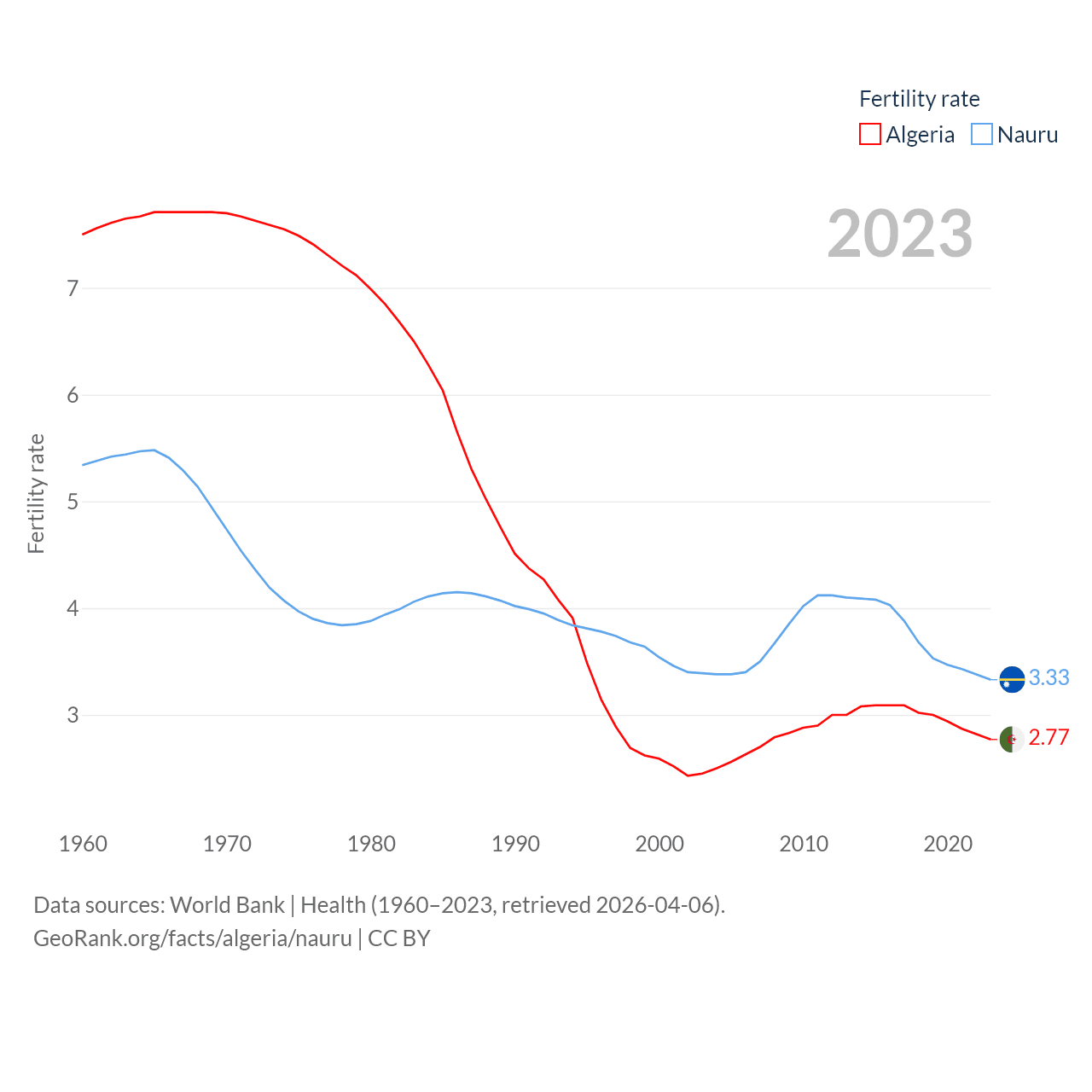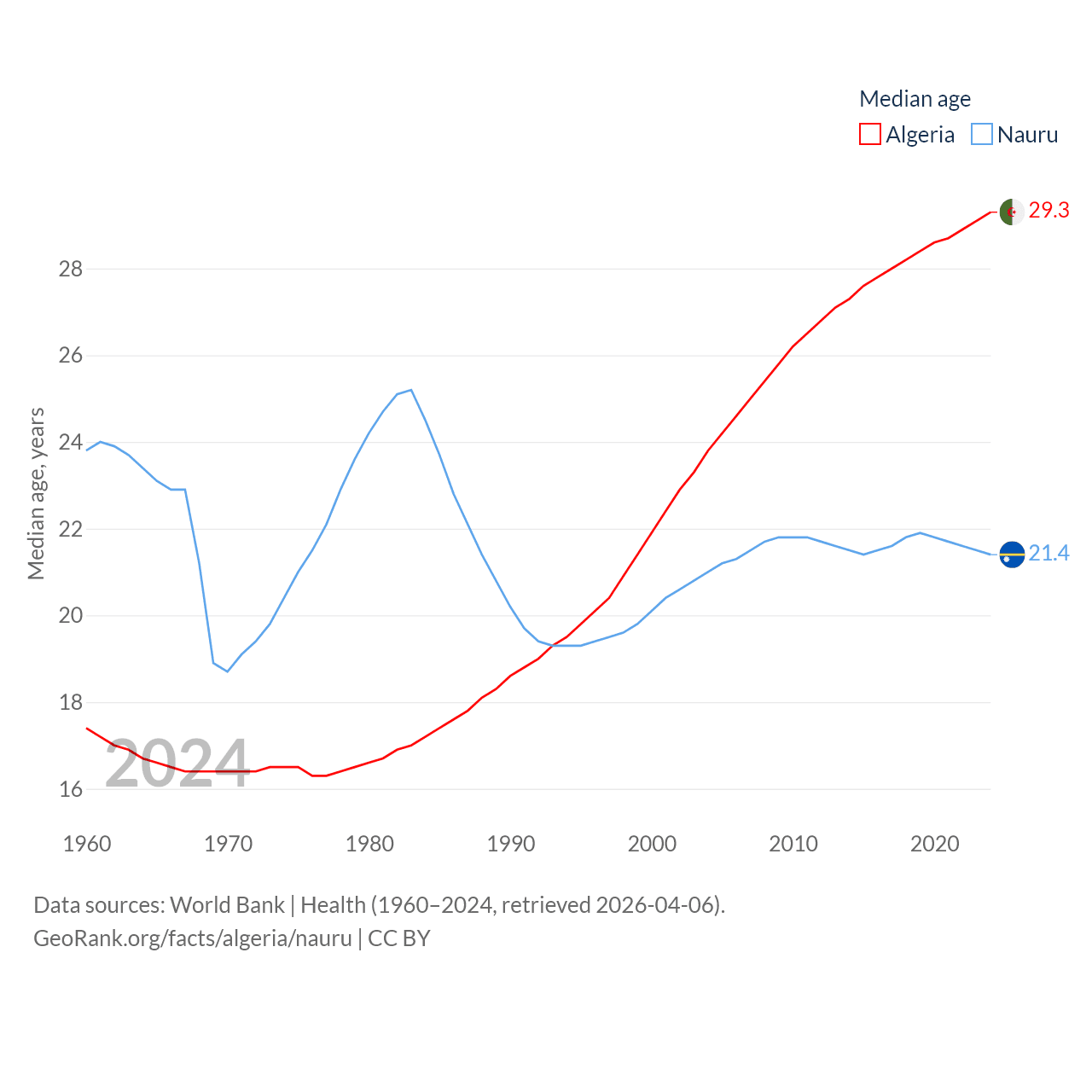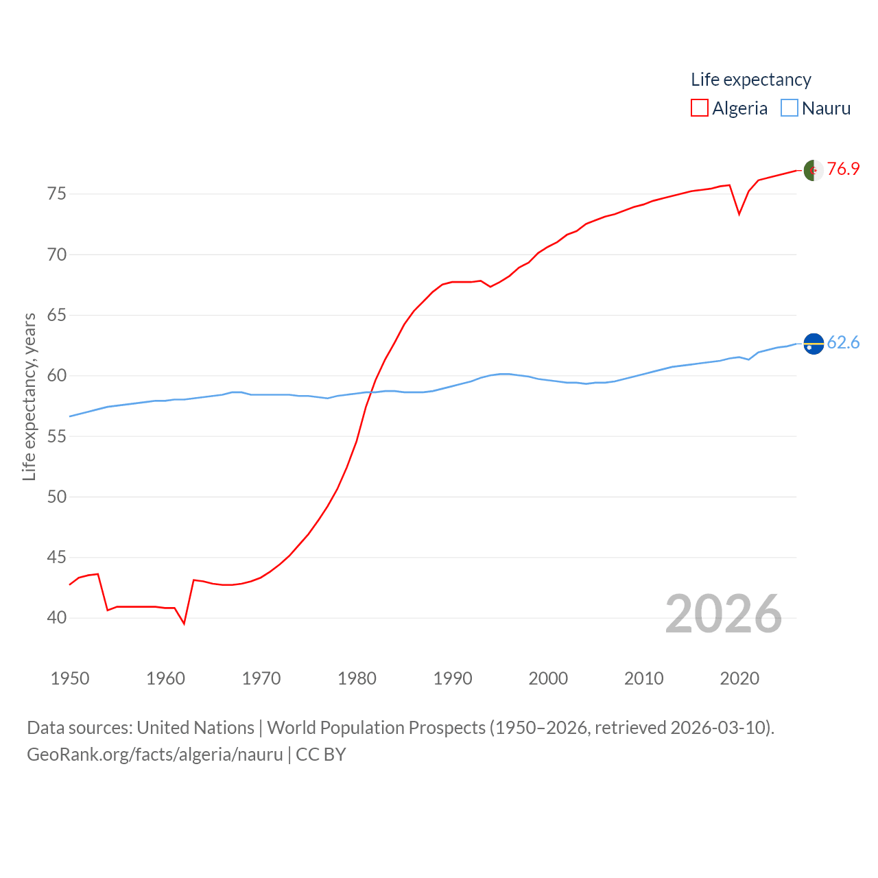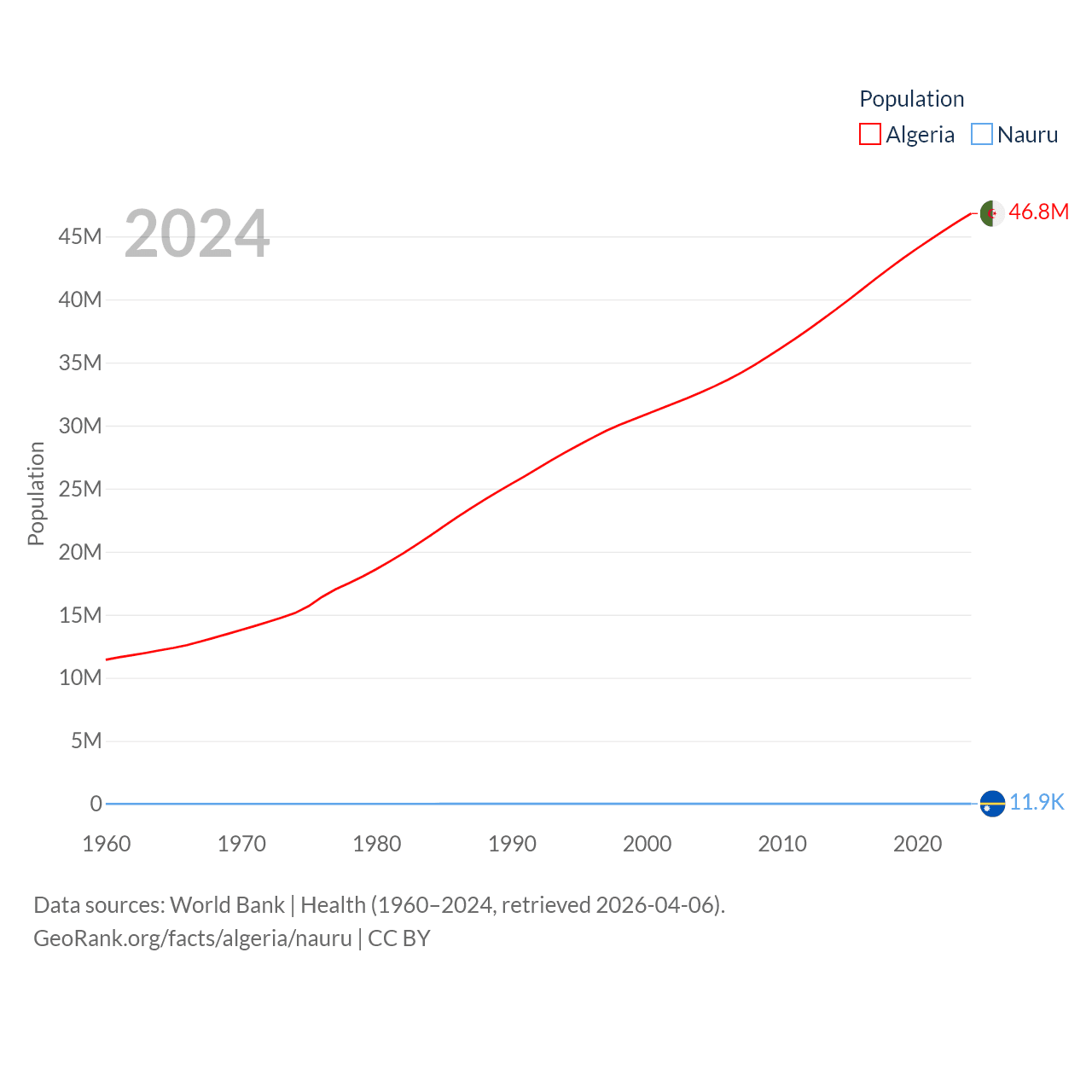 Algeria has a population of 46.8M (ranked 33/197), compared with 11.9K in Nauru (ranked 195/197). Algeria's land area is 919,595 sq mi versus 7.72 sq mi for Nauru (ranked 10th vs. 195th).