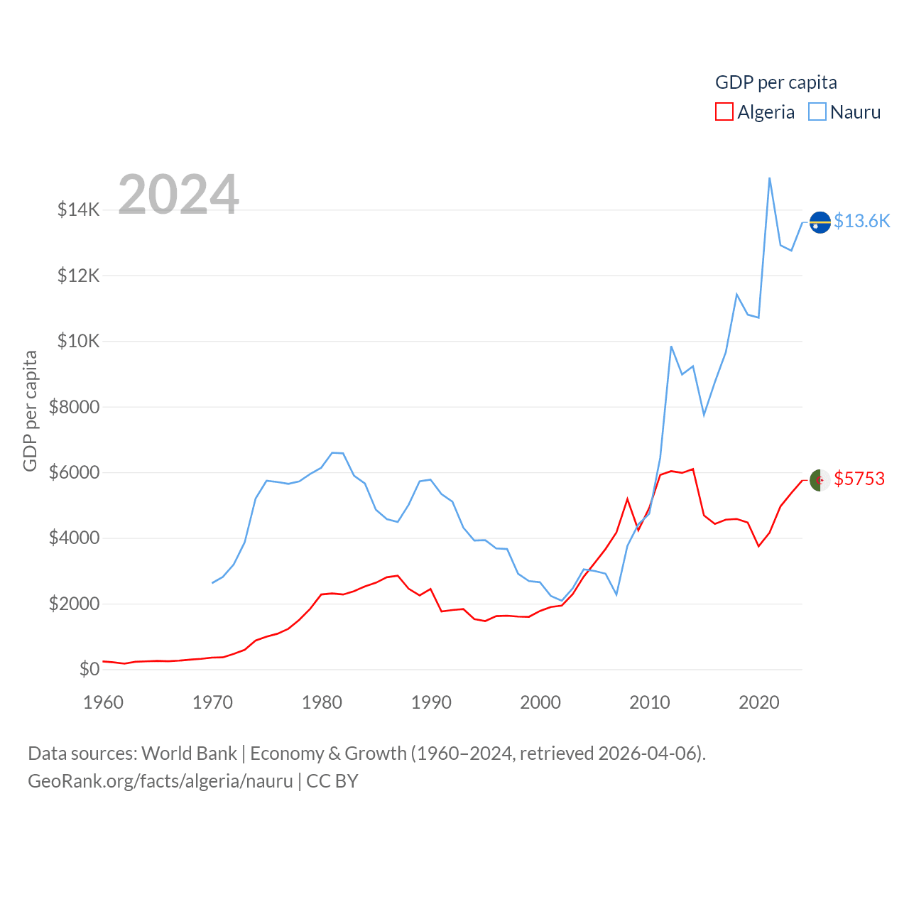 By GDP, Algeria ranks 51/197 ($269B) and Nauru ranks 195/197 ($163M). By GDP per capita, Algeria ranks 114/197 ($5,753), while Nauru ranks 74/197 ($13,609).