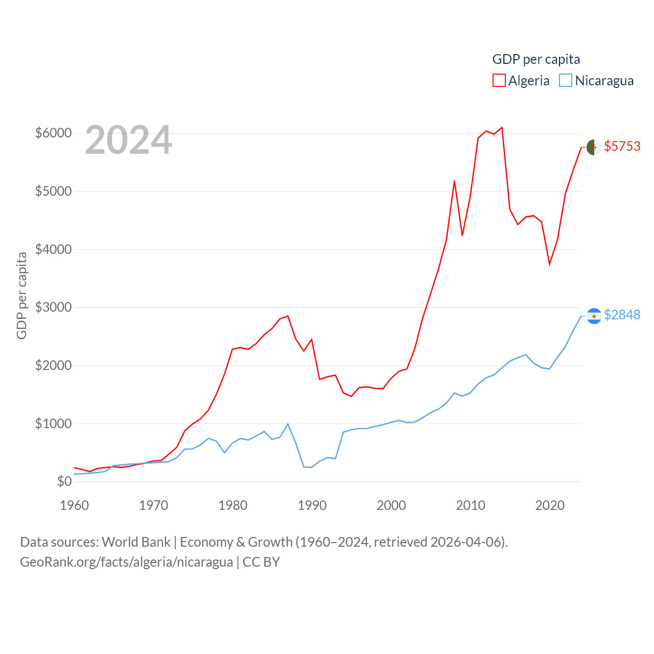 By GDP, Algeria ranks 51/197 ($269B) and Nicaragua ranks 131/197 ($19.7B). By GDP per capita, Algeria ranks 114/197 ($5,753), while Nicaragua ranks 141/197 ($2,848).