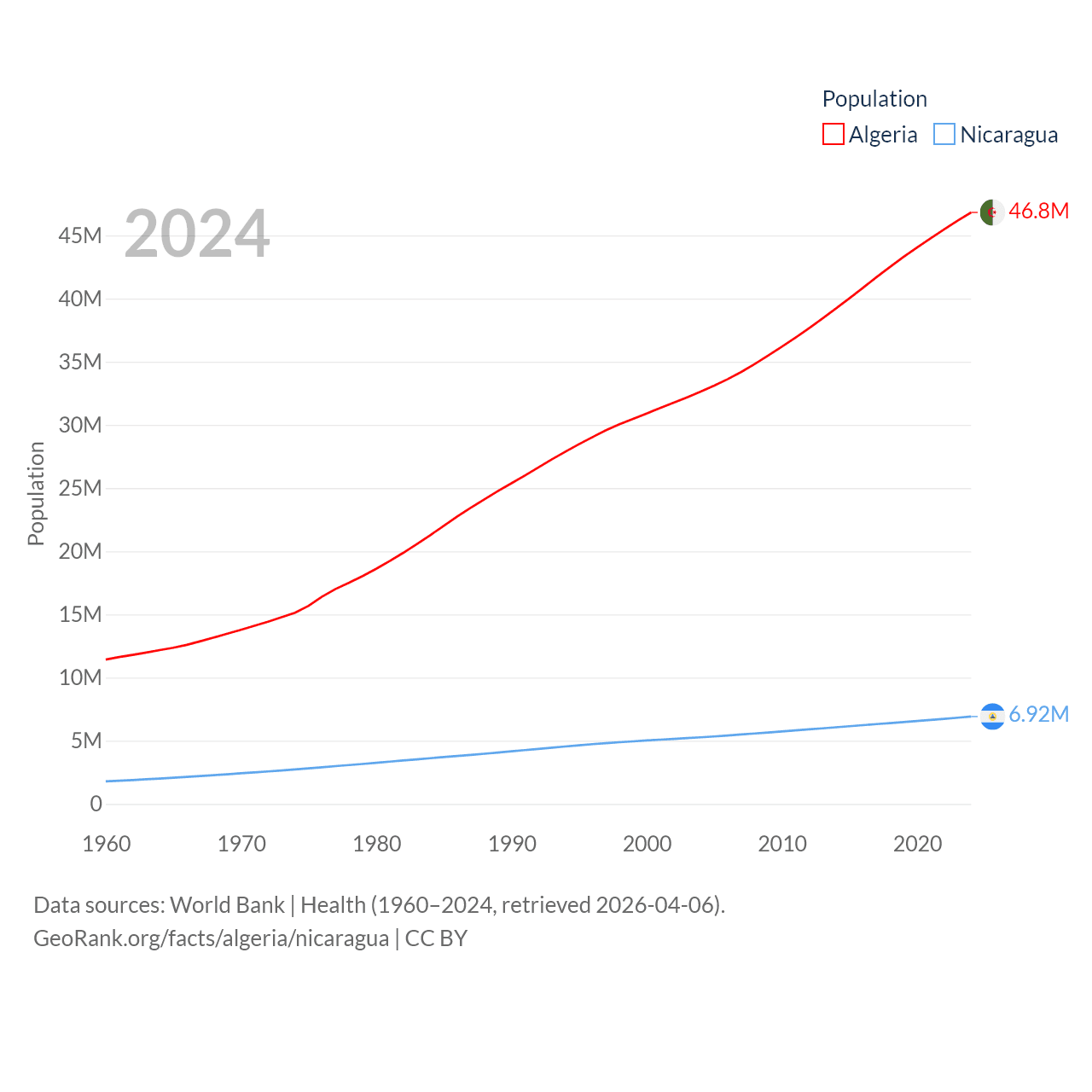 Algeria has a population of 46.8M (ranked 33/197), compared with 6.92M in Nicaragua (ranked 108/197). Algeria's land area is 919,595 sq mi versus 46,464 sq mi for Nicaragua (ranked 10th vs. 98th).