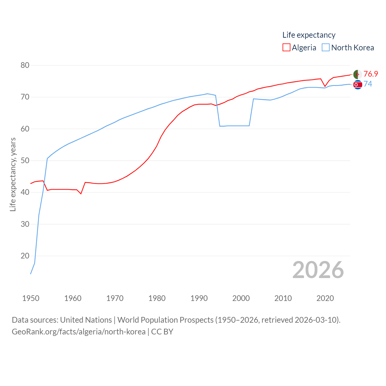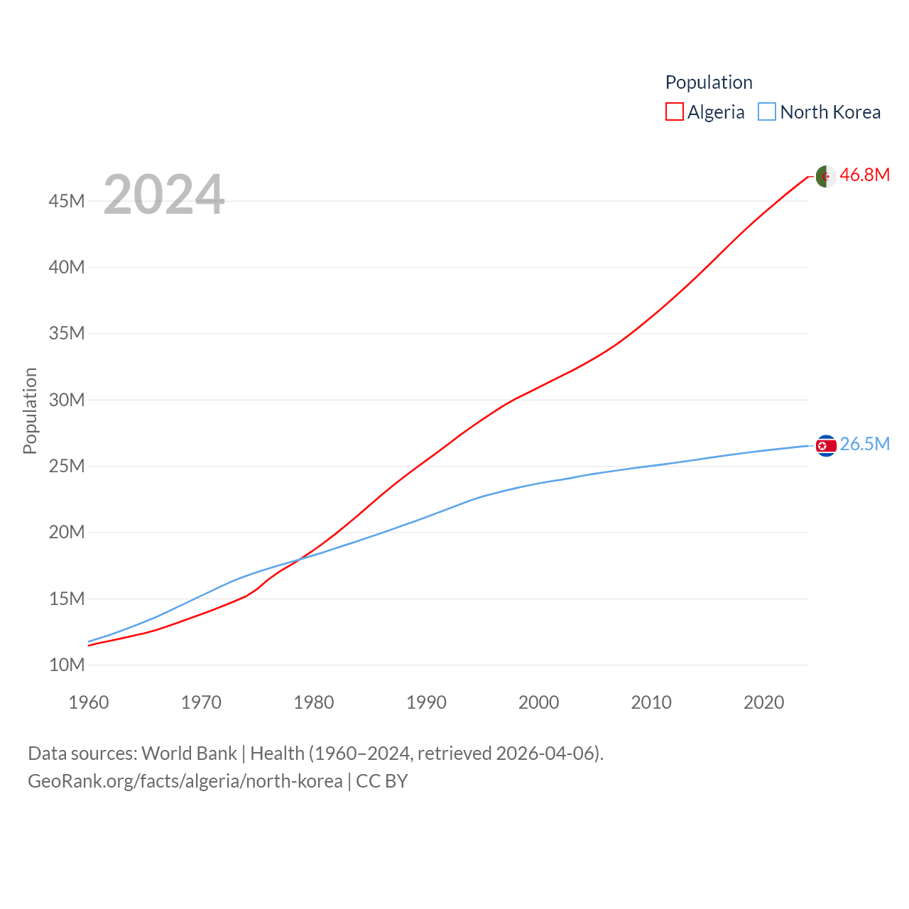 Algeria has a population of 46.8M (ranked 33/197), compared with 26.5M in North Korea (ranked 56/197). Algeria's land area is 919,595 sq mi versus 46,491 sq mi for North Korea (ranked 10th vs. 97th).