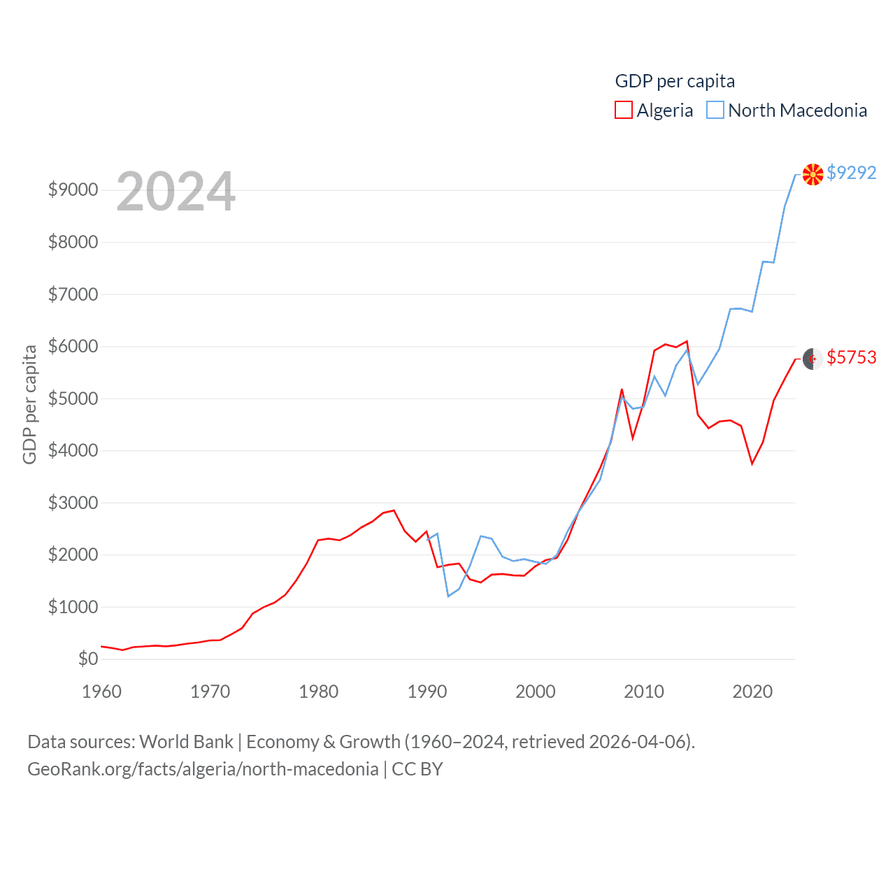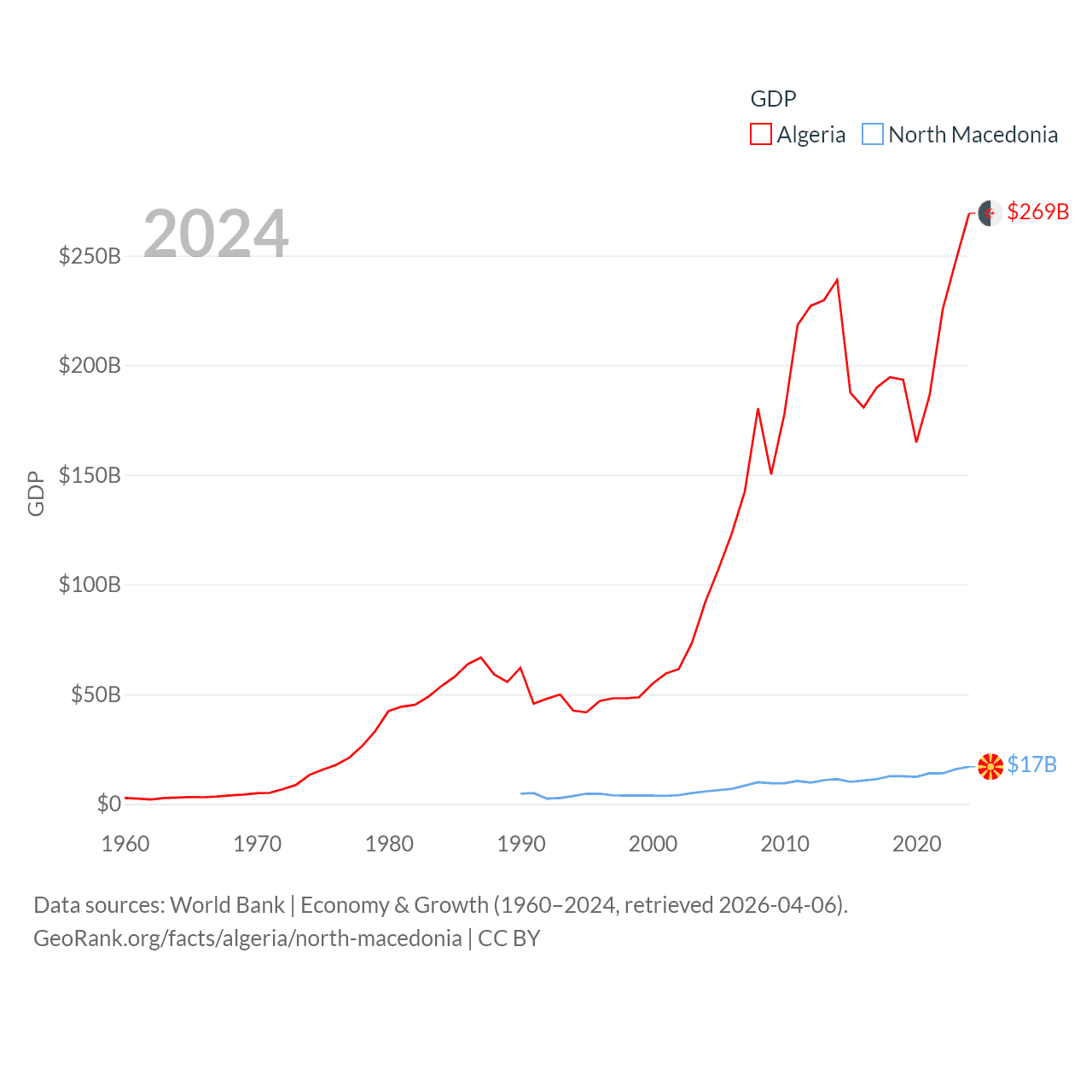 By GDP, Algeria ranks 51/197 ($269B) and North Macedonia ranks 138/197 ($17B). By GDP per capita, Algeria ranks 114/197 ($5,753), while North Macedonia ranks 88/197 ($9,292).