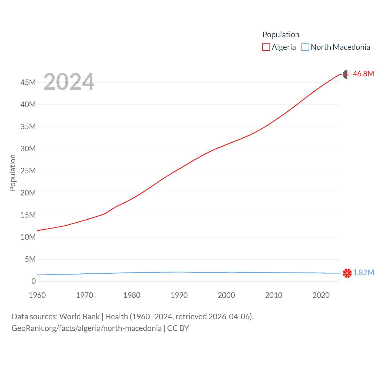 Algeria has a population of 46.8M (ranked 33/197), compared with 1.82M in North Macedonia (ranked 150/197). Algeria's land area is 919,595 sq mi versus 9,737 sq mi for North Macedonia (ranked 10th vs. 145th).