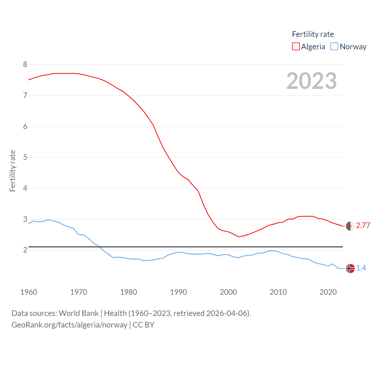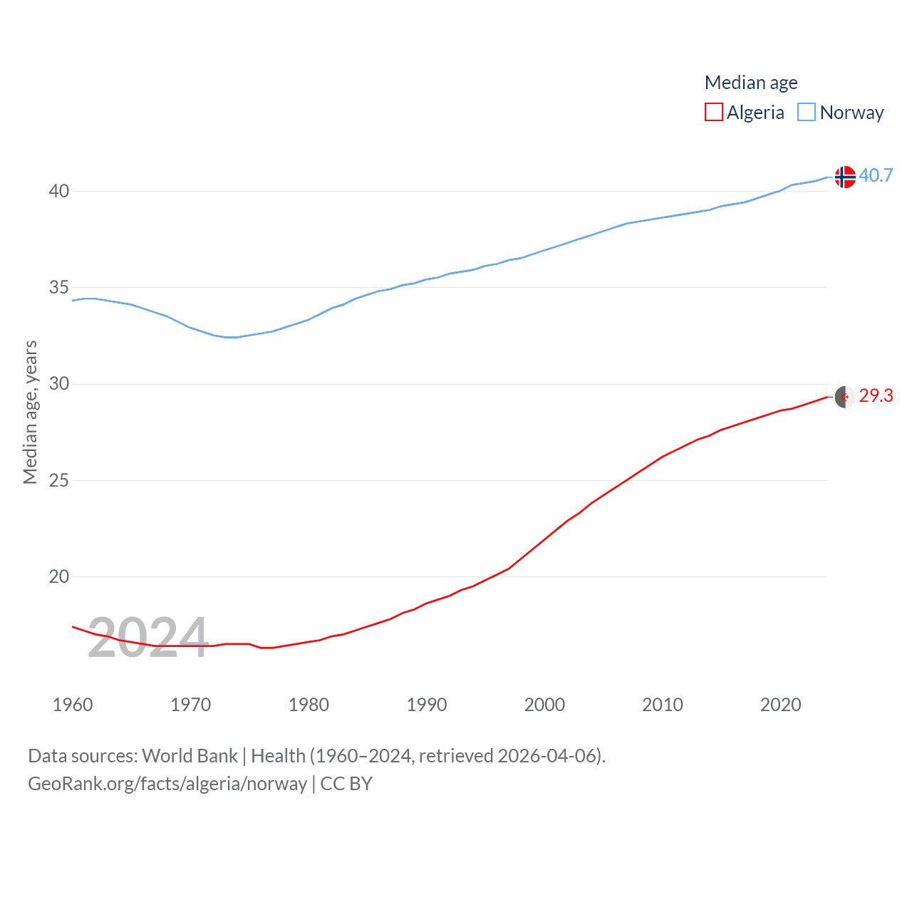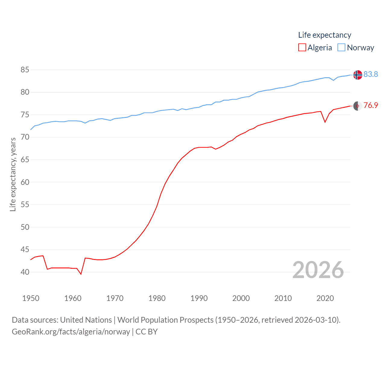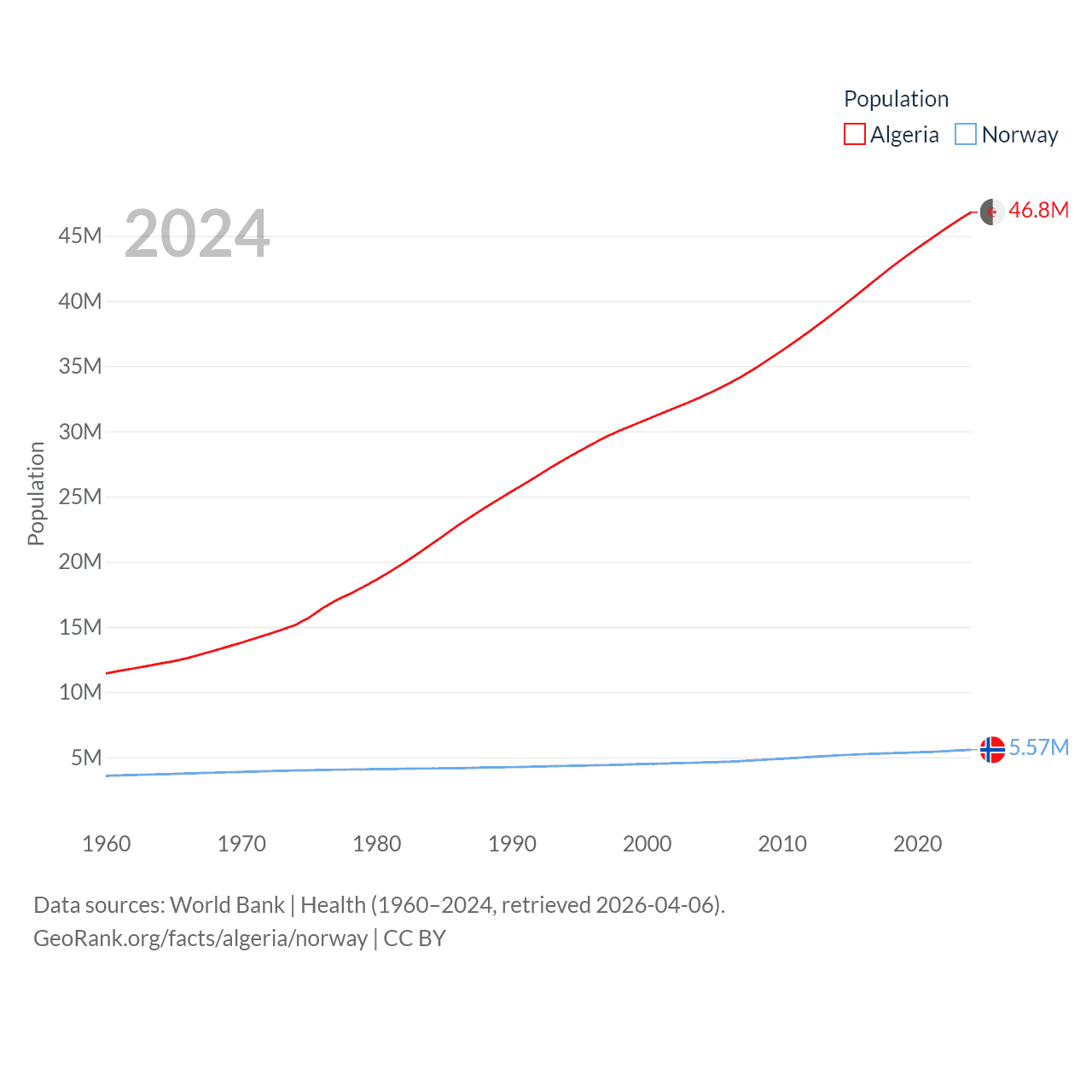 Algeria has a population of 46.8M (ranked 33/197), compared with 5.57M in Norway (ranked 118/197). Algeria's land area is 919,595 sq mi versus 140,645 sq mi for Norway (ranked 10th vs. 62nd).