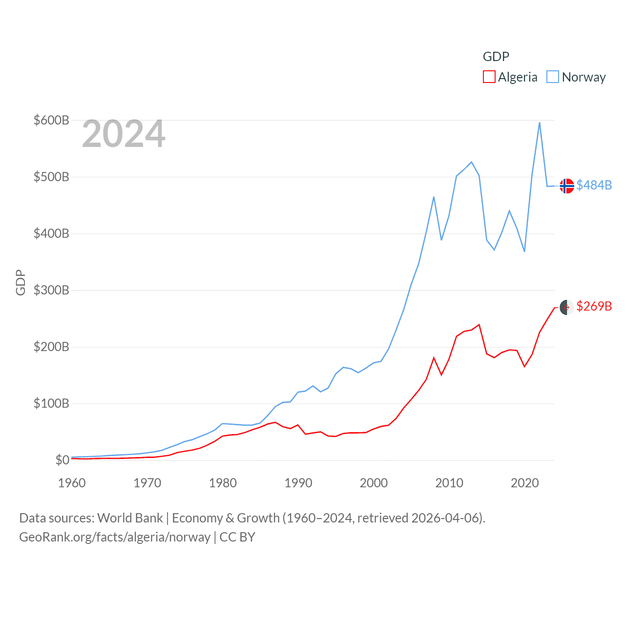 By GDP, Algeria ranks 51/197 ($269B) and Norway ranks 32/197 ($484B). By GDP per capita, Algeria ranks 114/197 ($5,753), while Norway ranks 8/197 ($86,785).