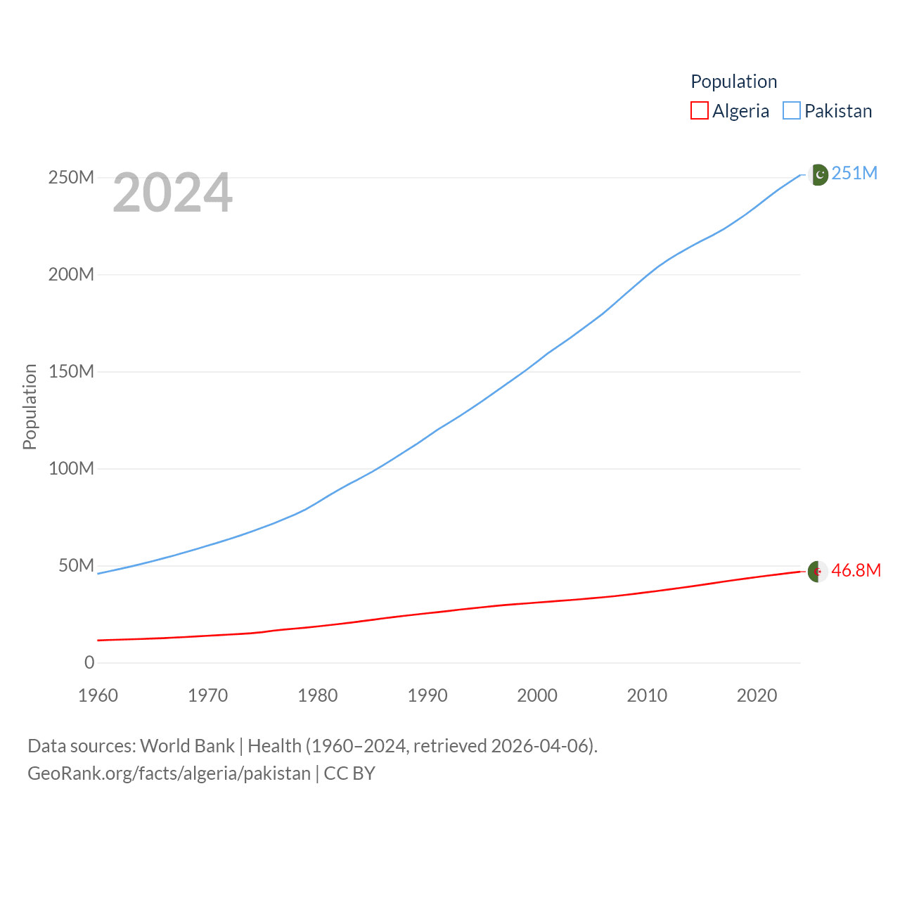 Algeria has a population of 46.8M (ranked 33/197), compared with 251M in Pakistan (ranked 5/197). Algeria's land area is 919,595 sq mi versus 297,638 sq mi for Pakistan (ranked 10th vs. 35th).