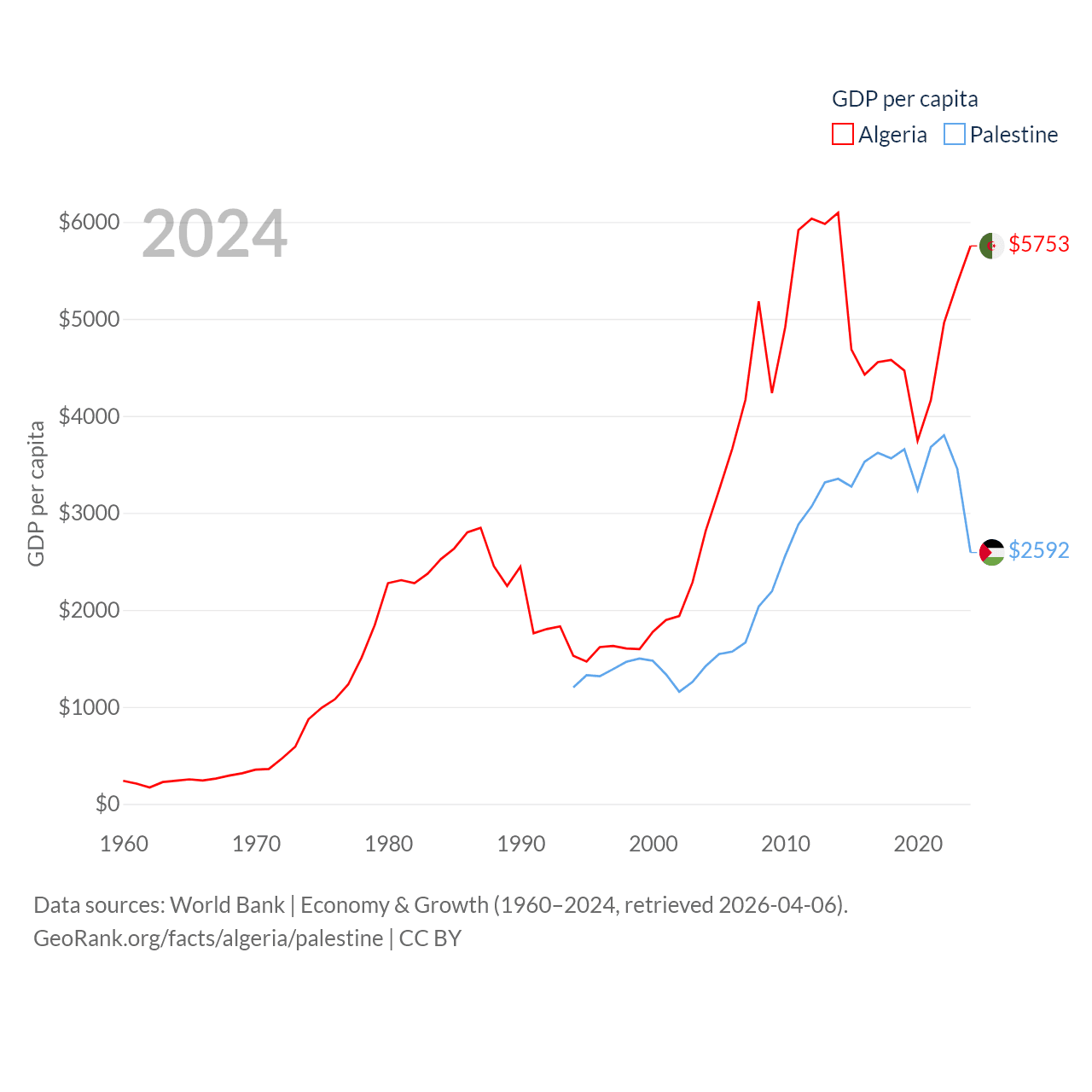 By GDP, Algeria ranks 51/197 ($269B) and Palestine ranks 146/197 ($13.7B). By GDP per capita, Algeria ranks 114/197 ($5,753), while Palestine ranks 147/197 ($2,592).